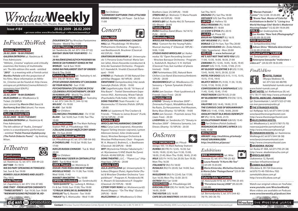 WrocławWeekly Free City Guide to Events, Music, Film, Theatre, Museum, Pubs & More Issue #184 20.02.2009 - 26.02.2009 > get more online: www.WroclawWeekly.pl > [email protected] InFocus:ThisWeek Athletic_Cinema 008 20.02.2009 - 18:00 (Friday) Galeria ENTROPIA (ul. Rzeźnicza 4) Free Admissions “Athletic_Cinema" explores and critically examines the history of multimedia art. The 8th edition this week - entitled “2013" - is a meeting with a Finnish artist Markku Peltola with the projection of his films. More information on Athletic_Cinema can be found at: http://www. entropia.art.pl/AthleticCinema/AthleticCinemaIntro.html (EN/PL) Oleś + Oleś 22.02.2009 - 19:00 (Sunday) MLECZARNIA (ul. Włodkowica 5) Ticket: 25/20PLN Jazz concert by Marcin Oleś (bass) & Bartłomiej Brat Oleś (drum). For more info: www.oles-oles.com Audio_Entropia 006 24.02.2009 - 18:00 (Tuesday) Galeria ENTROPIA (ul. Rzeźnicza 4) Free Admissions The 6th edition of “Audio_Entropia" series is a sound/poetry performance - entitled “Polski Poemat Dydaktyczny (The Polish Didactic Poem)" - by Andrzej Mitan. InTheatres Współczesny (Contemporary) Theatre (ul. Rzeźnicza 12, tel. 071/ 358-89-22) Bat Yam - Fri 19:15 Nie do pary (Speaking in Tongues) Sat, Sun & Tue 19:00 Romeo i Julia (Romeo and Juliet) Thu 19:15 Polski Theatre (ul. Zapolskiej 3, tel. 071/ 316-07-80) One (They - from Anton Chekhov’s “Three Sisters") - Sat 19:30; Sun 19:00 “Niewiarygodne Przygody M. Ko- >> For Children: “Czerwony Kapturek (The Little Red Riding Hood)" by Jiří Pauer - Sat & Sun 11:00 Concerts Friday 20th ziołkiewicza" by Wrocław Pantomime Theatre - Wed & Thu 11:00 Polski Theatre / Kameralna (ul. Świdnicka 28, tel. 071/ 316-07-52) Mayday (Run for Your Wife!) - Fri 18:00 20 najśmieszniejszych piosenek na świecie (20 Funniest Songs In The World) - Sat & Sun 19:00 Okno na Parlament (Out of Order) Wed & Thu 19:00 Komedia Theatre (pl. Teatralny 4, tel. 071/ 316-07-78 thru -80) Życie szkodzi zdrowiu (It Can Damage Your Health) - Sun 17:00 Psychoterapia czyli seks w zyciu czlowieka (Psychotherapy, or sex in human life) - Wed & Thu 20:00 Lalek (Puppet) Theatre (pl. Teatralny 4, tel. 071/ 344-76-77, 344-12-16) Wilgoć - Fri 19:00 Blask - Sat 16:00 >> For Children: Calineczka (Thumbelina) - Fri 17:30 Blask - Sat 16:00; Sun 11:00; Tue-Thu 10:00 Ad Spectatores (At The Main Railway Station PKP, ul. Piłsudskiego 103) 3 żelazne zasady mężczyzny seniora - Fri-Sun 20:00 CAPITOL Musical Theatre (ul. Piłsudskiego 67, tel. 071/789-04-00) A Chorus Line - Fri & Sat 19:00; Sun 17:00 rzecze Budda Chinaski - Tue & Wed 20:00 >> For Children: Pewien mały dzień (A Certain Little Day) - Tue & Wed 10:30 ARKA Theatre (ul. Mennicza 3) Oskar i Pani Róża (Oscar et mademoiselle Rose) - Fri 11:30; Tue 10:00; Wed 10:00, 11:45 Makbet (Macbeth) - Thu 10:00 OPERA Wrocławska (ul. Świdnicka35) “Don Quixote" by Ludwig A. Minkus Fri & Sat 19:00; Sun 17:00; Thu 19:00 “Cyrulik sewilski (Il Barbiere di Siviglia)" by G. Rossini - Tue 19:00 “Halka" by S. Moniuszko - Wed 11:00 WROCŁAW PHILHARMONIC CONCERT HALL (ul. Piłsudskiego 19) Wrocław Philharmonic Orchestra - Program: L. van Beethoven/A. Bruckner (Classical: 40/25PLN) - 19:00 ORATORIUM MARIANUM (pl. Uniwersytecki 1) Persona Grata Festival: Maria Sanner (alto), Alexis Kossenko (conductor) & Arte dei Suonatori Orchestra - Program: G.F. Haendel/A. Vivaldi (Classical//Baroque) - 19:00 ŁYKEND (ul. Podwale 37/38) Natural Dread Killaz (Reggae: 18/14PLN) - 20:00 ŚWIATOWID (Sempołowskiej 54a) Janek Samołyk (Polish: 5PLN) - 19:00 CRK (Jagiellończyka 10c/d) “10 Years of Rita Baum" - Trottel Stereodream Experience (HU) , Kormorany, Wieże Fabryk (Psychedelic/Folk/Indie: 15PLN) - 20:30 SONG THEATRE (Teatr Piosenki / ul. Mazowiecka 17) Variete (Polish: 20PLN) - 20:00 RURA (ul. Łazienna 4) The Crackers & Friends - “Tribute to James Brown" (Funk: 18/16/14PLN) - 21:00 Saturday 21st WROCŁAW PHILHARMONIC CONCERT HALL Carys Lane (soprano), Alexandra Rigazzi Tarling (mezzo-soprano), Lynton Atkinson (tenor), Giles Underwood (bass), Wrocław Baroque Orchestra & Wrocław Philharmonic Choir - Program: W. A. Mozart/J. Brahms/L. v. Beethoven (Classical: 30/20PLN) - 18:00 WFF (Wytwórnia Filmów Fabularnych / ul. Wystawowa 1) KNŻ (Kazik Na Żywo) (Polish: 45/40/35PLN) - 19:00 SONG THEATRE L.U.C. - “Planet Luc" (HipHop/Jazz: 25PLN) - 20:00 Sunday 22nd AULA LEOPOLDINA (pl. Uniwersytecki 1) Łukasz Długosz (flute), Agata Kielar (flute) & Wrocław Chamber Orchestra “Leopoldinum" - Program: K. Penderecki/W. A. Mozart /D.Szostakowicz/F. Doppler (Classical: 25/15PLN) - 18:00 CZTERY PORY ROKU (ul. Mickiewicza 62) Marek Długosz - “On The Way" (Guitar: 20PLN) - 18:00 MLECZARNIA (ul. Włodkowica 5) Oleś Contact: Wrocław Tourist Information Center, Rynek 14, 50-101 Wrocław, tel. (+48 71) 344 31 11 Brothers (Jazz: 25/20PLN) - 19:00 STREFA WZ (pl. Wolności 7) Maria Peszek (Polish: 40/35PLN) - 19:00 NISKIE ŁĄKI (ul. Ruska 46c) Et Tumason (IS) (Blues) - 20:00 Tuesday 24th RURA HooDoo Band (Blues: 16/14/12 PLN) - 20:30 Wednesday 25th WROCŁAW PHILHARMONIC CONCERT HALL “Concert for the Young Public: Musical Journey 2" (Classical: 10PLN) 9:00, 11:00 STUDIO RADIO WROCŁAW (ul. Karkonoska 10) “Open Recording Session" - Wrocław Baroque Orchestra - Program: L. Koželuh/A. Rejcha/J. V. H. Voříšek (Classical: Free, but number of places limited) - 19:00 CRK Portmanteau (DE), Natural Born Chillers Live Band (Electronica/Ambient: 12PLN) - 20:00 WŁODKOWICA 21 (ul. Włodkowica 21) Sensorry + Tymon Tymański (Polish) 20:00 RURA Jam Session - Piotr Łyszkiewicz & Friends (Jazz: Free) - 20:30 Thursday 26th ŁYKEND “Shnaty in Wrocław 2009" Znienacka Project, Mizia&Mizia Band, Na Razie, Za Horyzontem, Pod Masztem, Betty Blue (Shanty: 15/10PLN) - 19:00 RURA Jam Session - Przemek Jarosz Trio (Jazz: Free) - 20:30 LIVERPOOL (ul. Świdnicka 37) “Shnaty in Wrocław 2009" - Orkiestra Samanta, Les Dieses (Shanty: 15/10PLN) - 20