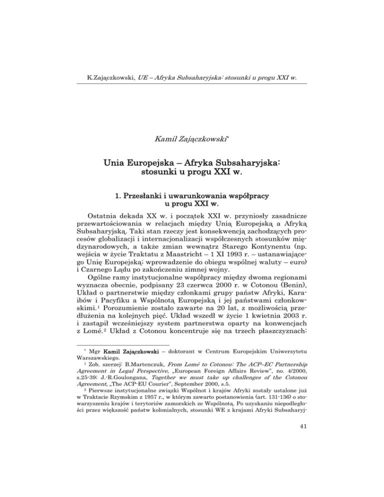 K.Zajączkowski, UE – Afryka Subsaharyjska: stosunki u progu XXI w. Kamil Zajączkowski * Unia Europejska – Afryka Subsaharyjska: stosunki u progu XXI w. 1. Przesłanki i uwarunkowania współpracy u progu XXI w. Ostatnia dekada XX w. i początek XXI w. przyniosły zasadnicze przewartościowania w relacjach między Unią Europejską a Afryką Subsaharyjską. Taki stan rzeczy jest konsekwencją zachodzących procesów globalizacji i internacjonalizacji współczesnych stosunków międzynarodowych, a także zmian wewnątrz Starego Kontynentu (np. wejścia w życie Traktatu z Maastricht – 1 XI 1993 r. – ustanawiającego Unię Europejską; wprowadzenie do obiegu wspólnej waluty – euro) i Czarnego Lądu po zakończeniu zimnej wojny. Ogólne ramy instytucjonalne współpracy między dwoma regionami wyznacza obecnie, podpisany 23 czerwca 2000 r. w Cotonou (Benin), Układ o partnerstwie między członkami grupy państw Afryki, Karaibów i Pacyfiku a Wspólnotą Europejską i jej państwami członkowskimi. 1 Porozumienie zostało zawarte na 20 lat, z możliwością przedłużenia na kolejnych pięć. Układ wszedł w życie 1 kwietnia 2003 r. i zastąpił wcześniejszy system partnerstwa oparty na konwencjach z Lomé. 2 Układ z Cotonou koncentruje się na trzech płaszczyznach: * Mgr Kamil Zajączkowski – doktorant w Centrum Europejskim Uniwersytetu Warszawskiego. 1 Zob. szerzej: B.Martenczuk, From Lomé to Cotonou: The ACP–EC Partnership Agreement in Legal Perspective, „European Foreign Affairs Review”, no. 4/2000, s.25-39; J.-R.Goulongana, Together we must take up challenges of the Cotonou Agreement, „The ACP-EU Courier”, September 2000, s.5. 2 Pierwsze instytucjonalne związki Wspólnot i krajów Afryki zostały ustalone już w Traktacie Rzymskim z 1957 r., w którym zawarto postanowienia (art. 131-136) o stowarzyszeniu krajów i terytoriów zamorskich ze Wspólnotą. Po uzyskaniu niepodległości przez większość państw kolonialnych, stosunki WE z krajami Afryki Subsaharyj- 41 Studia Europejskie, 4/2006 handlowej, rozwojowej oraz politycznej, przy uwzględnieniu wzajemnych współzależności między wymianą handlową, zapewnieniem zrównoważonego rozwoju oraz dialogiem politycznym. 3 Aktywna polityka Unii Europejskiej wobec regionu Afryki Subsaharyjskiej u progu XXI w. wynika z interesów politycznych (szczególnie po 11 września 2001 r. Afryka stanowi istotny element w kontekście bezpieczeństwa międzynarodowego, walki z terroryzmem) i ekonomicznych oraz z tradycji i więzów historycznych poszczególnych państw UE z dawnymi koloniami. Ma ona także służyć umacnianiu pozycji i roli Unii jako globalnego aktora stosunków międzynarodowych (stąd, m.in., Unia Europejska dąży do zespolenia trzech elementów jej stosunków zewnętrznych, tj. polityki zagranicznej i handlowej oraz pomocy rozwojowej). Państwa UE podkreślają, że konflikty polityczne i etniczne w Afryce, pogłębienie się nędzy i inne tragiczne wydarzenia na tym kontynencie stanowią w dłuższej perspektywie zagrożenie dla bezpieczeńskiej przekształcono w stosunki umowne, czego wyrazem były Konwencje z Yaoundé z 1963 r. i z 1969 r., a następnie konwencje Lomé I (1975 r.), Lomé II (1979 r.), Lomé III (1984 r.) i Lomé IV (1989 r.). Sygnatariuszami konwencji z Lomé, poza krajami Afryki Subsaharyjskiej, zostały również kraje z Karaibów i Pacyfiku, występując jako jednolita grupa państw Afryki, Karaibów i Pacyfiku. Grupa państw AKP powstała na podstawie tzw. porozumienia z Georgetown z 1975 r. Dokument ten podpisali przedstawiciele 46 krajów. Obecnie grupa AKP liczy 79 krajów. Niektóre źródła podają liczbę 78 ze względu na wątpliwość co do statusu Kuby. Rada Ministrów AKP na spotkaniu 14 grudnia 2000 r. w Brukseli przyjęła rezolucję, w której zdecydowano o przyjęciu Kuby do grupy państw AKP. Rada zastrzegła jednak, iż Hawana nie podpisze porozumienia z Cotonou. Związane to było ze sprzeciwem Unii Europejskiej. Należy zaznaczyć także, iż mimo wielu cech wspólnych kraje AKP nigdy nie stanowiły monolitu, a powstanie grupy na mocy układu z 1975 r. było w dużym stopniu efektem dążenia małych krajów karaibskich i z Pacyfiku do zjednoczenia się wokół dysponujących większą siłą przetargową krajów afrykańskich i uzyskania podobnych jak one korzyści ze współpracy z EWG. Zob. szerzej: K.Zajączkowski, The Relations Between the European Union and the Countries of Sub-Saharan Africa Following the End of the Cold War, „Hemispheres. Studies on Cultures and Societes”, no. 20/2005, Polish Academy of Sciences, s.93-99. 3 Zgodnie z Układem podstawowym, jego celem jest zmniejszenie ubóstwa oraz zapewnienie rozwoju społeczno-gospodarczego państw AKP. Wskazuje się również na znaczenie współpracy politycznej, poruszając przy tym takie kwestie jak: budowa środków wzajemnego zaufania, zapobieganie konfliktom i migracjom. Jedną z cech Układu z Cotonou jest nowe podejście do zarządzania projektami pomocowymi. Opiera się ono na ocenie potrzeb i zdolności poszczególnych państw AKP do wykorzystania pomocy i dostosowanych do tego środków finansowych, a nie jak dotychczas na określonych sztywnych kryteriach, takich jak PKB na 1 mieszkańca. Zob. Implementing the New ACP-EU Agreement, ECDPM, Maastricht 2000. 42 K.Zajączkowski, UE – Afryka Subsaharyjska: stosunki u progu XXI w. stwa europejskiego, m.in. poprzez nielegalną migrację do państw wyżej rozwiniętych, rozwój przestępczości zorganizowanej czy też powstawanie napięć na tle różnic społeczno-cywilizacyjno-kulturowych. Narasta jednocześnie świadomość, że rządy i elity afrykańskie nie są w stanie przełamać tych kryzysów samodzielnie. Ich rozwiązanie staje się więc wyzwaniem dla całej wspólnoty międzynarodowej, w tym dla UE. Na początku trzeciego tysiąclecia powstały uwarunkowania, ułatwiające realizację europejskiej polityki wobec Afryki