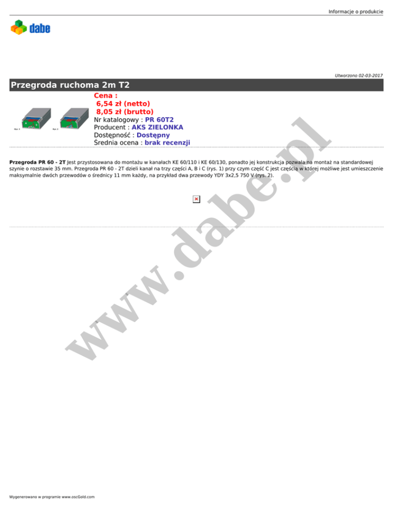 Informacje o produkcie Utworzono 02-03-2017 Przegroda ruchoma 2m T2 Nr katalogowy : PR 60T2 Producent : AKS ZIELONKA Dostępność : Dostępny Średnia ocena : brak recenzji pl Cena : 6,54 zł (netto) 8,05 zł (brutto) w w w .d ab e. Przegroda PR 60 - 2T Jest przystosowana do montażu w kanałach KE 60/110 i KE 60/130, ponadto jej konstrukcja pozwala na montaż na standardowej szynie o rozstawie 35 mm. Przegroda PR 60 - 2T dzieli kanał na trzy części A, B i C (rys. 1) przy czym część C jest częścią w której możliwe jest umieszczenie maksymalnie dwóch przewodów o średnicy 11 mm każdy, na przykład dwa przewody YDY 3x2,5 750 V (rys. 2). Wygenerowano w programie www.oscGold.com