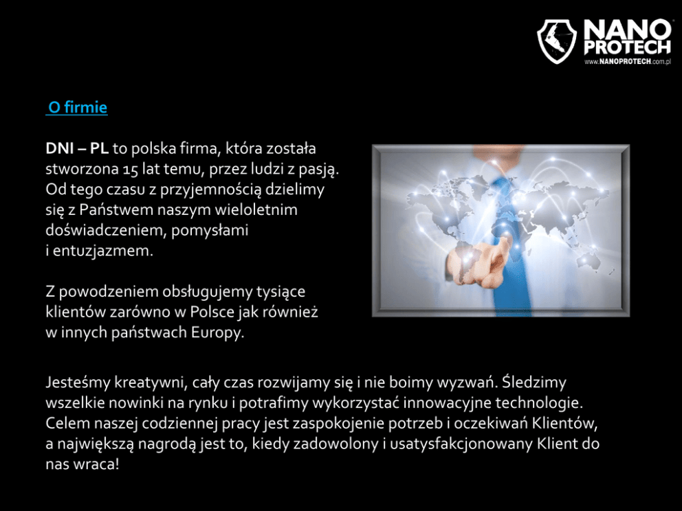 O firmie DNI – PL to polska firma, która została stworzona 15 lat temu, przez ludzi z pasją. Od tego czasu z przyjemnością dzielimy się z Państwem naszym wieloletnim doświadczeniem, pomysłami i entuzjazmem. Z powodzeniem obsługujemy tysiące klientów zarówno w Polsce jak również w innych państwach Europy. Jesteśmy kreatywni, cały czas rozwijamy się i nie boimy wyzwań. Śledzimy wszelkie nowinki na rynku i potrafimy wykorzystać innowacyjne technologie. Celem naszej codziennej pracy jest zaspokojenie potrzeb i oczekiwań Klientów, a największą nagrodą jest to, kiedy zadowolony i usatysfakcjonowany Klient do nas wraca! NANOTECHNOLOGIA w pigułce: Nanotechnologia to obecnie jedna z najnowocześniejszych dziedzin nauki. Jej sukces i rozwój polega przede wszystkim na tworzeniu rozmaitych struktur o rozmiarach nanometrycznych, czyli na poziomie pojedynczych atomów i cząsteczek. 1 nanometr (1 nm) to 1 miliardowa część metra – dla porównania włos ludzki ma grubość 80 000 nm. Ze względu na niewielkie rozmiary nanocząsteczki docierają w miejsca dotąd niedostępne, tworząc niewidoczną i niezwykle mocną powłokę ochronną.To prawdziwa rewolucja we wszystkich dziedzinach życia, ponieważ stwarza nieograniczone możliwości w opracowaniu nowych produktów i procesów. O Produktach Posiadamy w swojej ofercie linię produktów o niespotykanych dotąd właściwościach i skuteczności, które spełniają najwyższej, jakości standardy. Są to produkty o wyjątkowych właściwościach ochronnych i antykorozyjnych z zastosowaniem w szerokiej gamie segmentów przemysłowego i gospodarczego użytkowania. Produkty NANOPROTECH w 100% wypierają wilgoć tworząc cienką, doskonale chroniącą nanopowłokę. Realnie i na długo przedłużają żywotność rożnego rodzaju sprzętów czy urządzeń. Mają zastosowanie wszędzie tam gdzie istnieje kontakt z wilgocią. Na rynku polskim obecnie oferujemy następujące linie produktów: Home & Garden przeznaczoną dla domu i ogrodu Auto Moto przeznaczoną dla samochodów, motocykli, przyczep campingowych oraz ciężkiego sprzętu transportowego i budowlanego Bicycle przeznaczoną dla rowerów. ZASADA DZIAŁANIA BEZ OCHRONY WODA PRZENIKA I SPRZYJA KOROZJI ŚRODEK NANOSIMY NAWET NA MOKRĄ POWIERZCHNIĘ, PRZENIKA W STRUKTURĘ MATERIAŁU I WYPIERA WILGOĆ W 100% ZAPEWNIA SKUTECZNĄ I NIEWIDOCZNĄ OCHRONĘ NA MINIMUM 1 ROK NANOPROTECH DLA DOMU I OGRODU DŁUGOTRWAŁA OCHRONA PRZED KOROZJĄ Produkt wypiera wilgoć w 100% doskonale zabezpieczając metalowe powierzchnie przed powstawaniem korozji. Niezastąpiony do ochrony urządzeń i mechanizmów ruchomych zarówno w domu, jak i w ogrodzie. Osłania metale i części maszyn w trakcie ich użytkowania, przechowywania jak również w transporcie. Efekt widoczny natychmiastowo i na realnie długi czas. Zastosowanie: sprzęt ogrodniczy i rolniczy wszelkiego rodzaju, zamki, zawiasy, elementy mocujące, śruby, nakrętki, zawory, kosiarki ogrodowe, prowadnice, traktory, łożyska, pompy, trymery benzynowe, taczki, pługi, siewniki. w 100% wypiera wilgoć i zatrzymuje korozję zabezpiecza przed agresywnymi czynnikami zewnętrznymi chroni w zakresie temp. od -80°C do + 140°C przedłuża okres żywotności części metalowych nie wymaga wcześniejszej obróbki powierzchni IZOLACJA ELEKTRYCZNA W PŁYNIE Niezawodnie chroni przed wilgocią, utlenianiem i zwarciem urządzenia elektryczne i elektroniczne, używane w domu oraz ogrodzie. Doskonale izoluje oraz uszczelnia nawet w trudno dostępnych miejscach np. izolacja kabli, połączeń czy izolacja kontaktów. Dzięki innowacyjnej technologii niewidoczna nanopowłoka wielokrotnie przedłuża okres eksploatacji sprzętów, w efekcie mogą one działać dłużej i sprawniej nawet w bezpośrednim kontakcie z wodą. Zastosowanie: urządzenia elektryczne i ogrodowe wszelkiego rodzaju, wiertarka, wkrętarka, piła elektryczna, akumulatory, przedłużacze, pompa elektryczna, generatory, piloty, trymer elektryczny, latarnie i systemy oświetleniowe, sekator, sprzęt spawalniczy, elektryczna kosiarka ogrodowa, kontakty i łączniki różnych rodzajów, dmuchawa powietrzna, bezpieczniki, silniki elektryczne. w 100% wypiera wilgoć i zatrzymuje korozję przedłuża okres eksploatacji elektroniki i elektryki bezdemontażowy remont elektryki uszkodzonej przez wilgoć skutecznie zabezpiecza przed zwarciem i upływem prądu sprzyja oczyszczaniu zaśniedziałych styków SMAR PENETRUJĄCY NOWEJ GENERACJI Produkt pozwala na maksymalny stopień ochrony i smarowania mechanizmów, oraz urządzeń znajdujących się w domu i ogrodzie. Smar pokrywa powierzchnię niewidoczną warstwą nanopowłoki, która wydłuża żywotność urządzeń i zabezpiecza je przed zużywaniem. Dzięki doskonałym właściwościom smarnym zapewnia właściwe funkcjonowanie, niezależnie od warunków w jakich są eksploatowane. Nie traci swoich właściwości przy dużych obciążeniach i w zakresie temperatury od -80°C do + 140°C Zastosowanie: zamki, zawiasy, łańcuchowe napędy i mechanizmy, elementy mocujące, śruby, nakrętki, zawory, gumowe uszczelniacze, mechanizmy ślizgowe, prowadnice, mechanizmy ruchome. łożyska. CERTYFIKATY zapobiega skrzypieniu zawiasów i połączeń przedłuża okres eksploatacji części oraz sprzętu uwalnia zardzewiałe lub zaklinowane mechanizmy wysoka zdolność przenikania chroni w zakresie temp. od -80°C do + 140°C Korzyści wynikające z dystrybucji produktów NANOPROTECH wysokojakościowy, innowacyjny i bezkonkurencyjny produkt reklama poprzez umieszczenie danych kontaktowych sprzedawcy na stronie www.nanoprotech.com.pl efektywne wykorzystanie powierzchni handlowej video stojak jako nowoczesna forma reklamy i sprzedaży Video stojak: Dodatkowy pracownik w Twojej firmie – „Video stojak” - sam sprzedaje produkty. Umieszczony w widocznym miejscu wzbudza zainteresowanie, a poprzez emitowanie filmów instruktażowych zachęca do zakupu.