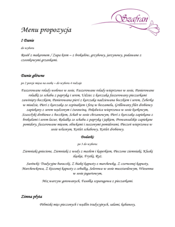 Menu propozycja I Danie do wyboru Rosół z makaronem / Zupa krem – z brokułów, grzybowy, jarzynowy, podawane z czosnkowymi grzankami. Danie główne po 2 porcje mięsa na osobę – do wyboru 4 rodzaje Faszerowane rolady wołowe w sosie, Faszerowane rolady wieprzowe w sosie, Panierowane roladki ze schabu z papryką i serem, Udziec z kurczaka faszerowany pieczarkami zawinięty boczkiem, Panierowana pierś z kurczaka nadziewana boczkiem i serem, Żeberka w miodzie, Pierś z kurczaka ze szpinakiem i fetą w beszamelu, Grillowany filet drobiowy zapiekany z serem wędzonym i żurawiną, Polędwica wieprzowa w sosie kurkowym, Szaszłyki drobiowe z boczkiem, Schab w sosie chrzanowym, Pierś z kurczaka zapiekana z brokułami i serem lazur, Roladka ze schabu z papryką i jajkiem, Prowansalskie zapiekane pomidory, faszerowane mięsem, oliwkami i suszonymi pomidorami, Pieczeń wieprzowa w sosie własnym, Kotlet schabowy, Kotlet drobiowy. Dodatki: po 3 do wyboru: Ziemniaki gniecione, Ziemniaki z wody z masłem i koperkiem, Pieczone ziemniaki, Kluski śląskie, Frytki, Ryż. Surówki: Tradycyjne buraczki, Z białej kapusty z marchewką, Z czerwonej kapusty, Marchewkowa, Z kiszonej kapusty z cebulką, Selerowa w sosie musztardowym, Wiosenna w sosie jogurtowym, Mix warzyw gotowanych, Fasolka szparagowa z pieczarkami. Zimna płyta Półmiski mięs pieczonych i wędlin tradycyjnych, salami, kabanosy, Deski różnego rodzaju serów, 2 sałatki – Tradycyjna jarzynowa, Cezara z boczkiem i grzankami, Sycylijska z makaronem, brokułami i kukurydzą, Hawajska z ananasem i szynką, Chłopska z ziemniakami i pieczoną kiełbaską, Makaronowa sałatka z tuńczykiem, Ryżowa sałatka z kurczakiem, Włoska z makaronem, salami i oliwkami, Grecka, Tymbaliki drobiowe, 2 Rodzaje śledzi i pikle lub Różnego rodzaju przekąski na cieście francuskim i zawijana tortilla na zimno, Pieczywo. Napoje Kawa, herbata, woda niegazowana, soki i napoje gazowane – bez ograniczeń. Cena 80,00-90,00zł (cena uzależniona od wyboru mięs do dania głównego) Dodatkowo do powyższego menu można dodać: Kolacja przykładowo: Soczysta pieczeń wieprzowa w sosie własnym z pieczonymi ziemniakami i surówką z kiszonej kapusty, Szaszłyk drobiowy z boczkiem podawany z ryżem i warzywami z pary, Pierś z kurczaka faszerowana pieczarkami, podawane z fasolką szparagową zawijaną boczkiem i ziemniakami z wody Filet z łososia w sosie maślano – cytrynowym podawany z dzikim ryżem i grzybami w śmietanie, Rolada wieprzowa nadziewana mięsem i papryką, podawana z zapiekaną warzywną lasagnią i francuskimi ziemniakami dauphinois. …………………………………………………………+20,00-28,00zł/os Cena uzależniona od wyboru Barszcz z krokietem ……….………………….…….…………..+10,00zł/os Gulasz/ bogracz ……………………………………….………+ 16,00 zł/os Owoce sezonowe i egzotyczne na patery…………………………+7,00 zł/os Zimna płyta extra: przekąski Szefa kuchni + owoce morza Mix z owoców morza – krewetki na dwa sposoby, kalmary w cieście Sałatka koktajlowa z krewetkami, Rogaliki z serem pleśniowym i gruszką, Jajka faszerowane, Ślimaczki z tortilli, Tościki z szynką parmeńską, Tościki z pomidorem i mozzarellą w sosie balsamicznym, Pieczone śliwki zawijane boczkiem, Mix przekąsek na cieście francuskim……………………………….……………….+ 15-30,00zł Cena ustalana indywidualnie w oparciu o wybór przekąsek i owoców morza Przystawka Przykładowo: Łosoś wędzony podawany z kremowym musem z avocado, zielonym mixem sałat i chrupiącym tostem, Pieczony pasztet z dziczyzny z podawany z konfiturą z czerwonej cebuli, Panierowany Camembert podawany z zieloną sałatką z rukolą i prażonym słonecznikiem, w sosie balsamicznym Sałatka Cezara podawana ze smażonym boczkiem i chrupiącymi grzankami …………………………………………………………..…… …+ 7,00 zł/os Deser przykładowo: Szarlotka na ciepło z lodami waniliowymi i karmelizowanym jabłkiem, Poire Belle Hélène - gotowana w syropie waniliowym gruszka, podawana z lodami śmietankowymi i sosem czekoladowym, Puszyste ciastko owocowe z lodami czekoladowymi i sałatką owocową, Ciastko czekoladowe z lodami śmietankowymi i karmelizowanym jabłkiem ……………………………………………………..……. + 10-12,00 zł/os