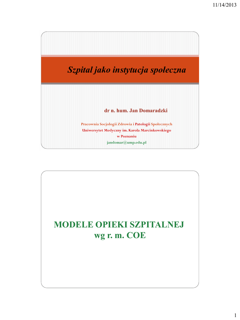 11/14/2013 Szpital jako instytucja społeczna dr n. hum. Jan Domaradzki Pracownia Socjologii Zdrowia i Patologii Społecznych Uniwersytet Medyczny im. Karola Marcinkowskiego w Poznaniu [email protected] MODELE OPIEKI SZPITALNEJ wg r. m. COE 1 11/14/2013 Wymiar Modele opieki nad pacjentami opiekuńczy klasyczny Rehabilitacyjny Prognoza przebiegu choroby Nieuleczalna Cel wyrażany oficjalnie Pokrzepienie Opieka Przywrócenie sprawności Leczenie Sporadyczne Centralne Uzupełniające Rola chorego Trwała Przejściowa Motywacja pacjenta Posłuszeństwo wobec przepisów instytucji Posłuszeństwo wobec „rozkazów” lekarzy Osiągnięcie niezależności Wynikający z powyższego model instytucjonalny Instytucja totalna Szpital ogólny (choroby ostre) Ośrodek rehabilitacyjny Odwracalna Zmienna Przerywana PSYCHOSPOŁECZNE SKUTKI HOSPOTALIZACJI. Szpital jako źródło stresu 2 11/14/2013 ETAP 1. DIAGNOZA - świadomość poważnej choroby, - przekonanie, że jest się chorym na raka, - lęk przed śmiercią, - obawy związane z możliwością zmian w obrazie ciała, - obawa o utratę znaczącego narządu, - lęk o utratę ról społecznych, - lęk przed warunkami szpitalnymi. ETAP 2. HOSPITALIZACJA 1. brak lub niedostateczna informacja, - na co się choruje (nieznajomość diagnozy), - brak pewności, co do diagnozy, - o lekach, ich działaniu i skutkach ubocznych - organizacja szpitala, - organizacja dnia, - lekarz prowadzący - termin wypisu, - o efektach stosowanego leczenia, - o terminie i metodach leczenia - - „leżenie i czekanie”, 2. przyjęcie do szpitala, 3. nieotrzymanie środków przeciwbólowych, gdy się ich potrzebuje, 4. bycie otoczonym dziwnymi urządzeniami, 5. konieczność używania szpitalnych ubrań, 6. spanie w obcym łóżku, 7. jedzenie posiłków w wyznaczonych porach (innych niż w domu), 8. brak intymności: konieczność dzielenia sali z nieznaną osobą, 9. poczucie osamotnienia: brak osoby, z którą można przedyskutować swój stan, 10. operacja, skierowanie na dodatkowe konsultacje, 11. depersonalizacja: traktowanie przedmiotowe 12. inni chorzy i umierający pacjenci, 13. niezrozumiała terminologia, 14. konieczność podporządkowania 15. postawa paternalistyczna personelu. 3 11/14/2013 ETAP 3. WYPIS - instytucjonalizacja, - lęk przed powrotem do ról społecznych, - lęk przed zakażeniem (choroby jatrogenne), - lęk przed śmiercią, - lęk przed piętnem. Wpływ cech społeczno-demograficznych na proces leczenia CHOROBA PACJENT płeć wiek wykształcenie dochód pochodzenie społeczne miejsce zamieszkania wyznanie pochodzenie etniczne zawód stan cywilny przyczyna choroby 4 11/14/2013 MODELE REALCJI PERSONEL – PACJENT TALCOTT PARSONS – PROFESJONLIŚCI I LAICY To aktorzy, którzy grają swe role społeczne, które są względem siebie komplementarne. Obie związane z pewnymi społecznymi oczekiwaniami, zawierającymi zarówno prawa, jak i obowiązki. Podkreślał ich wzajemne porozumienie. Pacjent (rola chorego) Lekarz (rola zawodowa) Powinności = obowiązki 1. Chęć wyzdrowienia (wola, motywacja wyzdrowienia) 2. Okazywanie zaufania lekarzowi i akceptacja jego umiejętności zawodowych 1. Działanie w celu zapewnienia pacjentowi opieki (kierowanie współpracą, wykonywanie samodzielnych czynności) 2. Przestrzeganie etyki lekarskiej 3. Stałe doskonalenie kwalifikacji zawodowych i ich profesjonalne wykorzystywanie 4. Obiektywność podejścia i emocjonalna neutralność; 5. Zawodowa samokontrola i samokrytycyzm Przywileje = prawa 1. Zwolnienie z wykonywania normalnych obowiązków 1. Ingerencja w intymne i poufne sfery życia pacjenta (ról społecznych i zadań) 2. Niezależność podejmowania decyzji 2. Zwolnienie z odpowiedzialności za stan chorobowy 3. Posiadanie autorytetu zawodowego 5 11/14/2013 ELIOT FREIDSON DYLEMATY I KONFLIKTY Podkreślał „zderzenie perspektyw” obu stron. To dwa inne światy, różne interesy, oczekiwania i stany wiedzy, co sprawia, że istnieję między nimi nieustanny, potencjalny konflikt. Jego nasilenie zależy zaś o różnych czynników sytuacyjnych, wartości i oczekiwań obu uczestników i sytuacji, w jakiej się znajdują. To zupełnie dwie różne „kultury”, środowiska, a stąd i wartości i priorytety. Różnice w podejściu do problemu medycznego – obiektywna (medyczna) vs subiektywna. Nieuwzględnianie lub ignorowanie przez lekarza objawów zgłaszanych przez pacjenta lub rutynowego podchodzenia do wszystkich pacjentów. 6