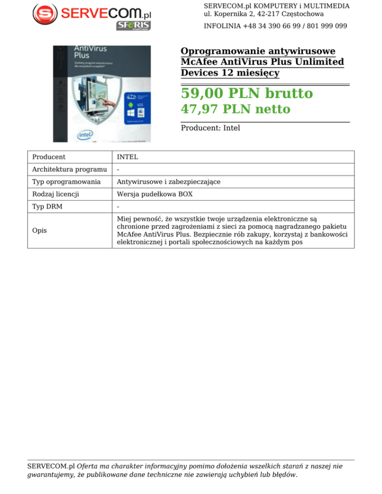 SERVECOM.pl KOMPUTERY i MULTIMEDIA ul. Kopernika 2, 42-217 Częstochowa INFOLINIA +48 34 390 66 99 / 801 999 099 Oprogramowanie antywirusowe McAfee AntiVirus Plus Unlimited Devices 12 miesięcy 59,00 PLN brutto 47,97 PLN netto Producent: Intel Producent INTEL Architektura programu - Typ oprogramowania Antywirusowe i zabezpieczające Rodzaj licencji Wersja pudełkowa BOX Typ DRM - Opis Miej pewność, że wszystkie twoje urządzenia elektroniczne są chronione przed zagrożeniami z sieci za pomocą nagradzanego pakietu McAfee AntiVirus Plus. Bezpiecznie rób zakupy, korzystaj z bankowości elektronicznej i portali społecznościowych na każdym pos SERVECOM.pl Oferta ma charakter informacyjny pomimo dołożenia wszelkich starań z naszej nie gwarantujemy, że publikowane dane techniczne nie zawierają uchybień lub błędów.