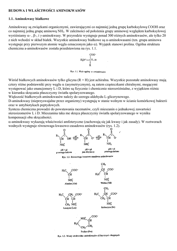 BUDOWA I WŁAŚCIWOŚCI AMINOKWASÓW 1.1. Aminokwasy białkowe Aminokwasy są związkami organicznymi, zawierającymi co najmniej jedną grupę karboksylową COOH oraz co najmniej jedną grupę aminową NH2. W zależności od położenia grupy aminowej względem karboksylowej wyróżniamy α- , β-, i γ-aminokwasy. W przyrodzie występuje ponad 300 różnych aminokwasów, ale tylko 20 z nich wchodzi w skład białek. Wszystkie aminokwasy białkowe są α-aminokwasami (tzn. grupa aminowa występuje przy pierwszym atomie węgla oznaczonym jako α). Wyjątek stanowi prolina. Ogólna struktura chemiczna a-aminokwasów została przedstawiona na rys. 1.1. Wśród białkowych aminokwasów tylko glicyna (R = H) jest achiralna. Wszystkie pozostałe aminokwasy mają cztery różne podstawniki przy węglu α (asymetrycznym), są zatem cząsteczkami chiralnymi, mogącymi występować jako enancjomery L i D, które są fizycznie i chemicznie nierozróżnialne, z wyjątkiem różnic w kierunku skręcania płaszczyzny światła spolaryzowanego. Większość białkowych aminokwasów należy do szeregu aldehydu L-glicerynowego. D-aminokwasy (nieprzyswajalne przez organizmy) występują w stanie wolnym w ścianie komórkowej bakterii oraz w antybiotykach peptydowych. Synteza chemiczna prowadzi do powstawania racematów, czyli mieszanin o jednakowej zawartości stereoizomerów L i D. Mieszanina taka me skręca płaszczyzny światła spolaryzowanego w wyniku kompensacji obu skręcalności. α-aminokwasy wykazują właściwości amfoteryczne (zachowują się jak kwasy i jak zasady). W roztworach wodnych występuje równowaga kwasowo-zasadowa aminokwasów (rys. 1.2). Sumaryczny ładunek cząsteczki aminokwasu zależy od pH środowiska. Wartość pK grup ulegających dysocjacji można wyznaczyć z krzywej miareczkowania. W punkcie izoelektrycznym pI dla danego aminokwasu maksymalna liczba jego cząsteczek występuje w postaci jonów obojnaczych (sumaryczny ładunek równa się zeru). Wartości pI dla większości aminokwasów białkowych są bliskie 6. Wyższe pI mają aminokwasy zasadowe: arginina — 10,76; histydyna — 7,59 i lizyna — 9,74, natomiast aminokwasy kwasowe charakteryzują się mniejszymi wartościami pI: kwas asparaginowy — 2,77; kwas glutaminowy — 3,22. Stosuje się różne kryteria klasyfikacji aminokwasów. Biorąc pod uwagę budowę łańcuchów bocznych, aminokwasy można podzielić na: alifatyczne obojętne, alifatyczne hydroksyaminokwasy, siarkowe, zasadowe, kwasowe i ich monoamidy oraz aminokwasy z pierścieniem aromatycznym. Poza wymienionymi grupami podziału znajduje się pozbawiona łańcucha bocznego glicyna. 1.1.1. Aminokwasy alifatyczne obojętne Do tej grupy należą: alanina, walina, leucyna, izoleucyna oraz prolina, których wzory strukturalne przedstawione są na rys. 1.3. Aminokwasy te zawierają alifatyczny, niepolarny, a zatem hydrofobowy łańcuch boczny (R). 1.1.2. Alifatyczne hydroksyaminokwasy Alifatyczne hydroksyaminokwasy to seryna i treonina (rys. 1.4). Ich łańcuchy boczne są neutralne (pozbawione ładunku) i polarne dzięki obecności grupy hydroksylowej. 1.1.3. Aminokwasy siarkowe Do aminokwasów siarkowych (rys. 1.5) należą: cysteina (zawierająca grupę tiolową SH) i metionina (zawierająca grupę tiometylową SCH3). Cysteina pod wpływem łagodnych czynników utleniających dimeryzuje do cystyny (Cys)2 z utworzeniem wiązania disiarczkowego. 1.1.4. Aminokwasy zasadowe Aminokwasami zasadowymi (rys. 1.6) są: lizyna (zawierająca na końcu łańcucha bocznego grupę aminową), arginina (zawierająca grupę guanidynową) oraz histydyna (mająca silnie zasadowy pierścień imidazolowy). 1.1.5. Aminokwasy kwasowe Do aminokwasów kwasowych (rys. 1.7) zalicza się kwas asparaginowy i kwas glutaminowy. W łańcuchach bocznych tych aminokwasów znajduje się dodatkowa grupa karboksylowa. 1.1.6. Monoamidy kwasu asparaginowego i glutaminowego Amidami kwasów asparaginowego i glutaminowego są asparagina i glutamina. 1.1.7. Aminokwasy z pierścieniem aromatycznym Do tej grupy należą aminokwasy zawierające podstawnik aromatyczny (rys. 1.9), czyli: fenyloalanina, tyrozyna i tryptofan. Obecność pierścienia aromatycznego warunkuje zdolność do pochłaniania promieniowania UV w zakresie 260-290 nm (właściwość ta jest wykorzystywana w metodach ilościowego oznaczania białka). Tyrozyna zawiera dodatkowo grupę hydroksylową w pierścieniu. Tryptofan jest aminokwasem heteroaromatycznym. 1.2. Wykonanie ćwiczenia 1.2.1. Reakcje ogólne aminokwasów Najbardziej charakterystyczną reakcją barwną α-aminokwasów jest reakcja z ninhydryną. Jest ona uwarunkowana równoczesną obecnością wolnej grupy aminowej i karboksylowej przy tym samym atomie węgla. W reakcjach barwnych uwarunkowanych budową łańcucha bocznego aminokwasu, pozytywne wyniki dają również związki nie będące aminokwasami, których cząsteczki zawierają takie same lub podobne grupy funkcyjne. Białka, zawierające z reguły wszystkie rodzaje aminokwasów, dają również pozytywne odczyny w reakcjach na łańcuchy boczne poszczególnych aminokwasów. Schemat postępowania w celu identyfikacji aminokwasów przy wykorzystaniu barwnych reakcji wskaźnikowych przedstawiono na rys. 1.10. Odczynniki i aparatura 1) 1% roztwory aminokwasów: glicyny (Gly), cystyny ([Cys]2), fenyloalaniny (Phe), tyrozyny (Tyr), tryptofanu (Trp), histydyny (His), argininy (Arg); 2) 1% roztwór białka (albuminy lub kazeiny); 3) 0,2M bufor fosforanowy pH 6,0; 4) 6M NaOH; 5) 10% NaOH; 6) 1% α-naftol w etanolu; 7) l% NaBrO; 8) 20% kwas trichlorooctowy (TCA); 9) HNO3 stężony; 10) H2SO4 stężony; 11) 0,5% roztwór CuSO4; 12) 2% roztwór octanu ołowiu(H) (Uwaga! Silna trucizna!); 13) odczynnik Miliona: 10 g rtęci metalicznej rozpuścić w 14 ml stężonego HNO3 i rozcieńczyć dwukrotną objętością wody (Uwaga! Silna trucizna!); 14) roztwór kwasu glioksalowego: roztwór a - 1g pyłu magnezowego zalać 20 