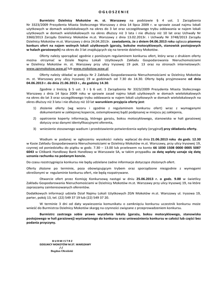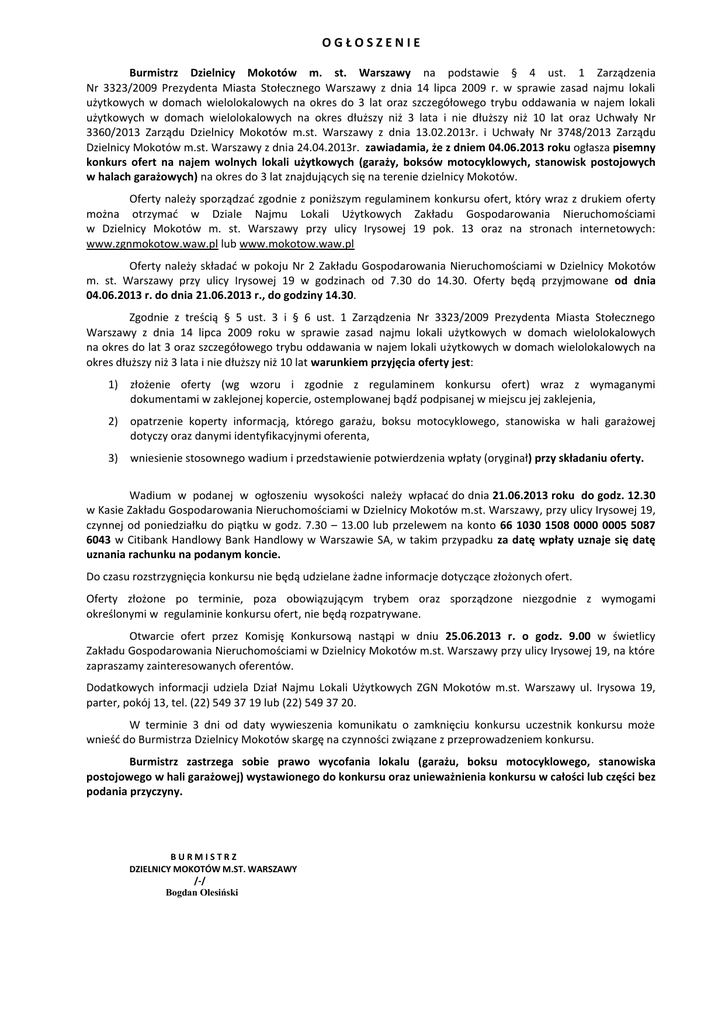 OGŁOSZENIE Burmistrz Dzielnicy Mokotów m. st. Warszawy na podstawie § 4 ust. 1 Zarządzenia Nr 3323/2009 Prezydenta Miasta Stołecznego Warszawy z dnia 14 lipca 2009 r. w sprawie zasad najmu lokali użytkowych w domach wielolokalowych na okres do 3 lat oraz szczegółowego trybu oddawania w najem lokali użytkowych w domach wielolokalowych na okres dłuższy niż 3 lata i nie dłuższy niż 10 lat oraz Uchwały Nr 3360/2013 Zarządu Dzielnicy Mokotów m.st. Warszawy z dnia 13.02.2013r. i Uchwały Nr 3748/2013 Zarządu Dzielnicy Mokotów m.st. Warszawy z dnia 24.04.2013r. zawiadamia, że z dniem 04.06.2013 roku ogłasza pisemny konkurs ofert na najem wolnych lokali użytkowych (garaży, boksów motocyklowych, stanowisk postojowych w halach garażowych) na okres do 3 lat znajdujących się na terenie dzielnicy Mokotów. Oferty należy sporządzad zgodnie z poniższym regulaminem konkursu ofert, który wraz z drukiem oferty można otrzymad w Dziale Najmu Lokali Użytkowych Zakładu Gospodarowania Nieruchomościami w Dzielnicy Mokotów m. st. Warszawy przy ulicy Irysowej 19 pok. 13 oraz na stronach internetowych: www.zgnmokotow.waw.pl lub www.mokotow.waw.pl Oferty należy składad w pokoju Nr 2 Zakładu Gospodarowania Nieruchomościami w Dzielnicy Mokotów m. st. Warszawy przy ulicy Irysowej 19 w godzinach od 7.30 do 14.30. Oferty będą przyjmowane od dnia 04.06.2013 r. do dnia 21.06.2013 r., do godziny 14.30. Zgodnie z treścią § 5 ust. 3 i § 6 ust. 1 Zarządzenia Nr 3323/2009 Prezydenta Miasta Stołecznego Warszawy z dnia 14 lipca 2009 roku w sprawie zasad najmu lokali użytkowych w domach wielolokalowych na okres do lat 3 oraz szczegółowego trybu oddawania w najem lokali użytkowych w domach wielolokalowych na okres dłuższy niż 3 lata i nie dłuższy niż 10 lat warunkiem przyjęcia oferty jest: 1) złożenie oferty (wg wzoru i zgodnie z regulaminem konkursu ofert) wraz z wymaganymi dokumentami w zaklejonej kopercie, ostemplowanej bądź podpisanej w miejscu jej zaklejenia, 2) opatrzenie koperty informacją, którego garażu, boksu motocyklowego, stanowiska w hali garażowej dotyczy oraz danymi identyfikacyjnymi oferenta, 3) wniesienie stosownego wadium i przedstawienie potwierdzenia wpłaty (oryginał) przy składaniu oferty. Wadium w podanej w ogłoszeniu wysokości należy wpłacad do dnia 21.06.2013 roku do godz. 12.30 w Kasie Zakładu Gospodarowania Nieruchomościami w Dzielnicy Mokotów m.st. Warszawy, przy ulicy Irysowej 19, czynnej od poniedziałku do piątku w godz. 7.30 – 13.00 lub przelewem na konto 66 1030 1508 0000 0005 5087 6043 w Citibank Handlowy Bank Handlowy w Warszawie SA, w takim przypadku za datę wpłaty uznaje się datę uznania rachunku na podanym koncie. Do czasu rozstrzygnięcia konkursu nie będą udzielane żadne informacje dotyczące złożonych ofert. Oferty złożone po terminie, poza obowiązującym trybem oraz sporządzone niezgodnie z wymogami określonymi w regulaminie konkursu ofert, nie będą rozpatrywane. Otwarcie ofert przez Komisję Konkursową nastąpi w dniu 25.06.2013 r. o godz. 9.00 w świetlicy Zakładu Gospodarowania Nieruchomościami w Dzielnicy Mokotów m.st. Warszawy przy ulicy Irysowej 19, na które zapraszamy zainteresowanych oferentów. Dodatkowych informacji udziela Dział Najmu Lokali Użytkowych ZGN Mokotów m.st. Warszawy ul. Irysowa 19, parter, pokój 13, tel. (22) 549 37 19 lub (22) 549 37 20. W terminie 3 dni od daty wywieszenia komunikatu o zamknięciu konkursu uczestnik konkursu może wnieśd do Burmistrza Dzielnicy Mokotów skargę na czynności związane z przeprowadzeniem konkursu. Burmistrz zastrzega sobie prawo wycofania lokalu (garażu, boksu motocyklowego, stanowiska postojowego w hali garażowej) wystawionego do konkursu oraz unieważnienia konkursu w całości lub części bez podania przyczyny. BURMISTRZ DZIELNICY MOKOTÓW M.ST. WARSZAWY /-/ Bogdan Olesiński WYKAZ GARAŻY, STANOWISK POSTOJOWYCH W HALACH GARAŻOWYCH PRZEZNACZONYCH DO KONKURSU OFERT 1. adres: F. Joliot Curie 15 garaż nr 1 powierzchnia w m2: 17,10 m2 położenie: garaż w zespole garaży wolnostojących na poziomie parteru wyposażenie: instalacja elektryczna (podlicznik energii) minimalna stawka czynszu netto za 1 m2 powierzchni: 11,50 PLN wadium: 197,00 PLN stan techniczny: do remontu bieżącego przeznaczenie: do parkowania samochodu osobowego dz. ew. 62/2 obręb 1-02-05 2. adres: Al. Niepodległości 64/68 garaż nr 5 powierzchnia w m2: 18,00 m2 położenie: garaż w zespole garaży wolnostojących na parterze wyposażenie: brak instalacji minimalna stawka czynszu netto za 1 m2 powierzchni: 11,50PLN wadium: 207,00 PLN stan techniczny: do remontu bieżącego przeznaczenie: do parkowania samochodu osobowego dz. ew. 75/5 obręb 1-02-07 3. adres: Al. Niepodległości 64/68 garaż nr 6 powierzchnia w m2: 15,73m2 położenie: garaż w zespole garaży wolnostojących na parterze wyposażenie: brak instalacji minimalna stawka czynszu netto za 1 m2 powierzchni: 11,50PLN wadium: 181,00PLN stan techniczny: do remontu bieżącego przeznaczenie: do parkowania samochodu osobowego dz. ew. 75/16 obręb 1-02-07 4. adres: Al. Niepodległości 64/68 garaż nr 8 powierzchnia w m2: 15,26m2 położenie: garaż w zespole garaży wolnostojących na parterze wyposażenie: brak instalacji minimalna stawka czynszu netto za 1 m2 powierzchni: 11,50PLN wadium: 176,00PLN stan techniczny: do remontu bieżącego przeznaczenie: do parkowania samochodu osobowego dz. ew. 75/2 obręb 1-02-07 5. adres: Iwicka 8 garaż nr 59 powierzchnia w m2: 17,61m2 położenie: garaż w budynku wielolokalowym mieszkalnym wyposażenie: instalacja elektryczna, c.o., wodno-kanalizacyjna minimalna stawka czynszu netto za 1 m2 powierzchni: 11,50PLN wadium: 203,00PLN stan techniczny: do remontu bieżącego przeznaczenie: do parkowania samochodu osobowego dz. ew. 15 obręb 1-03-06 6. adres: Króżaoska 4 garaż nr 1 powierzchnia w m2: 16,99m2 położenie: garaż w zespole garaży wolnostojący