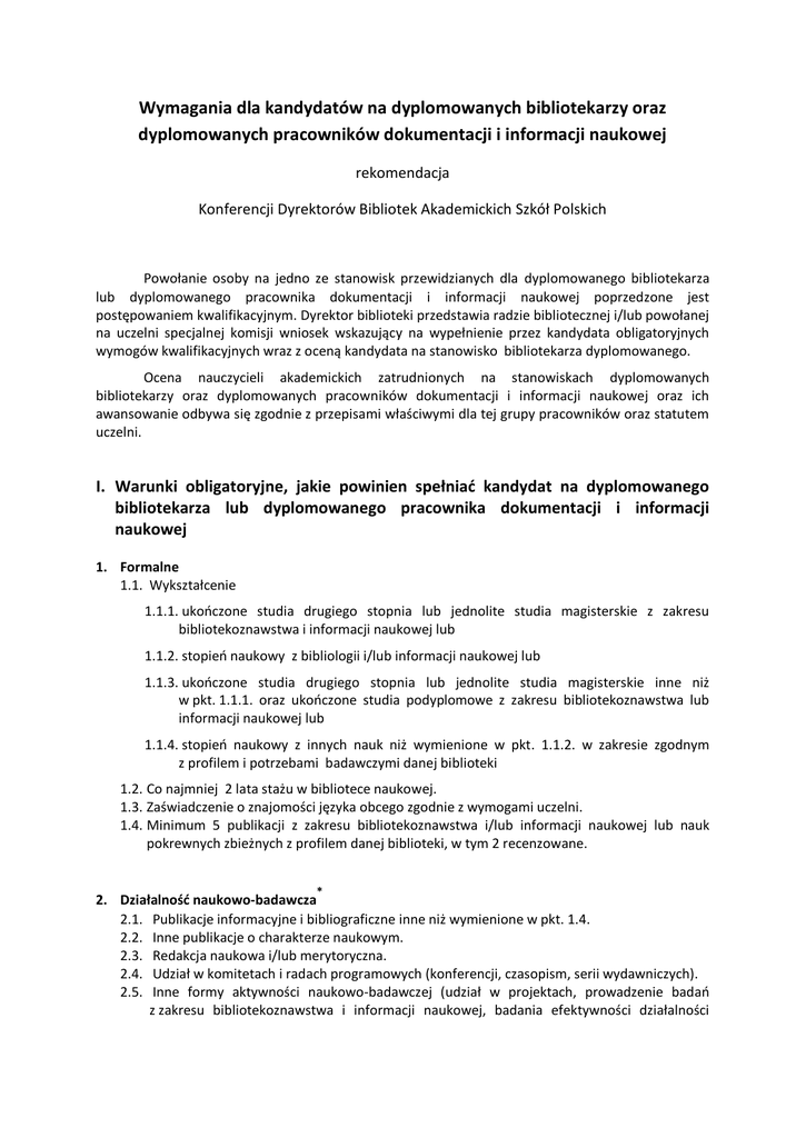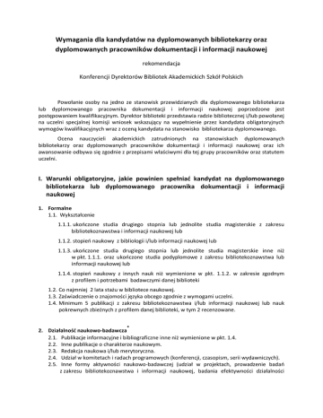 Wymagania dla kandydatów na dyplomowanych bibliotekarzy oraz dyplomowanych pracowników dokumentacji i informacji naukowej rekomendacja Konferencji Dyrektorów Bibliotek Akademickich Szkół Polskich Powołanie osoby na jedno ze stanowisk przewidzianych dla dyplomowanego bibliotekarza lub dyplomowanego pracownika dokumentacji i informacji naukowej poprzedzone jest postępowaniem kwalifikacyjnym. Dyrektor biblioteki przedstawia radzie bibliotecznej i/lub powołanej na uczelni specjalnej komisji wniosek wskazujący na wypełnienie przez kandydata obligatoryjnych wymogów kwalifikacyjnych wraz z oceną kandydata na stanowisko bibliotekarza dyplomowanego. Ocena nauczycieli akademickich zatrudnionych na stanowiskach dyplomowanych bibliotekarzy oraz dyplomowanych pracowników dokumentacji i informacji naukowej oraz ich awansowanie odbywa się zgodnie z przepisami właściwymi dla tej grupy pracowników oraz statutem uczelni. I. Warunki obligatoryjne, jakie powinien spełniać kandydat na dyplomowanego bibliotekarza lub dyplomowanego pracownika dokumentacji i informacji naukowej 1. Formalne 1.1. Wykształcenie 1.1.1. ukończone studia drugiego stopnia lub jednolite studia magisterskie z zakresu bibliotekoznawstwa i informacji naukowej lub 1.1.2. stopień naukowy z bibliologii i/lub informacji naukowej lub 1.1.3. ukończone studia drugiego stopnia lub jednolite studia magisterskie inne niż w pkt. 1.1.1. oraz ukończone studia podyplomowe z zakresu bibliotekoznawstwa lub informacji naukowej lub 1.1.4. stopień naukowy z innych nauk niż wymienione w pkt. 1.1.2. w zakresie zgodnym z profilem i potrzebami badawczymi danej biblioteki 1.2. Co najmniej 2 lata stażu w bibliotece naukowej. 1.3. Zaświadczenie o znajomości języka obcego zgodnie z wymogami uczelni. 1.4. Minimum 5 publikacji z zakresu bibliotekoznawstwa i/lub informacji naukowej lub nauk pokrewnych zbieżnych z profilem danej biblioteki, w tym 2 recenzowane. * 2. Działalność naukowo-badawcza 2.1. Publikacje informacyjne i bibliograficzne inne niż wymienione w pkt. 1.4. 2.2. Inne publikacje o charakterze naukowym. 2.3. Redakcja naukowa i/lub merytoryczna. 2.4. Udział w komitetach i radach programowych (konferencji, czasopism, serii wydawniczych). 2.5. Inne formy aktywności naukowo-badawczej (udział w projektach, prowadzenie badań z zakresu bibliotekoznawstwa i informacji naukowej, badania efektywności działalności bibliotecznej, tworzenie/współtworzenie baz danych, w tym: opracowywanie koncepcji, prace nad strukturą baz, itp.). * 3. Działalność dydaktyczna 3.1. Prowadzenie zajęć dydaktycznych z zakresu bibliotekoznawstwa i informacji naukowej lub nauk zgodnych z profilem danej biblioteki. 3.2. Przygotowanie i realizacja różnych form dydaktyki bibliotecznej, w tym z zakresu edukacji informacyjnej, również w wersji e-learningowej. * 4. Działalność organizacyjna 4.1. Pełnienie funkcji kierowniczych w bibliotece. 4.2. Kierowanie projektami, grantami; praca w stałych zespołach problemowych biblioteki/uczelni. 4.3. Proponowanie, projektowanie i wdrażanie usprawnień oraz innowacji w zakresie organizacji pracy biblioteki. 4.4. Opracowywanie dokumentów o znaczeniu praktycznym (np. strategii, procedur wewnętrznych). 4.5. Organizacja konferencji, warsztatów, szkoleń, praktyk. 4.6. Współpraca z instytucjami z otoczenia nauki i sektora gospodarki. II. Warunki dodatkowe oceny kandydata 1. Działalność dydaktyczna na rzecz innych niż akademickie grup użytkowników. 2. Popularyzacja czytelnictwa, edukacji informacyjnej, a także nauki i jej wyników, np. wystawy, targi, festiwale nauki). 3. Posiadanie dodatkowych kwalifikacji (ukończone studia podyplomowe, staże w zagranicznych bibliotekach naukowych, inne uzyskane certyfikaty itp.). Oprac.: Zespół Roboczy KDBASP w składzie: dr hab. Artur Jazdon – dyrektor BUAM – przewodniczący Zespołu mgr Ewa Dobrzyńska-Lankosz – dyrektor BG AGH mgr Marek Górski – dyrektor BPK mgr Ewa Kobierska-Maciuszko – dyrektor BUW mgr Irena Kujawska – wicedyrektor BUŁ dr Stanisław Skórka – dyrektor BG UP 25.03.2013 r. * Wymagane jest spełnienie co najmniej jednego warunku z danej działalności