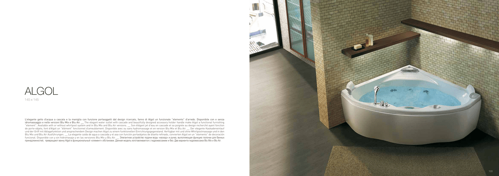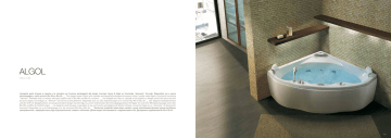 ALGOL 145 x 145 L’elegante getto d’acqua a cascata e la maniglia con funzione portaoggetti dal design ricercato, fanno di Algol un funzionale “elemento” d’arredo. Disponibile con e senza idromassaggio e nelle versioni Blu Mix e Blu Air. __ The elegant water outlet with cascade and beautifully designed accessory holder handle make Algol a functional furnishing “element”. Available with or without whirlpool system and in Blu Mix and Blu Air versions. __ Son élégant jet d’eau en cascade et sa poignée au design recherché ayant fonction de porte-objets, font d’Algol un “élément” fonctionnel d’ameublement. Disponible avec ou sans hydromassage et en version Blu Mix et Blu Air. __ Der elegante Kaskadeneinlauf und der Griff mit Ablagefunktion und ansprechendem Design machen Algol zu einem funktionellen Einrichtungsgegenstand. Verfügbar mit und ohne Whirlpoolmassage und in den Blu Mix und Blu Air Ausführungen. __ La elegante caida de agua a cascada y el asa con función portaobjetos de diseño refinado, convierten Algol en un “elemento” de decoración funcional. Disponible con y sin hidromasaje y en las versiones Blu Mix y Blu Air. __ Элегантное устройство подачи воды «каскад» и ручка, выполняющая функцию полочки для банных принадлежностей, превращают ванну Algol в функциональный «элемент» обстановки. Данная модель изготавливается с гидромассажем и без. Два варианта гидромассажа Blu Mix и Blu Air. 103 ALGOL 5 1 2 145 x 145 3 H0 Blu Two Blu Mix Bocchette | Outlets | Buses | Düsen | Boquillas | Форсунки воды 6 6 6 - Air Jets | Форсунки воздушные - - 12 22 Impianto di disinfezione | Disinfection system | Système de désinfection | Desinfektion System | Sistema de desinfección | Блок дезинфекции * * * - Impianto di ozono | Ozone system | Système d’ozone | Ozonanlage | Sistema de ozono | Озоновый блок - * * * Cromo Relax | Система подсветки Cromo Relax - * * * Linfodrenaggio | Lymph drainage | Drainage lymphatique | Lymphdrainage | Linfodrenaje | Лимфодренаж - • • • Riscaldatore acqua | Water heater | Rèchauffeur eau | Wasserheizung | Calentador agua | Нагреватель воды - * * - Blu Air * Optional | En option | Auf Wunsch | Opcional | Дополнительные опции • Di serie | Standard | De série | Serienmässing | De serie | Серийное производство 4 * * * * * * • 1. 2. 3. 4. 5. 6. 7. 8. 9. Erogazione a cascata Bocchetta idromassaggio Air Jets Coppia poggiatesta Colonna scarico Cromo Relax Rubinetteria bordo vasca Maniglia Comando idromassaggio * Optional • Per i comandi H0, Blu Two, Blu Mix, Blu Air Pag: 156, 157, 158, 160 * * * * * * • 1. 2. 3. 4. 5. 6. 7. 8. 9. Wateroutlet with cascade Outlet Air Jets Couple of headrests Pop-up waste Cromo Relax Tap assembly Handle Whirlpool control * Optional • Information about H0, Blu Two, Blu Mix, Blu Air control pp: 156, 157, 158, 160 * * * * * * • 1. 2. 3. 4. 5. 6. 7. 8. 9. Jet d’eau en cascade Buse Air Jets Couple d’appui-tête Vidage Cromo Relax Robinetterie Poignée Commande hydromassage * En option • 7 Informations sur le commandes H0, Blu Two, Blu Mix, Blu Air pp: 156, 157, 158, 160 6 * * * * * * • 8 9 1. 2. 3. 4. 5. 6. 7. 8. 9. Kaskadeneinlauf Düse Air Jets Zwei Kopfstützen Ablaufgarnitur Cromo Relax Wannenrand-Armatur Wannengriff Whirlpool Steuerung * Auf Wunsch • 4 Informationen bezüglich H0, Blu Two, Blu Mix, Blu Air Steuerungen Seite: 156, 157, 158, 160 * * * * * * • 1. 2. 3. 4. 5. 6. 7. 8. 9. Caida de agua a cascada Boquilla Air Jets Par de reposacabezas Desagüe Cromo Relax Grifería integrada en la bañera Asa Mando hidromasaje * Opcional • Informaciones sobre los mandos H0, Blu Two, Blu Mix, Blu Air pp: 156, 157, 158, 160 * * * * * * • 1. 2. 3. 4. 5. 6. 7. 8. 9. Устройство подачи воды “каскад” Форсунка гидромассажа Форсунки воздушные Пара подголовников Слив-перелив Система подсветки Cromo Relax Арматура на краю ванны Ручка Панель управления гидромассажем * Дополнительные опции • 146,5 145 148 57 205 208 Описание панелей управления H0, Blu Two, Blu Mix, Blu Air см страница: 156, 157, 158, 160 105