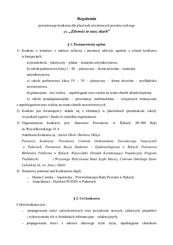 Regulamin powiatowego konkursu dla placówek oświatowych powiatu ryckiego pn. „Zdrowie to nasz skarb” § 1. Postanowienia ogólne 1) Konkurs o tematyce z zakresu ochrony i promocji zdrowia zgodnie z celami konkursu w kategoriach: a) przedszkola – plastyczny – plakat – tematyka antynikotynowa, b) szkoła podstawowa klasy I – III – plastyczny – forma dowolna – tematyka antynikotynowa, c) szkoła podstawowa klasy IV – VI – plastyczny – forma dowolna – profilaktyka nowotworowa, d) gimnazjum – test wiedzy – zapobieganie oraz wiedza na temat chorób układu krążenia, e) szkoła ponadgimnazjalna – prezentacja multimedialna – związanych tematycznie z zapobieganiem oraz wiedzą na temat chorób nowotworowych. 2) Konkurs jest dwuetapowy: składa się z eliminacji w placówkach (przedszkola, szkoły wszystkich typów) i finału (w siedzibie organizatora). 3) Organizatorem konkursu jest: Starostwo Powiatowe w Rykach, 08-500 Ryki ul. Wyczółkowskiego 10 A Autorkami Konkursu są : Anetta Okoń i Barbara Okleja Partnerzy Konkursu: Powiatowe Centrum Doskonalenia Zawodowego Nauczycieli w Puławach, Powiatowa Stacja Sanitarno – Epidemiologiczna w Rykach, Powiatowa Biblioteka Publiczna w Rykach, Wojewódzki Ośrodek Koordynujący Populacyjny Program Profilaktyki i Wczesnego Wykrywania Raka Szyjki Macicy, Centrum Onkologii Ziemi Lubelskiej im. św. Jana z Dukli. 4) Honorowy patronat nad Konkursem objęli: Hanna Czerska – Gąsiewska – Przewodnicząca Rady Powiatu w Rykach, Anna Baracz - Dyrektor PCDZN w Puławach § 2. Cel konkursu Celem konkursu jest : propagowanie treści antytytoniowych oraz pozyskanie nowych, ciekawych projektów i wykorzystanie ich w działaniach informacyjno – edukacyjnych, propagowanie treści z zakresu zdrowego stylu życia, zapobiegania chorobom nowotworowym, chorobom układu krążenia i chorobom odtytoniowym, kształtowanie postawy odpowiedzialności za zdrowie - „Twoje zdrowie w twoich rękach”, wykorzystanie i rozwijanie wśród młodzieży umiejętności z zakresu tworzenia prezentacji multimedialnych, rozbudzanie wrażliwości i świadomości istniejących zagrożeń i metod zapobiegania chorobom: układu krążenia, nowotworowym i odtytoniowym. § 3. Czas trwania i przebieg konkursu 1) Pierwszy etap Konkursu odbywa się w placówkach od dnia przesłania regulaminu do dnia 18 października 2013 roku (ostatecznego terminu złożenia prac w siedzibie organizatora/zgłoszenia uczniów z gimnazjum do etapu powiatowego). Komisje Konkursowe w placówkach wytypują w każdej kategorii : przedszkola -3 prace szkoły podstawowe klasy I-III-3 prace szkoły podstawowe klasy IV- VI-3 prace gimnazja - 2 uczniów szkoły ponadgimnazjalne-3 prace uczestników konkursu, dostarczając ich prace (wraz z kartą zgłoszenia w poszczególnej kategorii) oraz zgłoszenie uczniów (gimnazja) do finału w siedzibie organizatora w/w terminie. 2) Drugi etap Konkursu odbywa się w kategorii gimnazja w dniu 30 października 2013 roku o godz. 9.00 w siedzibie organizatora tj. Ryki, ul. Wyczółkowskiego 10A (sala konferencyjna). 3) Laureaci w kategoriach: przedszkola, szkoły podstawowe, szkoły ponadgimnazjalne zostaną powiadomieni za pośrednictwem poczty elektronicznej bądź telefonicznie przez swoich opiekunów. 4) Ogłoszenie wyników i uroczyste wręczenie nagród laureatom wszystkich kategorii odbędzie się w dniu 30 października 2013 r. o godz. 12.00 w siedzibie organizatora. § 4. Zasady uczestnictwa w Konkursie 1)Warunkiem uczestnictwa w kategoriach: - test wiedzy dotyczący chorób układu krążenia - jest wybranie w eliminacjach szkolnych dwóch uczestników, którzy będą reprezentować placówkę podczas finału w Starostwie Powiatowym w Rykach, - prezentacja multimedialna „Jak się ustrzec przed nowotwore m” lub „Lepiej zapobiegać niż leczyć”– jest przygotowanie prezentacji multimedialnej o treści odpowiadającej celom Konkursu. Każda szkoła uczestnicząca w konkursie wybiera 3 najlepsze prezentacje i dostarcza do Starostwa Powiatowego w Rykach, ul. Wyczółkowskiego 10A (pok. 207) w terminie do 18 października 2013 roku, - forma plastyczna: : przeds zkola (plakat) i klasy I-III szkoły podstawowe j (forma dowolna) nt. „Mamo, tato nie pal przy mnie” . Tematyka prac powinna dotyczyć korzyści, jakie wynikają z niepalenia oraz życia w świecie wolnym od dymu tytoniowego. : klasy IV – VI szkoły podstawowe j (forma dowolna) nt. „Mamo, tato wykonuj badania profilaktyczne”. Tematyka prac powinna dotyczyć korzyści jakie wynikają z wykonywania badań profilaktycznych tj. cytologia, mammografia, kolonoskopia, rtg. klatki piersiowej, badań laboratoryjnych (morfologia, PSA). Każda placówka uczestnicząca w konkursie wybiera 3 najlepsze prace i dostarcza do Starostwa Powiatowego w Rykach, ul. Wyczółkowskiego 10A (pok. 207) w terminie do 18 października 2013 roku, 2) Sposób opisania prac konkursowych: Każda praca ma być opisana na odwrocie następująco: imię i nazwisko przedszkolaka /ucznia, przedszkole /klasa; nazwa przedszkola/ szkoły i numer telefonu. W przypadku braku możliwości opisania pracy na odwrocie należy dołączyć do pracy informację z w/w opisem. Ponadto do każdej dostarczonej pracy konkursowej należy dołączyć oświadczenie w sprawie zrzeczenia się praw autorskich (załącznik nr 2 do Regulaminu). W przypadku przedszkolaków i uczniów klas I-VI załącznik nr 2 podpisuje rodzic bądź opiekun. 3) Kartę zgłoszenia (załącznik nr 1 do Regulaminu) w poszczególnych kategoriach należy dostarczyć w/w terminie tj. do 18 października 2013 roku. § 5. Kryteria oceny prac konkursowych 1) Prace będą oceniane z uwzględnieniem następujących kryteriów w poszczególnych kategoriach: a. zastosowanie się do zapisów niniejszego regulaminu, b. pomysłowości i oryginalności, c. zgodności z tematem, tj. przekazanych treści związanych z profilaktyką tytoniową, nowotworową , d.