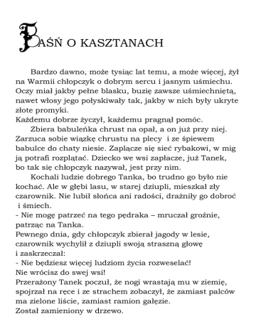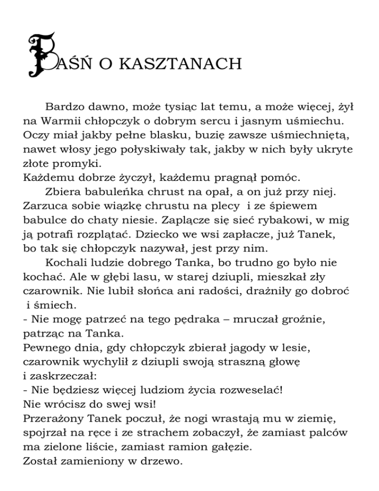 B AŚŃ O KASZTANACH Bardzo dawno, może tysiąc lat temu, a może więcej, żył na Warmii chłopczyk o dobrym sercu i jasnym uśmiechu. Oczy miał jakby pełne blasku, buzię zawsze uśmiechniętą, nawet włosy jego połyskiwały tak, jakby w nich były ukryte złote promyki. Każdemu dobrze życzył, każdemu pragnął pomóc. Zbiera babuleńka chrust na opał, a on już przy niej. Zarzuca sobie wiązkę chrustu na plecy i ze śpiewem babulce do chaty niesie. Zaplącze się sieć rybakowi, w mig ją potrafi rozplątać. Dziecko we wsi zapłacze, już Tanek, bo tak się chłopczyk nazywał, jest przy nim. Kochali ludzie dobrego Tanka, bo trudno go było nie kochać. Ale w głębi lasu, w starej dziupli, mieszkał zły czarownik. Nie lubił słońca ani radości, drażniły go dobroć i śmiech. - Nie mogę patrzeć na tego pędraka – mruczał groźnie, patrząc na Tanka. Pewnego dnia, gdy chłopczyk zbierał jagody w lesie, czarownik wychylił z dziupli swoją straszną głowę i zaskrzeczał: - Nie będziesz więcej ludziom życia rozweselać! Nie wrócisz do swej wsi! Przerażony Tanek poczuł, że nogi wrastają mu w ziemię, spojrzał na ręce i ze strachem zobaczył, że zamiast palców ma zielone liście, zamiast ramion gałęzie. Został zamieniony w drzewo. Przeszła jesień i zima. Na wiosnę dzieci pobiegły do lasu po kwiaty i na polanie spostrzegły nieznane drzewko. - Jakie to śliczne drzewo! Patrzcie! Liście ma jak ludzie ręce, a jakie piękne kwiaty. I odtąd codziennie przybiegały pod rozłożyste drzewo. Drżało wtedy z radości serce Tanka, ukryte pod korą. - Jakież to będzie miało owoce? – pytały się nawzajem dzieci. – Może takie piękne jak kwiaty? - Chi, chi, chi! – zaśmiał się w swej dziupli zły czarownik. - Będzie miało owoce piękne i lśniące, ale ukryję je tak, że ich nie znajdziecie. A gdy jesienią przyszły dzieci pod drzewo, było ono całe najeżone zielonymi kulami, na których groźnie sterczały kolce. - Ach, jakie straszne te kule! Jakie kolczaste! Uciekajmy stąd! Uciekajmy! – zawołały dzieci. Zadrżało drzewo ze smutku i zapłakało. Jak łzy, spadały na ziemię zielone kule. Pac, pac, pac. A co która upadła na ziemię, pękała i wychylał się z niej lśniący złotobrązowy owoc. - Patrzcie, jakie piękne owoce! – ucieszyły się dzieci i zbierały rudobrązowe owoce. Robiły z nich łódeczki, które wesoło pływały po jesiennych kałużach wody, w zimowe wieczory robiły z nich laleczki i różne cudaki. Bardzo kochały rozłożyste drzewko. - Te kulki mają taki kolor, jak włosy Tanka, który zginął bez wieści – przypomniały sobie pewnego razu i nazwały drzewko imieniem chłopczyka „Tanek”. Kiedyś ktoś dodał „Kasz” i drzewo nazwano „Kasztanek”. I dziś złotobrązowe kule nazywają się kasztany. Znacie je dobrze, prawda?
