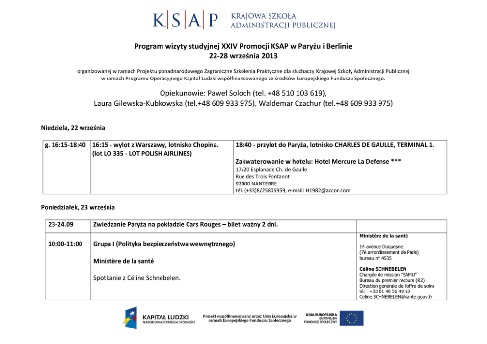 Program wizyty studyjnej XXIV Promocji KSAP w Paryżu i Berlinie 22-28 września 2013 organizowanej w ramach Projektu ponadnarodowego Zagraniczne Szkolenia Praktyczne dla słuchaczy Krajowej Szkoły Administracji Publicznej w ramach Programu Operacyjnego Kapitał Ludzki współfinansowanego ze środków Europejskiego Funduszu Społecznego. Opiekunowie: Paweł Soloch (tel. +48 510 103 619), Laura Gilewska-Kubkowska (tel.+48 609 933 975), Waldemar Czachur (tel.+48 609 933 975) Niedziela, 22 września g. 16:15-18:40 16:15 - wylot z Warszawy, lotnisko Chopina. (lot LO 335 - LOT POLISH AIRLINES) 18:40 - przylot do Paryża, lotnisko CHARLES DE GAULLE, TERMINAL 1. Zakwaterowanie w hotelu: Hotel Mercure La Defense *** 17/20 Esplanade Ch. de Gaulle Rue des Trois Fontanot 92000 NANTERRE tél. (+33)8/25805959, e-mail: [email protected] Poniedziałek, 23 września 23-24.09 Zwiedzanie Paryża na pokładzie Cars Rouges – bilet ważny 2 dni. Ministère de la santé 10:00-11:00 Grupa I (Polityka bezpieczeństwa wewnętrznego) Ministère de la santé Spotkanie z Céline Schnebelen. 14 avenue Duquesne (7è arrondissement de Paris) bureau n° 4535 Céline SCHNEBELEN Chargée de mission "SAMU" Bureau du premier recours (R2) Direction générale de l'offre de soins tél : +33 01 40 56 49 53 [email protected] 10:00-11:00 Grupa II (Polityka migracyjna) oraz Grupa IV (Polityka podatkowa) Topic: Presentation of the activities of the Department for Legal and Administrative Information of the Services of the Prime Minister Speakers: Mr. Artur BORZEDA, Head of Department of International Relations and Ms. Karine PEUVRIER, Head of Department for external communication at the Department for Legal and Administrative Information of the Services of the Prime Minister DILA Direction de l'information légale et administrative (Directorate of Legal and Administrative Information) 26, rue Desaix 75015 PARIS Métro : Bir Hakeim (grande salle d’honeur) Artur BORZEDA Responsable des Relations internationales [email protected] http://www.dila.premierministre.gouv.fr/ Ministère de l’Intérieur 10:00-12:00 Grupa II (Polityka migracyjna) Topic: Presentation of the French integration policy Speaker: Ms. Sylvie MOREAU, Head of Department, Department for integration and citizenship, Secretariat-General for Immigration and Integration, Ministry of Interior 10:00 – 12:00 Grupa III (Polityka ochrony środowiska) Topic: Presentation of the French air quality policy Speaker: Mr. Hubert HOLIN, Deputy Head of Department, Office of the Air Quality, General Department of Energy and Climate, Ministry of Ecology, Sustainable development and Energy 3-5, rue Barbet-de-Jouy 75007 Paris Métro : Varennes (from the side of the Ministry of Interior), First Floor, Room 158 http://www.immigration.interieur.gouv.fr DGEC - Bureau de la qualité de l'air General Department of Energy and Climate Grande Arche, Paroi Nord, Le-Parvis-de-La-Défense, 92800 Puteaux 31th Floor, Room – 31N27. Ph.: +33 01 58 45 32 50 http://www.developpementdurable.gouv.fr 10:00-12:00 Grupa V (Polityka zdrowia publicznego) Topic: Presentation of the Personal Health Record system and the activities of the ASIP Santé in the field of eHealth 14:00 - 18:00 14:00 Speakers: Ms. Anne MONNIER, Director of the Service Territories and Mr. Mikael AZOULAY, Project Manager at ASIP Santé OECD Welcome and Introduction to the Programme by Mr. Andrew Gentry, Coordinator of OECD SVP, and Ms. Miriam Allam, Policy Analyst, MENA-OECD Governance Programme, Public Governance and Territorial Development Directorate 14:15 - 14:45 Introduction to OECD: Structure and membership by Mr. Andrew Gentry, Coordinator of OECD SVP (Seminars and Visits Programme) 14:45 - 15:30 The OECD Public Governance Review of Poland and the role of the Centre of Government in information management: tools and implementation strategies by Mr. Filippo Cavassini, Policy Analyst, Public Governance Reviews and Partnership Division, Public Governance and Territorial Development Directorate, OECD 15:30 – 15:45 Break 15:45 - 16:15 The role of e-government in information management in Poland and other OECD countries by Mr. Adam Mollerup, Policy Analyst, Reform of the Public Sector, Public Governance and Territorial Development Directorate, OECD ASIP Santé Agence des systèmes d’information partagés de santé 9, rue Georges Pitard 75015 PARIS Métro : Pernety Tél: +33 01 58 45 32 50 http://esante.gouv.fr/ OCDE 2, rue André Pascal 75775 Paris Cedex 16 Miriam Allam Économiste Direction de la Gouvernance publique et du développement territorial Tél. : +33 1 45 24 16 70 Fax : +33 1 44 30 63 86 [email protected] 16:15 - 16:45 “Government at a Glance” with focus on Poland and indicators on information management/transparency by Ms. Zsuzsanna Lonti, OECD Government at a Glance Team, Public Governance and Territorial Development Directorate, OECD 16:45 - 17:00 Break 17:00 - 17:30 Migration Outlook by Mr. Thomas Liebig, Policy Analyst, International Migration Division, OECD Wtorek, 24 września 9:45-12:30 ENA (all the groups) ENA École Nationale d’Administration 9h45 – 10h00 – Welcoming of participants at ENA 2, avenue de l’Observatoire 75006 Paris RER B Luxembourg 10h00 – 12h30 : Topic: Presentation of the Information management system of the services of the Prime Minister with a particular focus on the information system of the Secretariat-General of Government, and in particular the process of digitization Speaker : Mr. Stéphane COTTIN, Cabinet of the Secretary General of the Government, Development of the information systems, Secretariat-General of the Government Room : Amphi Erignac 105 Vanessa de FROIDCOURT Chargée de projets - Project Manager Service des affaires multilatérales et des appels d'offres Direction des relations internationales [email protected] Tél: + 33 (0)1 44 41 85 15 http://www.gouvernement.fr 10:00-12:00 Grupa III (Polityka ochrony środowiska) Airparif Organizacja odpowiedzialna 
