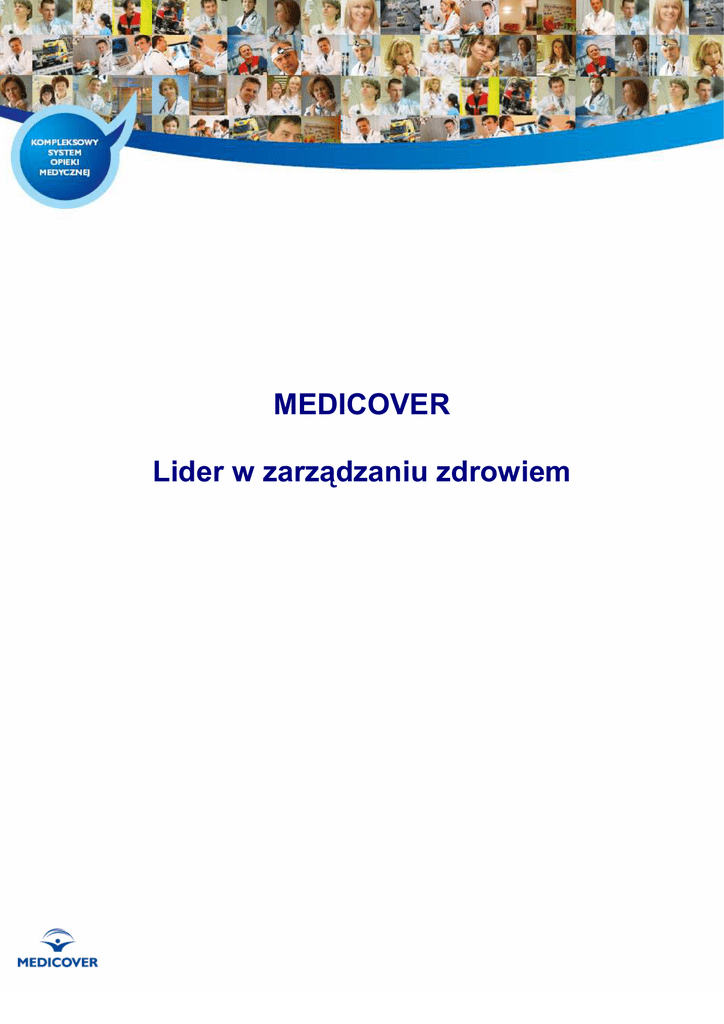 MEDICOVER Lider w zarządzaniu zdrowiem 1. KIM JESTEŚMY Jesteśmy międzynarodową firmą medyczną wywodzącą się ze Szwecji, działającą w Polsce, Czechach, na Węgrzech, w Rumunii, dostawcą usług medycznych dla ponad 6300 firm oraz 300 tys. klientów. Posiadamy 50 centrów medycznych, zatrudniamy około 2500 pracowników, obsługujemy blisko 2 miliony wizyt lekarskich rocznie. W Polsce Medicover zapewnia zintegrowaną i kompleksową opiekę medyczną. To właśnie tutaj, blisko 15 lat temu, pierwsi wprowadziliśmy na rynek abonamentowy system opieki zdrowotnej. Obecnie na terenie całego kraju posiadamy 19 własnych Centrów Medicover, 25 placówek przyzakładowych i współpracujemy z ponad 500 zakładami opieki zdrowotnej. Zatrudniamy 2500 pracowników i współpracowników, którzy tworzą jeden zintegrowany zespół ekspertów składający się z doświadczonych lekarzy, personelu medycznego oraz menedŜerów wyspecjalizowanych w zarządzaniu ochroną zdrowia. Z naszej stałej opieki abonamentowej korzysta juŜ ponad 6300 firm oraz 300 tysięcy klientów. Zapewniamy najlepszy dostęp do wysokiej jakości świadczeń. Oferujemy pełnozakresowe usługi ambulatoryjne. W ramach laboratoriów Synevo, naleŜących do grupy Medicover, zapewniamy usługi diagnostyki laboratoryjnej. Rozwijamy sieć specjalistycznych aptek Medicopharma. Świadczymy usługi całodobowej pomocy medycznej. Jako długoletni i jednocześnie największy inwestor branŜowy w Polsce, w połowie 2007 r. rozpoczęliśmy budowę własnego wieloprofilowego szpitala na Warszawskim Wilanowie, którego otwarcie nastąpi juŜ na początku 2009 r. Niedawno swoją działalność rozpoczęło Medicover Ubezpieczenia, które oferuje ubezpieczenia medyczne adresowane do klientów indywidualnych. Wyznaczamy nowe kierunki w opiece medycznej. Jako pierwsi w Polsce wprowadziliśmy standardy postępowania medycznego. Stosujemy najnowocześniejsze rozwiązania wspomagające proces diagnostyczny i leczenie. Przykładamy duŜą wagę do profilaktyki zdrowotnej Pacjentów. Jako doradca medyczny i partner w biznesie oferujemy rozwiązania dopasowane do konkretnych potrzeb populacji pracowników ponad 4000 firm. W oparciu o kompleksowe Programy Pracowniczej Opieki Medycznej (Abonamenty) oferujemy swoim Klientom pełną opiekę medyczną. Przeprowadzamy audyty zdrowia i na podstawie profilowanych Programów Wsparcia Pracowniczego rekomendujemy i realizujemy działania kreujące zdrowie. Dzięki programowi Medicover Club umoŜliwiamy naszym klientom dostęp do szeregu cennych informacji, opracowanych przez specjalistów pomagają skuteczniej zadbać o zdrowie oraz dobre samopoczucie. i lekarzy Medicover, które Stale podnosimy poziom i zakres oferowanych usług. Aktywnie inwestujemy w nowatorskie technologie. W połowie 2007 r. uruchomiliśmy jedno zintegrowane ogólnopolskie Call Center, oparte na technologii VOIP. W naszych placówkach funkcjonuje system elektronicznej historii choroby pacjentów umoŜliwiający łatwy i szybki dostęp do pełnej i jednolitej strukturalnie dokumentacji medycznej pacjenta, dostępnej z dowolnego gabinetu lekarskiego wyposaŜonego w komputer – stację lekarską. Dzięki Medicover On-Line - bezpiecznej stronie internetowej nasi Klienci mają wgląd do własnych danych medycznych, mogą teŜ dokonać wyboru lekarza, potwierdzić terminy wizyt, zamówić leki czy wybrać najdogodniejszą dla siebie placówkę. Chcemy, aby w przyszłości, w określonych przypadkach medycznych, moŜliwe było uzyskanie porady lekarza równieŜ przez Internet z opcją bezpośredniej transmisji obrazu i dźwięku. 2. JAK DZIAŁAMY Medicover to jedyny w Polsce system opieki zamkniętej - z naszych usług korzystają Pacjenci posiadający naszą kartę na zasadach abonamentu miesięcznego. Zobowiązujemy się do określonego w umowie zakresu usług i wykonujemy je w ramach jednej, stałej opłaty. Taki system rozliczeń gwarantuje Państwu koszty na niezmiennym poziomie oraz pewność uzyskania opieki medycznej w chwili, gdy koszty leczenia wielokrotnie przekraczają miesięczną opłatę. System ten daje Medicover solidne podstawy finansowe, pozwala odpowiednio planować rozwój idąc w kierunku wygody dla naszych Klientów i jakości na bardzo wysokim poziomie. 3. JAK NAS WIDZĄ Stałą troską Medicover jest zadowolenie naszych Klientów. Ich ocena jest dla nas najwaŜniejsza. Aby dać wyraz tej trosce Medicover uzyskał jako pierwszy w Polsce Certyfikat ISO dla firmy świadczącej usługi w zakresie opieki medycznej. ISO jest dla nas zobowiązaniem do ciągłego monitorowania sprawności i skuteczności z jaką zarządzamy kompleksową opieką medyczną. 4. POWODY DO DUMY W maju 2007 roku Medicover jako jedyna firma z branŜy prywatnych usług medycznych otrzymał tytuł Marki Wysokiej Reputacji. Badanie PremiumBrand 2007 przeprowadził TNS OBOP. Premium Brand to innowacyjne badanie umoŜliwiające zdobycie rzetelnej i wszechstronnej wiedzy dotyczącej reputacji marki. W marcu 2006 roku zajęliśmy I miejsce w rankingu prywatnych firm medycznych ogłoszonym przez prestiŜowy magazyn Forbes. W marcu 2001 roku nasza firma została uhonorowana Medalem Europejskim - przyznawanym przez Komitet Integracji Europejskiej oraz BCC za jakość usług odpowiadającą standardom europejskim. W 1999 roku Centra Medicover otrzymały certyfikat na zgodność stosowanego Systemu Zarządzania Jakością z wymaganiami normy ISO 9002. 5. GDZIE JESTEŚMY Usługi Medicover są szeroko dostępne. Nasi Klienci w ramach abonamentu ogólnopolskiego mają moŜliwość uzyskania porady, zrobienia badań w wielu miastach Polski. Medicover posiada własne Centra Medicover w 10 największych miastach Polski: w Gdańsku, Gdyni, Katowicach, Krakowie, Lublinie, Łodzi, Poznaniu, Szczecinie, Warszawie i Wrocławiu. Centra Medicover – adresy i godziny pracy: Warszawa - Centrum Atrium al. Jana Pawła II 27, 00-867 Warszawa, godz. pracy: poniedziałek - 