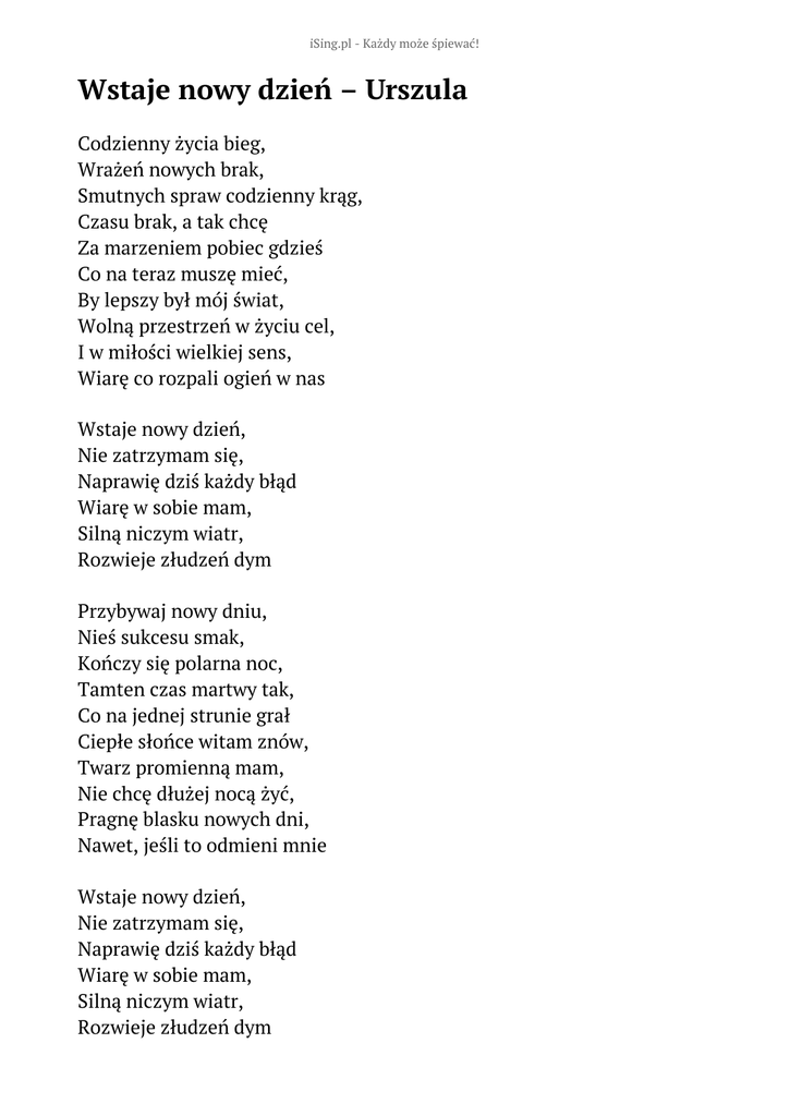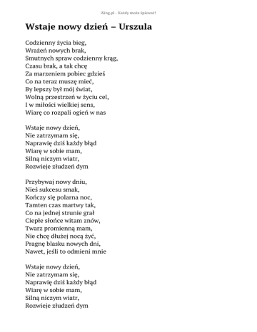 iSing.pl - Każdy może śpiewać! Wstaje nowy dzień – Urszula Codzienny życia bieg, Wrażeń nowych brak, Smutnych spraw codzienny krąg, Czasu brak, a tak chcę Za marzeniem pobiec gdzieś Co na teraz muszę mieć, By lepszy był mój świat, Wolną przestrzeń w życiu cel, I w miłości wielkiej sens, Wiarę co rozpali ogień w nas Wstaje nowy dzień, Nie zatrzymam się, Naprawię dziś każdy błąd Wiarę w sobie mam, Silną niczym wiatr, Rozwieje złudzeń dym Przybywaj nowy dniu, Nieś sukcesu smak, Kończy się polarna noc, Tamten czas martwy tak, Co na jednej strunie grał Ciepłe słońce witam znów, Twarz promienną mam, Nie chcę dłużej nocą żyć, Pragnę blasku nowych dni, Nawet, jeśli to odmieni mnie Wstaje nowy dzień, Nie zatrzymam się, Naprawię dziś każdy błąd Wiarę w sobie mam, Silną niczym wiatr, Rozwieje złudzeń dym Kiedy nowy dzień znów obudzi mnie, Minie tamten czas, na zawsze Wstaje nowy dzień, Nie zatrzymam się, Naprawię dziś każdy błąd Wiarę w sobie mam, Silną niczym wiatr, Rozwieje złudzeń dym Wstaje nowy dzień, Nie zatrzymam się, Naprawię dziś każdy błąd Wiarę w sobie mam, Silną niczym wiatr, Rozwieje złudzeń dym Słowa: brak danych Muzyka: brak danych Rok wydania: brak danych Płyta: brak danych
