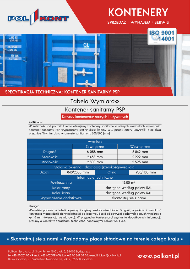 KONTENERY SPRZEDAŻ · WYNAJEM · SERWIS SPECYFIKACJA TECHNICZNA: KONTENER SANITARNY PSP Tabela Wymiarów Kontener sanitarny PSP Dotyczy kontenerów nowych i używanych Krótki opis: W zależności od potrzeb klienta oferujemy kontenery sanitarne w różnych wariantach wykonania. Kontener sanitarny PSP wyposażony jest w dwie kabiny WC, pisuar, cztery umywalki oraz dwa prysznice. Wymiar okna w aneksie sanitarnym: 600/600 [mm]. Wymiary Zewnętrzne Wewnętrzne Długość 6 058 mm 5 842 mm Szerokość 2 438 mm 2 222 mm Wysokość 2 800 mm 2 523 mm Stolarka okienna i drzwiowa (szerokość/wysokość) Drzwi 840/2000 mm Okna 900/1100 mm Informacje techniczne Powierzchnia 13,00 m2 Kolor ramy dostępne według palety RAL Kolor ścian dostępne według palety RAL Wyposażenie dodatkowe skontaktuj się z nami Uwaga: Wszystkie podane w tabeli wymiary i ciężary zostały uśrednione. Długość, wysokość i szerokość kontenera mogą różnić się w zależności od jego typu i serii od powyżej podanych danych w zakresie +/- 10 mm (tolerancja wymiarowa). W przypadku konieczności uzyskania dodatkowych informacji, prosimy o kontakt z doradcami techniczno-handlowymi Polkont Sp. z o.o. • Skontaktuj się z nami • Posiadamy place składowe na terenie całego kraju • Polkont Sp. z o. o. ul. Stary Rynek 15-21, lok. 3, 85-105 Bydgoszcz tel +48 55 261 03 49, mob +48 602 709 600, fax +48 55 247 68 55, e-mail: [email protected] Biuro Kwidzyn, ul. Braterstwa Narodów 54, lok. 2, 82-500 Kwidzyn www.polkont.pl