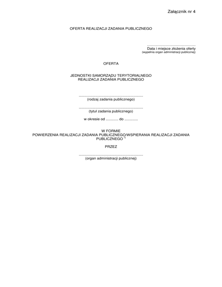Załącznik nr 4 OFERTA REALIZACJI ZADANIA PUBLICZNEGO ………………………………… Data i miejsce złożenia oferty (wypełnia organ administracji publicznej) OFERTA JEDNOSTKI SAMORZĄDU TERYTORIALNEGO REALIZACJI ZADANIA PUBLICZNEGO .............................................................. (rodzaj zadania publicznego) .............................................................. (tytuł zadania publicznego) w okresie od ............ do ............. W FORMIE POWIERZENIA REALIZACJI ZADANIA PUBLICZNEGO/WSPIERANIA REALIZACJI ZADANIA 1) PUBLICZNEGO PRZEZ .............................................................. (organ administracji publicznej) I. Dane oferenta 1) nazwa: .................................................................................................................................................. 2) nr NIP: ............................................................. nr REGON: ................................................................. 3) adres: miejscowość: ........................................................ ul.: .......................................................................... 2) dzielnica lub inna jednostka pomocnicza: .......................................................................................... 3) gmina: ......................................................... powiat: .......................................................................... województwo: ....................................................................................................................................... kod pocztowy: ............................................. poczta ............................................................................. 4) tel.: .............................................................. faks: ................................................................................ e-mail: ......................................................... http:// ............................................................................... 5) numer rachunku bankowego: …………………………………….……………………............................... nazwa banku: ……………………………………………………….......................................................... 6) nazwiska i imiona osób upoważnionych do reprezentowania oferenta: a) ……………………….................................................................................................................... b) …………………………………………………………………………………………………………..... c) ………………………………………………………………………………………………………....…. 7) nazwa, adres i telefon kontaktowy jednostki organizacyjnej bezpośrednio wykonującej zadanie, o którym mowa w ofercie: ..................................................................................................................................................... 8) osoba upoważniona do składania wyjaśnień dotyczących oferty (imię i nazwisko oraz nr telefonu kontaktowego) ............................................................................................................................................................ II. Szczegółowy zakres rzeczowy zadania publicznego proponowanego do realizacji 1. Krótka charakterystyka zadania publicznego 2 2. Opis potrzeb wskazujących na konieczność wykonania zadania publicznego, opis ich przyczyn oraz skutków 3. Opis grup adresatów zadania publicznego 4. Uzasadnienie potrzeby dofinansowania z dotacji inwestycji związanych z realizacją zadania publicznego, w szczególności ze wskazaniem w jaki sposób przyczyni się to do podwyższenia 4) standardu realizacji zadania. 5. Informacja, czy w ciągu ostatnich 5 lat oferent otrzymał dotację na dofinansowanie inwestycji związanych z realizacją zadania publicznego z podaniem inwestycji, które zostały dofinansowane, 4) organu który udzielił dofinansowania oraz daty otrzymania dotacji. 6. Zakładane cele realizacji zadania publicznego oraz sposób ich realizacji 7. Miejsce realizacji zadania publicznego 3 8. Opis poszczególnych działań w zakresie realizacji zadania publicznego 9. Harmonogram 5) 6) Zadanie publiczne realizowane w okresie od……………… do………………… Poszczególne działania w zakresie Terminy realizacji realizowanego zadania poszczególnych 7) publicznego działań Oferent lub inny podmiot odpowiedzialny za działanie w zakresie realizowanego zadania publicznego 10. Zakładane rezultaty realizacji zadania publicznego 8) III. Kalkulacja przewidywanych kosztów realizacji zadania publicznego I Koszt całkowity (w zł) Rodzaj miary Ilość jednostek Lp. Rodzaj kosztów9) Koszt jednostkowy (w zł) 1. Kosztorys ze względu na rodzaj kosztów: z tego do pokrycia z wnioskowanej dotacji (w zł) z tego z finansowych środków własnych, środków z innych źródeł , w tym wpłat i opłat adresatów zadania publicznego 10) (w zł) Koszt do pokrycia z wkładu osobowego, w tym pracy społecznej członków i świadczeń wolontariuszy (w zł) Koszty merytoryczne11) po stronie …(nazwa Oferenta): 1) .…….. 2) …….. 4 II Koszty obsługi 12) zadania publicznego, w tym koszty administracyjne po stronie …(nazwa Oferenta) : 1) .…….. 2) …….. III Inne koszty, w tym koszty wyposażenia i promocji po stronie … (nazwa Oferenta) : 1) …….. 2) …….. IV Ogółem: 2. Przewidywane źródła finansowania zadania publicznego 1 2 3 Wnioskowana kwota dotacji ……… zł ……..% ……… zł ……..% ……… zł ……..% ……… zł ……..% ……… zł ……..% ……… zł ……..% ……… zł ……..% ……… zł 100% 10) Środki finansowe własne Środki finansowe z innych źródeł ogółem (środki finansowe wymienione 10) w pkt. 3.1-3.3) 3.1 wpłaty i opłaty adresatów zadania 