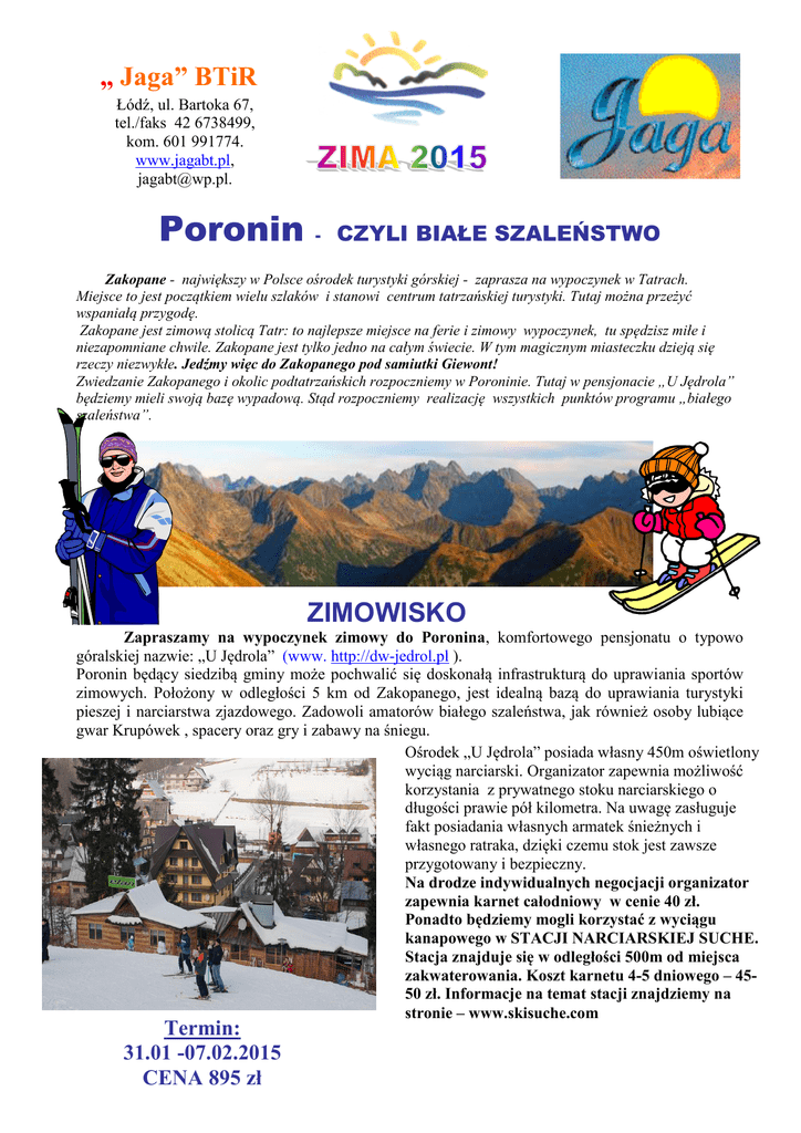 „ Jaga” BTiR Łódź, ul. Bartoka 67, tel./faks 42 6738499, kom. 601 991774. www.jagabt.pl, [email protected]. Poronin - CZYLI BIAŁE SZALEŃSTWO Zakopane - największy w Polsce ośrodek turystyki górskiej - zaprasza na wypoczynek w Tatrach. Miejsce to jest początkiem wielu szlaków i stanowi centrum tatrzańskiej turystyki. Tutaj można przeżyć wspaniałą przygodę. Zakopane jest zimową stolicą Tatr: to najlepsze miejsce na ferie i zimowy wypoczynek, tu spędzisz miłe i niezapomniane chwile. Zakopane jest tylko jedno na całym świecie. W tym magicznym miasteczku dzieją się rzeczy niezwykłe. Jedźmy więc do Zakopanego pod samiutki Giewont! Zwiedzanie Zakopanego i okolic podtatrzańskich rozpoczniemy w Poroninie. Tutaj w pensjonacie „U Jędrola” będziemy mieli swoją bazę wypadową. Stąd rozpoczniemy realizację wszystkich punktów programu „białego szaleństwa”. ZIMOWISKO Zapraszamy na wypoczynek zimowy do Poronina, komfortowego pensjonatu o typowo góralskiej nazwie: „U Jędrola” (www. http://dw-jedrol.pl ). Poronin będący siedzibą gminy może pochwalić się doskonałą infrastrukturą do uprawiania sportów zimowych. Położony w odległości 5 km od Zakopanego, jest idealną bazą do uprawiania turystyki pieszej i narciarstwa zjazdowego. Zadowoli amatorów białego szaleństwa, jak również osoby lubiące gwar Krupówek , spacery oraz gry i zabawy na śniegu. Ośrodek „U Jędrola” posiada własny 450m oświetlony wyciąg narciarski. Organizator zapewnia możliwość korzystania z prywatnego stoku narciarskiego o długości prawie pół kilometra. Na uwagę zasługuje fakt posiadania własnych armatek śnieżnych i własnego ratraka, dzięki czemu stok jest zawsze przygotowany i bezpieczny. Na drodze indywidualnych negocjacji organizator zapewnia karnet całodniowy w cenie 40 zł. Ponadto będziemy mogli korzystać z wyciągu kanapowego w STACJI NARCIARSKIEJ SUCHE. Stacja znajduje się w odległości 500m od miejsca zakwaterowania. Koszt karnetu 4-5 dniowego – 4550 zł. Informacje na temat stacji znajdziemy na stronie – www.skisuche.com Termin: 31.01 -07.02.2015 CENA 895 zł PROGRAM. Dzień 1. Zbiórka na parkingu przy stadionie Widzewa o godz. 7.30. Wyjazd 8.00. Przejazd autokarem na trasie Łódź- Poronin. Przyjazd do Poronina. Zakwaterowanie w pensjonacie” U Jędrola”. Obiadokolacja. Spacer po najbliższej okolicy miejsca zakwaterowania. Dzień 2-7. Realizacja programu rekreacyjnego. Gry i zabawy na śniegu, sanki, jazda na nartach. Dla odważnych i lubiących wesołą zabawę polecamy zjazdy na „beleczym”. Autokarowa wycieczka do Zakopanego. Spacer po najbardziej znanej ulicy Podhala Krupówkch. Przejazd do Niedzicy. Zwiedzanie pod opieką przewodnika zamku oraz elektrowni wodnej w Niedzicy. Dzień 8. Śniadanie, pożegnanie ulubionych miejsc. Przejazd na trasie Poronin- Łódź. Przyjazd w godzinach wieczornych do Łodzi. Zakończenie imprezy. ŚWIADCZENIA. 1. Zakwaterowanie w Domu Wczasowym „U Jędrola” (www. http://dw-jedrol.pl) w pokojach 2,3, 4, 5 osobowych z łazienkami. Każdy pokój wyposażony jest w telewizor. 2. Doskonałe domowe wyżywienie ( śniadanie, obiad, kolacja). 3. Transport autokarem. 4. Ubezpieczenie NNW . 5. Opiekę wykwalifikowanej kadry pedagogicznej. 6. Możliwość korzystania ze świetlicy wyposażonej w stół do tenisa stołowego. 7. Korzystanie z basenu znajdującego się w Domu Wczasowym. 8. Realizacja ciekawego programu rekreacyjnego. Wycieczka do Zakopanego, spacer po Krupówkach. Przejazd do Niedzicy. Zwiedzanie pod opieką przewodnika zamku oraz elektrowni wodnej w Niedzicy. UWAGA CENA NIE ZAWIERA KOSZTÓW ZAKUPU KARNETÓW NARCIARSKICH !!! „Jaga” Biuro Turystyki i Rekreacji Łódź, ul. Bartoka 67, tel./faks 42 6738499, kom. 601 991774. www.jagabt.pl, [email protected].