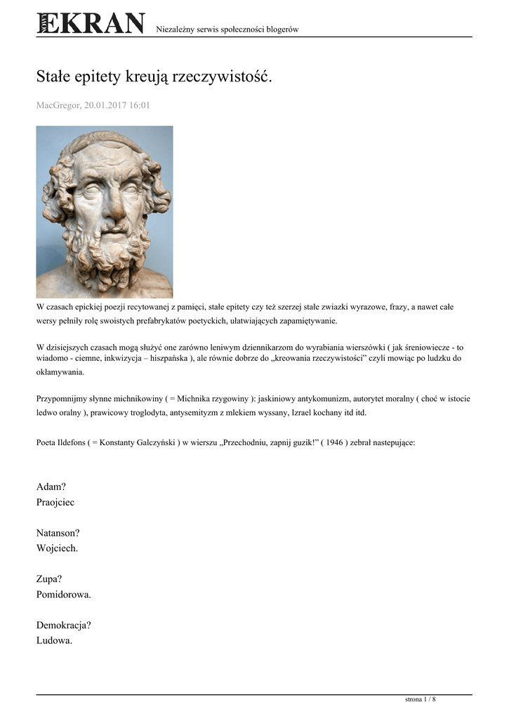 Niezależny serwis społeczności blogerów Stałe epitety kreują rzeczywistość. MacGregor, 20.01.2017 16:01 W czasach epickiej poezji recytowanej z pamięci, stałe epitety czy też szerzej stałe zwiazki wyrazowe, frazy, a nawet całe wersy pełniły rolę swoistych prefabrykatów poetyckich, ułatwiających zapamiętywanie. W dzisiejszych czasach mogą służyć one zarówno leniwym dziennikarzom do wyrabiania wierszówki ( jak śreniowiecze - to wiadomo - ciemne, inkwizycja – hiszpańska ), ale równie dobrze do „kreowania rzeczywistości” czyli mowiąc po ludzku do okłamywania. Przypomnijmy słynne michnikowiny ( = Michnika rzygowiny ): jaskiniowy antykomunizm, autorytet moralny ( choć w istocie ledwo oralny ), prawicowy troglodyta, antysemityzm z mlekiem wyssany, Izrael kochany itd itd. Poeta Ildefons ( = Konstanty Galczyński ) w wierszu „Przechodniu, zapnij guzik!” ( 1946 ) zebrał nastepujące: Adam? Praojciec Natanson? Wojciech. Zupa? Pomidorowa. Demokracja? Ludowa. strona 1 / 8 Niezależny serwis społeczności blogerów Gojawiczyńska? Pola. Kkopernik? Polak. Przystanek? Tramwajowy. Materializm? Dziejowy. Nie damy? Odry, Nysy. Juliusz Cezar? Łysy. Twierdzenie? Pitagorasa. Od Sasa? Do lasa. „Pchła-szachrajka”? Brzechwy. Tygodnik? Powszechny. Kisiel? Patrz: Potrawy. Odbudowa? Warszawy. Termometr? strona 2 / 8 Niezależny serwis społeczności blogerów Réamura. Oświata? I kultura. Przechodniu? Stój. Mąż tej pani? Myśliciel. Dostojewski? „Idiota”. Nad i kropka? U Kotta. Ilustracja? Dorégo. Pan nie lubi? Dlaczego? Cudowna? Polska mowa. Bomba? Atomowa. Niemcy? Pobici? Rozbiory? Jezuici. Piąte koło? U woza. strona 3 / 8 Niezależny serwis społeczności blogerów Żukrowski? Świetna proza. Ja? Wariat. Idzie żołnierz? Borem lasem. Stary Fredro? „Precz z kutasem”. Hemar? W czamarze. Szkoda słów? O Hemarze. Reforma? Rolna. Jan? Z Kolna. Jajko? Kolumba. Flukowski? Tarabumba. Ładosz? Znakomicie. Szumią jodły? Na szczycie. Ziemie? Odzyskane. strona 4 / 8 Niezależny serwis społeczności blogerów Szopen? Z fortepianem. Gęś? Zielona. Grupa? Laokoona. Forsę? Przepili. Muzyczka? Tirli-tirli. Samozwaniec? Magdalena? Kwiatkowska? Irena. Na plamy? Terpentyna. Żelazna? Kurtyna. W co biją? W tarabany. Jaki ojciec? Zapłakany. Kiedy umarł? O trzeciej. Ratujmy? strona 5 / 8 Niezależny serwis społeczności blogerów Dzieci. Na cholerę? Mickiewicz. A Wyspiański? Patrz: Minkiewicz. Małe wiśnie? Wisienki. Zakazane? Piosenki. Szaflarska? Wesoła. Kwadratura? Koła. Mikołajczyk? ?? Pan Antoni Buchała w „Do Rzeczy” ( Stałe epitety, czyli jak język kreuje rzeczywistość ) zwraca uwagę na używanie stałych epitetów w prasie niemieckiej wobec niezaakceptowanych przez nich władz polskich: W ich tekstach dotyczących Polski nazwa naszego rządu lub rządzącej partii występuje niemal bez wyjątku z określeniem „nacjonalistyczno – konserwatywny” (nationalkonservative PiS-Regierung”). Z użyciem tego epitetu próbują opisać sytuację polityczną w naszym kraju, wielokrotnie go stosują, przeprowadzając wywiady ze swoimi polskimi kolegami, a nawet z członkami rządu (zob. rozmowa z Mateuszem Morawieckim w „Neue Züricher Zeitung”). Warto pamiętać, że ów epitet w języku niemieckim brzmi niemal jak obelga lub nazwa społecznej choroby, na którą nasi sąsiedzi, jak głoszą, są wyjątkowo uodpornieni po jej ostrym ataku, którego doświadczyli w latach 1933 – 1945. ( ... ) np. „Dlaczego nacjonalistyczno – konserwatywny rząd PiS niszczy demokrację?” ). Prawdą jest, że przeciętny niemiecki półgłowek naprawdę myśli, że w Polsce pod rządami „Kartofla” strona 6 / 8 Niezależny serwis społeczności blogerów panuje zamordyzm, zaś przeciwnicy polityczni gniją w „polskich obozach koncetracyjnych” ( to ostatnie określenie, wymyślone przez post-hitlerowski wywiad, jest w swojej prostocie majstersztykiem ). Ale niestety, nie tylko Michnik i nie tylko prasa niemiecka. Za wyjątkowo haniebne uważam stałe i konsekwentne ( przynajmniej dopóki tam zaglądałem ) używanie przez portal wPolityce określeń: bojownicy ukraińscy ( w odniesieniu do nazistowskich bandytów z Ajdaru czy innych banderowskich ugrupowań zbrojnych ) oraz „prorosyjscy terroryści” ( w odniesieniu nawet do ludności cywilnej Donbasu ). Presstytutki i tyle i mam ich w tyle i żeby ich banderowcy ugościli po swojemu czyli widłami w plecy. PS Natrafilem na cudny wierszyk angielski: Polyphloisboisterous Homer of old Threw all his augments into the sea, Although he had often been courteously told That perfect imperfects begin with an e. But the poet replied with a dignified air, "What the Digamma does anyone care?" Then he sat himself down by the wine-dark sea And composed some books of his Odyssey. [ wierszyk wymagający do zrozumienia liźnięcia antycznej greki: „polyphloisboisterous” to żartobliwa zbitka wyrazowa ( portmanteau word ) od-homerowego „polyphloesboean” ( hałaśliwe, ryczące [ scil. morze ] ) i angielskiego boisterous( burzliwy, hałasliwy ) Augmentum e- służy w klasycznej grece do regularnego tworzenia form czasu przeszłego ( u Homera przeważnie jeszcze nie wystepuje ) Digamma ( podwójna Gamma ) to archaiczna litera, wymawiana jak polskie ( lub angielskie ) „w”, która w języku klasycznym zanikła ( odrodziła się dzięki Rzymianom jako litera F ) strona 7 / 8 Niezależny serwis społeczności blogerów Said the poet Homer: What a delicious aroma! It smells as though a town were being burnt down. strona 8 / 8 Powered by TCPDF (www.tcpdf.org)