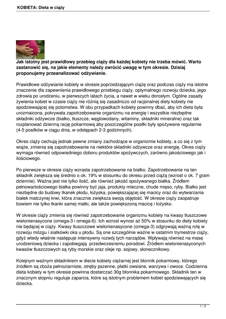 KOBIETA: Dieta w ciąży Jak istotny jest prawidłowy przebieg ciąży dla każdej kobiety nie trzeba mówić. Warto zastanowić się, na jakie elementy należy zwrócić uwagę w tym okresie. Dzisiaj proponujemy przeanalizować odżywianie. Prawidłowe odżywianie kobiety w okresie poprzedzającym ciążę oraz podczas ciąży ma istotne znaczenie dla zapewnienia prawidłowego przebiegu ciąży, optymalnego rozwoju dziecka, jego zdrowia po urodzeniu, w pierwszych latach życia, a nawet w wieku dorosłym. Ogólne zasady żywienia kobiet w czasie ciąży nie różnią się zasadniczo od racjonalnej diety kobiety nie spodziewającej się potomstwa. W obu przypadkach kobiety powinny dbać, aby ich dieta była urozmaicona, pokrywała zapotrzebowanie organizmu na energię i wszystkie niezbędne składniki odżywcze (białko, tłuszcze, węglowodany, witaminy, składniki mineralne) oraz tak rozplanować dzienną rację pokarmową aby poszczególne posiłki były spożywane regularnie (4-5 posiłków w ciągu dnia, w odstępach 2-3 godzinnych). Okres ciąży cechują jednak pewne zmiany zachodzące w organizmie kobiety, a co się z tym wiąże, zmienia się zapotrzebowanie na niektóre składniki odżywcze oraz energię. Okres ciąży wymaga również odpowiedniego doboru produktów spożywczych, zarówno jakościowego jak i ilościowego. Po pierwsze w okresie ciąży wzrasta zapotrzebowanie na białko. Zapotrzebowanie na ten składnik zwiększa się średnio o ok. 19% w stosunku do okresu przed ciążą (wzrost o ok. 7 gram dziennie). Ważna jest nie tylko ilość, ale również jakość spożywanego białka. Źródłem pełnowartościowego białka powinny być jaja, produkty mleczne, chude mięso, ryby. Białko jest niezbędne do budowy tkanek płodu, łożyska, powiększającej się macicy oraz do wytwarzania białek matczynej krwi, która znacznie zwiększa swoją objętość. W okresie ciąży zaopatruje bowiem nie tylko tkanki samej matki, ale także powiększoną macicę i łożysko. W okresie ciąży zmienia się również zapotrzebowanie organizmu kobiety na kwasy tłuszczowe wielonienasycone (omega-3 i omega-6). Ich wzrost wynosi aż 50% w stosunku do diety kobiety nie będącej w ciąży. Kwasy tłuszczowe wielonienasycone (omega-3) odgrywają ważną rolę w rozwoju mózgu i siatkówki oka u płodu. Są one szczególnie ważne w ostatnim trymestrze ciąży, gdyż wtedy właśnie następuje intensywny rozwój tych narządów. Wpływają również na masę urodzeniową dziecka i zapobiegają przedwczesnemu porodowi. Źródłem wielonienasyconych kwasów tłuszczowych są ryby morskie oraz oleje np. sojowy, słonecznikowy. Kolejnym ważnym składnikiem w diecie kobiety ciężarnej jest błonnik pokarmowy, którego źródłem są zboża pełnoziarniste, otręby pszenne, płatki owsiane, warzywa i owoce. Codzienna dieta kobiety w tym okresie powinna dostarczać 30g błonnika pokarmowego. Składnik ten w znacznym stopniu reguluje zaparcia, które są istotnym problemem kobiet spodziewających się dziecka. 1/2 KOBIETA: Dieta w ciąży W okresie ciąży wzrasta również zapotrzebowanie na witaminy rozpuszczalne w wodzie: witaminę C o ok. 13% (owoce cytrusowe, pomidory ziemniaki), witaminę B2 o ok. 33% (produkty mleczne, pełnoziarniste pieczywo), witaminę B6 o ok. 50% (ziarna pszenicy i żyta, drożdże, ryby), witaminę B12 o ok. 33% (jaja, produkty mleczne), kwas foliowy o ok. 55% (suche kiełki, soczewica, pomarańcze, pełnoziarniste pieczywo, buraki, brokuły, szpinak) oraz witaminy rozpuszczalne w tłuszczach: witaminę A o ok. 56% (marchew, szpinak, mleko, sery) i witaminę E o ok. 20% (oleje roślinne, mięso, mleko, sałata, ziarna zbóż, żółtko jaja). Kwas foliowy jest istotnym składnikiem w diecie kobiet w okresie przed ciążą oraz w pierwszych tygodniach ciąży, gdyż jego niedobór sprzyja powstawaniu wrodzonych wad układu nerwowego u płodu. Składnik ten chroni również organizm kobiety przed porodem przedwczesnym oraz wystąpieniem niskiej masy urodzeniowej u dziecka. Dla kobiet w okresie ciąży zmienia się także zapotrzebowanie na wiele składników mineralnych: wapń, wzrost o ok. 33% (mleko i przetwory mleczne), magnez o ok. 17% (płatki owsiane, kasza gryczana, otręby pszenne, zarodki pszenne), cynk o ok. 23% (mięso, mleko i jego przetwory, pełnoziarniste produkty zbożowe, nasiona roślin strączkowych, jaja), żelazo o ok. 44% (mięso wołowe, żółtko jaja, płatki owsiane, fasola, orzechy, szpinak) oraz jod o ok. 13% (sól spożywcza, wzbogacana jodkiem potasu). Wymienione składniki mineralne m.in. zapobiegają przedwczesnemu porodowi (wapń, magnez, żelazo, cynk, jod), umożliwiają prawidłowy rozwój masy kostnej dziecka (wapń), zmniejszają ryzyko małej masy urodzeniowej dziecka (magnez, żelazo, cynk), umożliwiają prawidłowe wytwarzanie krwi przez płód (żelazo), zapobiegają zaburzeniom rozwoju psychomotorycznego dziecka (jod) oraz umożliwiają prawidłowy rozwój układu immunologicznego (cynk). Zapotrzebowanie energetyczne kobiet w pierwszym trymestrze ciąży nie zmienia się i jest takie samo jak dla kobiet przed ciąża, wzrasta dopiero w II i III trymestrze ciąży ale jedynie o 300 kcal. Głównym źródłem płynów w diecie kobiety ciężarnej, podobnie jak w diecie kobiety przed ciążą powinna być woda (1,5-2l dziennie). Jednak kobiety będące w ciąży powinny unikać picia kawy i mocnej herbaty, ze względu na zawartość kofeiny. Nie wskazane jest również picie napojów alkoholowych. Spożywanie nawet niewielkich ilości alkoholu może sprzyjać wadom rozwojowym płodu, a także komplikacjom podczas ciąży i porodu. Unikać należy również słodzonych napojów gazowanych typu cola, fanta, oranżada. W czasie ciąży nie należy spożywać także serów pleśniowych, typu brie i camembert, ze względu na ryzyko zakażenia bakterią zwaną listeria, surowych jaj ze względu na ryzyko zakażenia salmonellą ora