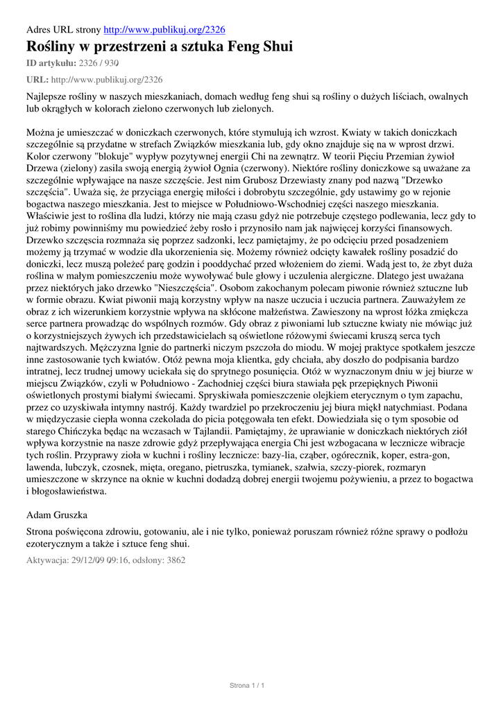 Adres URL strony http://www.publikuj.org/2326 Rośliny w przestrzeni a sztuka Feng Shui ID artykułu: 2326 / 930 URL: http://www.publikuj.org/2326 Najlepsze rośliny w naszych mieszkaniach, domach według feng shui są rośliny o dużych liściach, owalnych lub okrągłych w kolorach zielono czerwonych lub zielonych. Można je umieszczać w doniczkach czerwonych, które stymulują ich wzrost. Kwiaty w takich doniczkach szczególnie są przydatne w strefach Związków mieszkania lub, gdy okno znajduje się na w wprost drzwi. Kolor czerwony "blokuje" wypływ pozytywnej energii Chi na zewnątrz. W teorii Pięciu Przemian żywioł Drzewa (zielony) zasila swoją energią żywioł Ognia (czerwony). Niektóre rośliny doniczkowe są uważane za szczególnie wpływające na nasze szczęście. Jest nim Grubosz Drzewiasty znany pod nazwą "Drzewko szczęścia". Uważa się, że przyciąga energię miłości i dobrobytu szczególnie, gdy ustawimy go w rejonie bogactwa naszego mieszkania. Jest to miejsce w Południowo-Wschodniej części naszego mieszkania. Właściwie jest to roślina dla ludzi, którzy nie mają czasu gdyż nie potrzebuje częstego podlewania, lecz gdy to już robimy powinniśmy mu powiedzieć żeby rosło i przynosiło nam jak najwięcej korzyści finansowych. Drzewko szczęscia rozmnaża się poprzez sadzonki, lecz pamiętajmy, że po odcięciu przed posadzeniem możemy ją trzymać w wodzie dla ukorzenienia się. Możemy również odcięty kawałek rośliny posadzić do doniczki, lecz muszą poleżeć parę godzin i pooddychać przed włożeniem do ziemi. Wadą jest to, że zbyt duża roślina w małym pomieszczeniu może wywoływać bule głowy i uczulenia alergiczne. Dlatego jest uważana przez niektórych jako drzewko "Nieszczęścia". Osobom zakochanym polecam piwonie również sztuczne lub w formie obrazu. Kwiat piwonii mają korzystny wpływ na nasze uczucia i uczucia partnera. Zauważyłem ze obraz z ich wizerunkiem korzystnie wpływa na skłócone małżeństwa. Zawieszony na wprost łóżka zmiękcza serce partnera prowadząc do wspólnych rozmów. Gdy obraz z piwoniami lub sztuczne kwiaty nie mówiąc już o korzystniejszych żywych ich przedstawicielach są oświetlone różowymi świecami kruszą serca tych najtwardszych. Mężczyzna lgnie do partnerki niczym pszczoła do miodu. W mojej praktyce spotkałem jeszcze inne zastosowanie tych kwiatów. Otóż pewna moja klientka, gdy chciała, aby doszło do podpisania bardzo intratnej, lecz trudnej umowy uciekała się do sprytnego posunięcia. Otóż w wyznaczonym dniu w jej biurze w miejscu Związków, czyli w Południowo - Zachodniej części biura stawiała pęk przepięknych Piwonii oświetlonych prostymi białymi świecami. Spryskiwała pomieszczenie olejkiem eterycznym o tym zapachu, przez co uzyskiwała intymny nastrój. Każdy twardziel po przekroczeniu jej biura miękł natychmiast. Podana w międzyczasie ciepła wonna czekolada do picia potęgowała ten efekt. Dowiedziała się o tym sposobie od starego Chińczyka będąc na wczasach w Tajlandii. Pamiętajmy, że uprawianie w doniczkach niektórych ziół wpływa korzystnie na nasze zdrowie gdyż przepływająca energia Chi jest wzbogacana w lecznicze wibracje tych roślin. Przyprawy zioła w kuchni i rośliny lecznicze: bazy-lia, cząber, ogórecznik, koper, estra-gon, lawenda, lubczyk, czosnek, mięta, oregano, pietruszka, tymianek, szałwia, szczy-piorek, rozmaryn umieszczone w skrzynce na oknie w kuchni dodadzą dobrej energii twojemu pożywieniu, a przez to bogactwa i błogosławieństwa. Adam Gruszka Strona poświęcona zdrowiu, gotowaniu, ale i nie tylko, ponieważ poruszam również różne sprawy o podłożu ezoterycznym a także i sztuce feng shui. Aktywacja: 29/12/09 09:16, odsłony: 3862 Strona 1 / 1