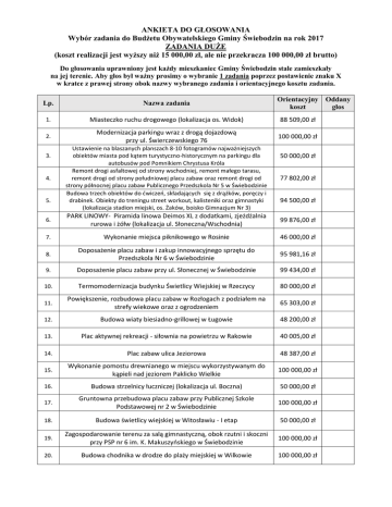 ANKIETA DO GŁOSOWANIA Wybór zadania do Budżetu Obywatelskiego Gminy Świebodzin na rok 2017 ZADANIA DUŻE (koszt realizacji jest wyższy niż 15 000,00 zł, ale nie przekracza 100 000,00 zł brutto) Do głosowania uprawniony jest każdy mieszkaniec Gminy Świebodzin stale zamieszkały na jej terenie. Aby głos był ważny prosimy o wybranie 1 zadania poprzez postawienie znaku X w kratce z prawej strony obok nazwy wybranego zadania i orientacyjnego kosztu zadania. Orientacyjny Oddany koszt głos Lp. Nazwa zadania 1. Miasteczko ruchu drogowego (lokalizacja os. Widok) 88 509,00 zł 2. Modernizacja parkingu wraz z drogą dojazdową przy ul. Świerczewskiego 76 100 000,00 zł 3. 4. 5. Ustawienie na blaszanych planszach 8-10 fotogramów najważniejszych obiektów miasta pod kątem turystyczno-historycznym na parkingu dla autobusów pod Pomnikiem Chrystusa Króla Remont drogi asfaltowej od strony wschodniej, remont małego tarasu, remont drogi od strony południowej placu zabaw oraz remont drogi od strony północnej placu zabaw Publicznego Przedszkola Nr 5 w Świebodzinie Budowa trzech obiektów do ćwiczeń, składających się z drążków, poręczy i drabinek. Obiekty do treningu street workout, kalisteniki oraz gimnastyki (lokalizacja stadion miejski, os. Żaków, boisko Gimnazjum Nr 3) 50 000,00 zł 77 802,00 zł 94 500,00 zł 6. PARK LINOWY- Piramida linowa Deimos XL z dodatkami, zjeżdżalnia rurowa i żółw (lokalizacja ul. Słoneczna/Wschodnia) 99 876,00 zł 7. Wykonanie miejsca piknikowego w Rosinie 46 000,00 zł 8. Doposażenie placu zabaw i zakup innowacyjnego sprzętu do Przedszkola Nr 6 w Świebodzinie 95 981,16 zł 9. Doposażenie placu zabaw przy ul. Słonecznej w Świebodzinie 99 434,00 zł 10. Termomodernizacja budynku Świetlicy Wiejskiej w Rzeczycy 80 000,00 zł 11. Powiększenie, rozbudowa placu zabaw w Rozłogach z podziałem na strefy wiekowe oraz z ogrodzeniem 65 303,00 zł 12. Budowa wiaty biesiadno-grillowej w Ługowie 48 200,00 zł 13. Plac aktywnej rekreacji - siłownia na powietrzu w Rakowie 40 005,00 zł 14. Plac zabaw ulica Jeziorowa 48 387,00 zł 15. Wykonanie pomostu drewnianego w miejscu wykorzystywanym do kąpieli nad jeziorem Paklicko Wielkie 100 000,00 zł 16. Budowa strzelnicy łuczniczej (lokalizacja ul. Boczna) 50 000,00 zł 17. Gruntowna przebudowa placu zabaw przy Publicznej Szkole Podstawowej nr 2 w Świebodzinie 100 000,00 zł 18. Budowa świetlicy wiejskiej w Witosławiu - I etap 50 000,00 zł 19. Zagospodarowanie terenu za salą gimnastyczną, obok rzutni i skoczni przy PSP nr 6 im. K. Makuszyńskiego w Świebodzinie 100 000,00 zł 20. Budowa chodnika w drodze do plaży miejskiej w Wilkowie 100 000,00 zł 21. Wykonanie remontu powierzchni podwórka przy ul. Żymierskiego 17 80 000,00 zł 22. Świebodzińska Ścieżka Turystyczna - wykonanie i montaż tablic z opisem atrakcji turystycznych miasta w języku polskim, angielskim i niemieckim 45 000,00 zł 23. 24. 25. 26. 27. 28. 29. Mural na ścianie przyległej do Urzędu Miejskiego w Świebodzinie od strony parkingu Remont głównego wejścia i schodów głównych oraz bocznych do Publicznego Gimnazjum nr 3 im. Cz. Niemena w Świebodzinie Budowa wiaty w Lubinicku do wykorzystania dla celów integracyjnorekreacyjno-rozrywkowych Oświetlenie uliczne od ul. Młyńskiej w Świebodzinie w kierunku Grodziszcza SKATEPARK - Nowe możliwości (lokalizacja stadion miejski) Modernizacja elewacji części budynku Biblioteki Publicznej w Świebodzinie Budowa "Mini Miasteczka Ruchu Drogowego dla Przedszkolaków" (lokalizacja Przedszkole Nr 3) 51 000,00 zł 58 000,00 zł 96 432,00 zł 100 000,00 zł 98 680,00 zł 73 700,00 zł 50 000,00 zł Dane głosującego (prosimy wypełnić drukowanymi literami): Imię ……………………………………………………………… Nazwisko ………………………………………………………... Adres zamieszkania: …………………………………………………………...................................... ………………………………………………………………………………………………………… …………………………………………………… Data i własnoręczny podpis głosującego W przypadku osoby niepełnoletniej wymagana jest zgoda opiekuna prawnego na udział w konsultacjach społecznych dotyczących Budżetu Obywatelskiego Gminy Świebodzin na rok 2017, potwierdzona własnoręcznym podpisem opiekuna prawnego. ………………………………………………… ………………………………………………… Imię i nazwisko opiekuna prawnego Data i własnoręczny podpis opiekuna prawnego