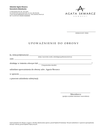 Adwokat Agata Skwarcz Kancelaria Adwokacka ul. Wieniawska 6/13, 20 – 071 Lublin tel. 81 563 33 33, fax 81 563 33 46, tel. kom. 664 781 564 e-mail: [email protected], www.adwokat.skwarcz.pl NIP: 712 297 40 37, REGON: 061604650 _____________________________ (miejscowość i data) UPOWAŻNIENIE DO OBRONY Ja, niżej podpisany(a) _______________________________________________________________ (imię i nazwisko osoby udzielającej pełnomocnictwa) zam. ______________________________________________________________________________ działając w imieniu własnym lub ______________________________________________________* (*niepotrzebne skreślić) udzielam upoważnienia do obrony adw. Agacie Skwarcz w sprawie ________________________________________________________________________ z prawem udzielenia substytucji. ______________________________ Mocodawca (podpis czytelnie imieniem i nazwiskiem) Upoważnienie do obrony wygasa z chwilą zakończenia sprawy przed Sądem II instancji. Nie jest udzielone w sprawie sporządzenia kasacji i obrony przed Sądem Najwyższym.