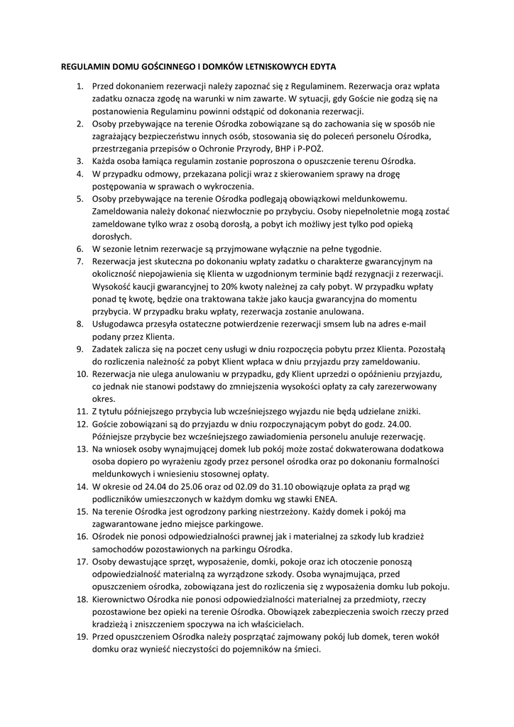 REGULAMIN DOMU GOŚCINNEGO I DOMKÓW LETNISKOWYCH EDYTA 1. Przed dokonaniem rezerwacji należy zapoznać się z Regulaminem. Rezerwacja oraz wpłata zadatku oznacza zgodę na warunki w nim zawarte. W sytuacji, gdy Goście nie godzą się na postanowienia Regulaminu powinni odstąpić od dokonania rezerwacji. 2. Osoby przebywające na terenie Ośrodka zobowiązane są do zachowania się w sposób nie zagrażający bezpieczeństwu innych osób, stosowania się do poleceń personelu Ośrodka, przestrzegania przepisów o Ochronie Przyrody, BHP i P-POŻ. 3. Każda osoba łamiąca regulamin zostanie poproszona o opuszczenie terenu Ośrodka. 4. W przypadku odmowy, przekazana policji wraz z skierowaniem sprawy na drogę postępowania w sprawach o wykroczenia. 5. Osoby przebywające na terenie Ośrodka podlegają obowiązkowi meldunkowemu. Zameldowania należy dokonać niezwłocznie po przybyciu. Osoby niepełnoletnie mogą zostać zameldowane tylko wraz z osobą dorosłą, a pobyt ich możliwy jest tylko pod opieką dorosłych. 6. W sezonie letnim rezerwacje są przyjmowane wyłącznie na pełne tygodnie. 7. Rezerwacja jest skuteczna po dokonaniu wpłaty zadatku o charakterze gwarancyjnym na okoliczność niepojawienia się Klienta w uzgodnionym terminie bądź rezygnacji z rezerwacji. Wysokość kaucji gwarancyjnej to 20% kwoty należnej za cały pobyt. W przypadku wpłaty ponad tę kwotę, będzie ona traktowana także jako kaucja gwarancyjna do momentu przybycia. W przypadku braku wpłaty, rezerwacja zostanie anulowana. 8. Usługodawca przesyła ostateczne potwierdzenie rezerwacji smsem lub na adres e-mail podany przez Klienta. 9. Zadatek zalicza się na poczet ceny usługi w dniu rozpoczęcia pobytu przez Klienta. Pozostałą do rozliczenia należność za pobyt Klient wpłaca w dniu przyjazdu przy zameldowaniu. 10. Rezerwacja nie ulega anulowaniu w przypadku, gdy Klient uprzedzi o opóźnieniu przyjazdu, co jednak nie stanowi podstawy do zmniejszenia wysokości opłaty za cały zarezerwowany okres. 11. Z tytułu późniejszego przybycia lub wcześniejszego wyjazdu nie będą udzielane zniżki. 12. Goście zobowiązani są do przyjazdu w dniu rozpoczynającym pobyt do godz. 24.00. Późniejsze przybycie bez wcześniejszego zawiadomienia personelu anuluje rezerwację. 13. Na wniosek osoby wynajmującej domek lub pokój może zostać dokwaterowana dodatkowa osoba dopiero po wyrażeniu zgody przez personel ośrodka oraz po dokonaniu formalności meldunkowych i wniesieniu stosownej opłaty. 14. W okresie od 24.04 do 25.06 oraz od 02.09 do 31.10 obowiązuje opłata za prąd wg podliczników umieszczonych w każdym domku wg stawki ENEA. 15. Na terenie Ośrodka jest ogrodzony parking niestrzeżony. Każdy domek i pokój ma zagwarantowane jedno miejsce parkingowe. 16. Ośrodek nie ponosi odpowiedzialności prawnej jak i materialnej za szkody lub kradzież samochodów pozostawionych na parkingu Ośrodka. 17. Osoby dewastujące sprzęt, wyposażenie, domki, pokoje oraz ich otoczenie ponoszą odpowiedzialność materialną za wyrządzone szkody. Osoba wynajmująca, przed opuszczeniem ośrodka, zobowiązana jest do rozliczenia się z wyposażenia domku lub pokoju. 18. Kierownictwo Ośrodka nie ponosi odpowiedzialności materialnej za przedmioty, rzeczy pozostawione bez opieki na terenie Ośrodka. Obowiązek zabezpieczenia swoich rzeczy przed kradzieżą i zniszczeniem spoczywa na ich właścicielach. 19. Przed opuszczeniem Ośrodka należy posprzątać zajmowany pokój lub domek, teren wokół domku oraz wynieść nieczystości do pojemników na śmieci. 20. Palenie ognisk i rozpalanie grilli możliwe jest tylko w miejscach wyznaczonych przez obsługę Ośrodka z zachowaniem szczególnej ostrożności i przepisów P-POŻ. 21. W domkach i pokojach obowiązuje bezwzględny zakaz używania otwartego ognia jak i palenia papierosów. 22. Kierownictwo Ośrodka wyraża zgodę na pobyt w domkach małych zwierząt domowych posiadających aktualne szczepienie jedynie po wcześniejszym uzgodnieniu. Zwierzę na terenie Ośrodka musi być pod pełną kontrolą właściciela (nie może biegać luzem) oraz nie może zakłócać wypoczynku bądź stwarzać zagrożenia dla innych Gości. 23. Za wszelkie zanieczyszczenia terenu oraz materialnie szkody wyrządzone przez posiadane zwierzęta odpowiada jego właściciel. 24. Zabronione jest używanie w obiekcie grzałek i innych urządzeń elektrycznych, nie będących na wyposażeniu. Nie dotyczy to ładowarek i zasilaczy, urządzeń RTV oraz komputerów. 25. Na terenie Ośrodka obowiązuje doba hotelowa i trwa od godziny 16:00 do godziny 10:00 dnia następnego, oraz cisza nocna w godzinach od 23:00 do 7:00. W pozostałych godzinach obowiązuje zachowanie, które nie utrudnia pozostałym Gościom spokojnego wypoczynku. 26. Dzieci pod opieką osób dorosłych i na ich wyłączną odpowiedzialność mogą korzystać z elementów zabawowych znajdujących się na terenie całego Ośrodka. Kąpanie w basenie powinno odbywać się pod nadzorem opiekunów, natomiast trampolina przeznaczona jest jedynie dla dzieci do 16stego roku życia. Z bilarda mogą korzystać osoby dorosłe za ustaloną opłatą. 27. W sprawach nieuregulowanych niniejszym regulaminem decyduje Kierownictwo Ośrodka.