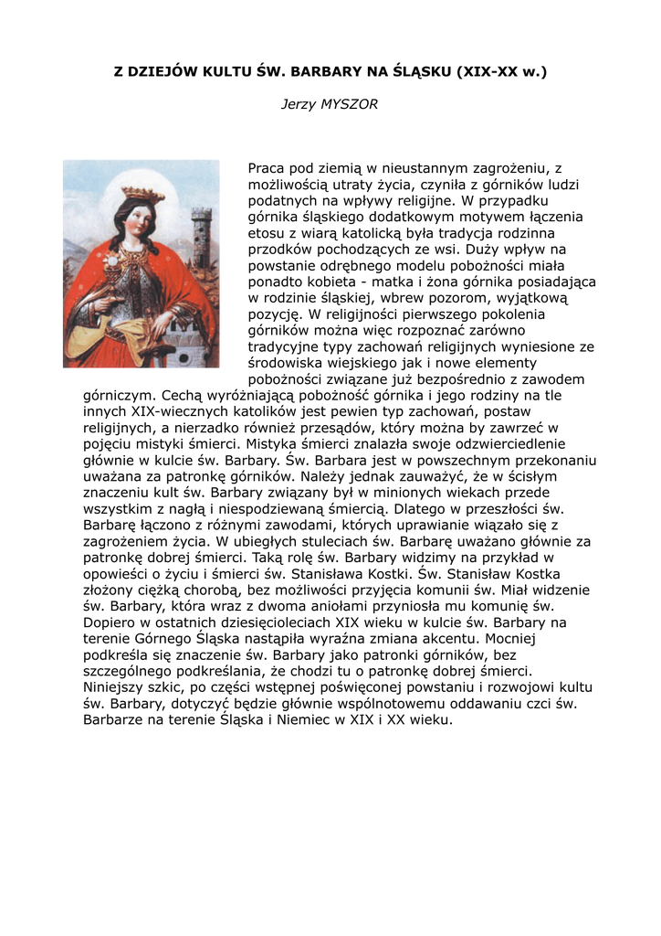 Z DZIEJÓW KULTU ŚW. BARBARY NA ŚLĄSKU (XIX-XX w.) Jerzy MYSZOR Praca pod ziemią w nieustannym zagrożeniu, z możliwością utraty życia, czyniła z górników ludzi podatnych na wpływy religijne. W przypadku górnika śląskiego dodatkowym motywem łączenia etosu z wiarą katolicką była tradycja rodzinna przodków pochodzących ze wsi. Duży wpływ na powstanie odrębnego modelu pobożności miała ponadto kobieta - matka i żona górnika posiadająca w rodzinie śląskiej, wbrew pozorom, wyjątkową pozycję. W religijności pierwszego pokolenia górników można więc rozpoznać zarówno tradycyjne typy zachowań religijnych wyniesione ze środowiska wiejskiego jak i nowe elementy pobożności związane już bezpośrednio z zawodem górniczym. Cechą wyróżniającą pobożność górnika i jego rodziny na tle innych XIX-wiecznych katolików jest pewien typ zachowań, postaw religijnych, a nierzadko również przesądów, który można by zawrzeć w pojęciu mistyki śmierci. Mistyka śmierci znalazła swoje odzwierciedlenie głównie w kulcie św. Barbary. Św. Barbara jest w powszechnym przekonaniu uważana za patronkę górników. Należy jednak zauważyć, że w ścisłym znaczeniu kult św. Barbary związany był w minionych wiekach przede wszystkim z nagłą i niespodziewaną śmiercią. Dlatego w przeszłości św. Barbarę łączono z różnymi zawodami, których uprawianie wiązało się z zagrożeniem życia. W ubiegłych stuleciach św. Barbarę uważano głównie za patronkę dobrej śmierci. Taką rolę św. Barbary widzimy na przykład w opowieści o życiu i śmierci św. Stanisława Kostki. Św. Stanisław Kostka złożony ciężką chorobą, bez możliwości przyjęcia komunii św. Miał widzenie św. Barbary, która wraz z dwoma aniołami przyniosła mu komunię św. Dopiero w ostatnich dziesięcioleciach XIX wieku w kulcie św. Barbary na terenie Górnego Śląska nastąpiła wyraźna zmiana akcentu. Mocniej podkreśla się znaczenie św. Barbary jako patronki górników, bez szczególnego podkreślania, że chodzi tu o patronkę dobrej śmierci. Niniejszy szkic, po części wstępnej poświęconej powstaniu i rozwojowi kultu św. Barbary, dotyczyć będzie głównie wspólnotowemu oddawaniu czci św. Barbarze na terenie Śląska i Niemiec w XIX i XX wieku. Początki i rozwój kultu św. Barbary na Śląsku Imię Barbara pochodzi z greckiego słowa "barbaros" co się tłumaczy przez obcy, cudzoziemiec. Tak żywy w średniowieczu kult św. Barbary, opiera się na bardzo skromnych przekazach historycznych, w dużej części legendarnych, przemieszanych, jak to zwykle bywa, z wydarzeniami autentycznymi. Wymieszanie wątków legendarnych z prawdziwymi stało się powodem, że obecnie jest już rzeczą niemożliwą wyłuskanie ziaren prawdy. Według legend i opowiadań, Barbara była jedyną córką zamożnego poganina imieniem Dioskorus, żyjącego w Nikomedii (Bitynia) lub Hielopolis (Egipt) w III lub IV wieku po Chr. Ojciec Barbary polecił zbudować wieżę, aby w niej umieścić córkę odznaczającą się nieprzeciętną urodą. W wieży, w której przyszło jej żyć św. Barbara kazała wybić trzecie dodatkowe okno. To trzecie okno spełnia w legendzie wyraźnie funkcje symboliczne. Wskazywało na Trójcę św., a więc sygnalizowało kierunek zainteresowań religijnych św. Barbary. Według tradycji Św. Barbara miała otrzymywać nauki w wierze chrześcijańskiej z ust jednego z najwybitniejszych teologów starożytności Orygenesa. Pomimo zakazu ojca przyjęła chrzest. Rozgniewany tą decyzja ojciec ściął ją własnoręcznie mieczem. W chwili śmierci towarzyszył jej anioł. Mord na córce spotkał się z natychmiastową reakcją niebios. Piorun zabił ojca - kata tuż po męczeńskiej śmierci córki. Opowiadanie o życiu i śmierci św. Barbary znalazło się w licznych tekstach liturgicznych, w tym szczególnie w kalendarzach i wspomnieniach liturgicznych kilku diecezji polskich, niemieckich, szwedzkich, a także w diecezji Utrecht i Konstancja. Wszystkie najważniejsze momenty opowiadania staną się atrybutami w ikonografii św. Barbary. Św. Barbara posiada kilka atrybutów. Zwykle jest przedstawiana na tle wieży o trzech oknach (symbol wiary, Trójcy św.) i z mieczem lub palmą (symbole męczeństwa). Prócz tego św. Barbara przedstawiana jest z kielichem w ręku, z którego wyłania się hostia. Obok świętej często występują św. Katarzyna i św. Małgorzata. Św. Barbara uważana za patronkę konania, w tradycji kościelnej występuje także jako patronka od niepogody. Jej pomocy wzywano w czasie burzy i huku piorunów. Dlatego właśnie wiele średniowiecznych dzwonów, których głos oddalał nieszczęście, otrzymywało imię św. Barbary. Stąd blisko już do kolejnych skojarzeń z dziedziny historii pobożności i zwyczajów religijnych. Po odkryciu prochu, św. Barbara stała się patronką artylerzystów i pracowników arsenału broni. Jeszcze w XIX wieku na statkach francuskich prochownie nazywano St. Barbe. Z tych samych powodów, w niektórych rejonach Europy św. Barbara uznawana była za patronkę hutników. Obecnie św. Barbara patronuje wyłącznie górnikom. Pierwsze wiadomości o kulcie św. Barbary pochodzą z IV wieku (klasztor w Edesie pod wezwaniem św. Barbary). Na kontynent europejski kult św. Barbary został przyniesiony prawdopodobnie na przełomie VI i VII wieku; w Rzymie znajdowało się oratorium pw. św. Barbary, w którym chętnie modlił się papież Grzegorz Wielki (590-604). Na teren środkowej i wschodniej Europy kult św. Barbary przywędrował, jak się powszechnie przyjmuje, kilkoma drogami. Mógł się dostać do Polski przez Trewir leżący w Nadrenii dzięki Rychezie, żonie Mieszka II i ich córce Gertrudzie, które utrzymywały kontakty z Trewirem. Pierwsze wzmianki o kulcie św. Barbary w Polsce pochodzą właśnie z Kodeksu Gertrudy, datowanego na wiek XI. Drugim źródłem kultu św.