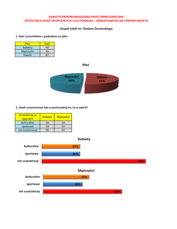 ANKIETA PRZEPROWADZONA PRZEZ MRM DARŁOWA DOTYCZĄCA ZAJĘĆ SPORTOWYCH I KULTURALNO - OŚWIATOWYCH NA TERENIE MIASTA Zespół Szkół im. Stefana Żeromskiego 1. Ilość uczestników z podziałem na płeć. Płeć Kobiety Mężczyźni Razem Ilość 44 43 87 Płeć Mężczyźni 49% Kobiety 51% 2. Jeżeli uczestniczysz lub uczestniczyłaś/eś, to w jakich? Uczestniczę w zajęciach kulturalne sportowe nie uczestniczę Kobiety Mężczyźni 14 14 38 14 12 24 Kobiety kulturalne 31% sportowe 31% nie uczestniczę 86% Mężczyźni kulturalne sportowe nie uczestniczę 35% 30% 56% 3. Powód nie uczestniczenia w zajęciach? Powód nie uczestniczenia w zajęciach brak czasu uboga oferta brak ochoty Kobiety Mężczyźni 4 28 4 10 11 3 Kobiety brak ochoty 11% brak czasu 11% uboga oferta 78% Mężczyźni brak ochoty 12% brak czasu 42% uboga oferta 46% 4. Czy chciałabyś/chciałbyś uczestniczyć w zajęciach, jeżeli zaproponowano by szerszą ofertę? Co wybrałabyś/wybrałbyś wówczas? Wybierane zajęcia Kobiety Mężczyźni koło teatralne koło lalkarskie chór 7 0 2 3 0 1 koło szaradzistów 5 zajęcia plastyczne Kobiety Mężczyżni 6 koło teatralne koło lalkarskie chór koło szaradzistów 3 0 0 12 10 2 zajęcia plastyczne 2 koncerty organowe 0 0 koncerty organowe zajęcia historyczne 6 7 zajęcia historyczne 0 0 koło miłośników Darłowa 2 16 7 0 4 2 koło turystyczne zespół taneczny akademia literacka 0 0 18 19 15 11 11 2 10 9 13 11 17 10 10 1 4 5 20 18 6 0 10 5 4 14 14 11 7 0 2 1 0 1 14 12 9 8 turystyka (rowerowa, piesza, rajdy) 12 19 sporty walki survival 6 5 koło miłośników Darłowa koło turystyczne zespół taneczny akademia literacka koło ekologów koncerty muzyczne koło fotografów zajęcia kulinarne klub filmowy spotkania z interesującymi ludźmi kręgle bilard piłkarzyki szachy/warcaby pilates streching zumba aerobic yoga piłka nożna siatkówka koszykówka piłka ręczna 14 25 koło ekologów koncerty muzyczne koło fotografów zajęcia kulinarne klub filmowy spotkania z interesującymi… 7 56 10 0 0 67 0 0 2 7 16 0 2 4 0 0 18 19 15 2 11 10 9 11 1113 kręgle 14 17 10 bilard 14 10 piłkarzyki 11 1 szachy/warcaby 7 4 pilates 0 streching 2 5 20 zumba 1 18 aerobic 0 6 yoga 1 0 piłka nożna 14 1012 siatkówka 5 koszykówka 9 4 piłka ręczna 8 12 turystyka (rowerowa, piesza,… 19 sporty walki survival 6 5 14 25 5. Skąd czerpiesz wiedzę na temat zajęć odbywających się w naszym mieście? Skąd czerpiesz wiedzę na temat zajęć w Darłowie ogłoszenia w szkole Kobiety Mężczyźni 17 11 wwww.DOK 7 4 www. Miasta 4 5 18 16 36 33 ogłoszenia na słupach od znajomych Kobiety ogłoszenia w szkole 21% od znajomych 44% wwww.DOK 8% ogłoszenia na słupach 22% www. Miasta 5% Mężczyźni ogłoszenia w szkole 16% wwww.DOK 6% od znajomych 48% ogłoszenia na słupach 23% www. Miasta 7% 6. Ile czasu w tygodniu jesteś w stanie poświęcić na zajęcia sprawiające ci satysfakcję i rozwijające twoje zainteresowania? Ile czasu w tyg. jesteś w stanie poświęcić na zajęcia 1-2 godziny 3-4 godziny 5-6 godzin Kobiety Mężczyźni 14 22 8 6 21 16 Kobiety 5-6 godzin 18% 1-2 godziny 32% 3-4 godziny 50% Mężczyźni 1-2 godziny 14% 5-6 godzin 37% 3-4 godziny 49%