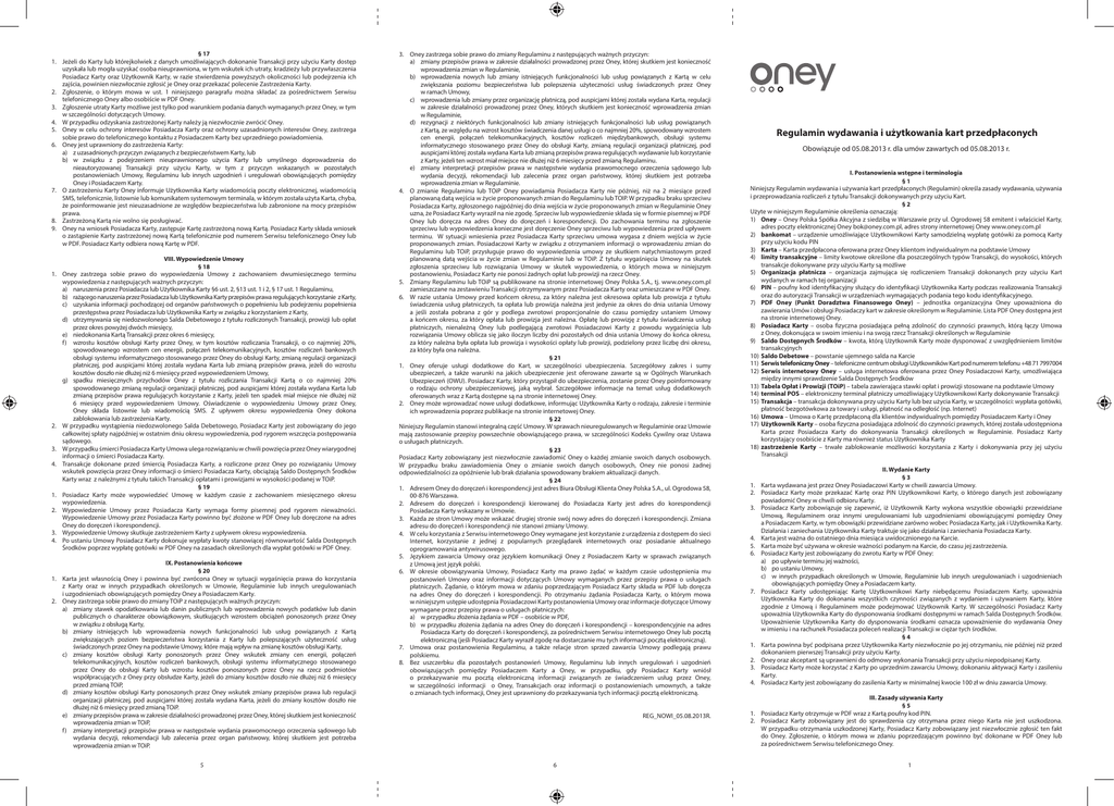 § 17 1. Jeżeli do Karty lub którejkolwiek z danych umożliwiających dokonanie Transakcji przy użyciu Karty dostęp uzyskała lub mogła uzyskać osoba nieuprawniona, w tym wskutek ich utraty, kradzieży lub przywłaszczenia Posiadacz Karty oraz Użytkownik Karty, w razie stwierdzenia powyższych okoliczności lub podejrzenia ich zajścia, powinien niezwłocznie zgłosić je Oney oraz przekazać polecenie Zastrzeżenia Karty. 2. Zgłoszenie, o którym mowa w ust. 1 niniejszego paragrafu można składać za pośrednictwem Serwisu telefonicznego Oney albo osobiście w PDF Oney. 3. Zgłoszenie utraty Karty możliwe jest tylko pod warunkiem podania danych wymaganych przez Oney, w tym w szczególności dotyczących Umowy. 4. W przypadku odzyskania zastrzeżonej Karty należy ją niezwłocznie zwrócić Oney. 5. Oney w celu ochrony interesów Posiadacza Karty oraz ochrony uzasadnionych interesów Oney, zastrzega sobie prawo do telefonicznego kontaktu z Posiadaczem Karty bez uprzedniego powiadomienia. 6. Oney jest uprawniony do zastrzeżenia Karty: a) z uzasadnionych przyczyn związanych z bezpieczeństwem Karty, lub b) w związku z podejrzeniem nieuprawnionego użycia Karty lub umyślnego doprowadzenia do nieautoryzowanej Transakcji przy użyciu Karty, w tym z przyczyn wskazanych w pozostałych postanowieniach Umowy, Regulaminu lub innych uzgodnień i uregulowań obowiązujących pomiędzy Oney i Posiadaczem Karty. 7. O zastrzeżeniu Karty Oney informuje Użytkownika Karty wiadomością poczty elektronicznej, wiadomością SMS, telefonicznie, listownie lub komunikatem systemowym terminala, w którym została użyta Karta, chyba, że poinformowanie jest nieuzasadnione ze względów bezpieczeństwa lub zabronione na mocy przepisów prawa. 8. Zastrzeżoną Kartą nie wolno się posługiwać. 9. Oney na wniosek Posiadacza Karty, zastępuje Kartę zastrzeżoną nową Kartą. Posiadacz Karty składa wniosek o zastąpienie Karty zastrzeżonej nową Kartą telefonicznie pod numerem Serwisu telefonicznego Oney lub w PDF. Posiadacz Karty odbiera nową Kartę w PDF. VIII. Wypowiedzenie Umowy § 18 1. Oney zastrzega sobie prawo do wypowiedzenia Umowy z zachowaniem dwumiesięcznego terminu wypowiedzenia z następujących ważnych przyczyn: a) naruszenia przez Posiadacza lub Użytkownika Karty §6 ust. 2, §13 ust. 1 i 2, § 17 ust. 1 Regulaminu, b) rażącego naruszenia przez Posiadacza lub Użytkownika Karty przepisów prawa regulujących korzystanie z Karty, c) uzyskania informacji pochodzącej od organów państwowych o popełnieniu lub podejrzeniu popełnienia przestępstwa przez Posiadacza lub Użytkownika Karty w związku z korzystaniem z Karty, d) utrzymywania się niedozwolonego Salda Debetowego z tytułu rozliczonych Transakcji, prowizji lub opłat przez okres powyżej dwóch miesięcy, e) niedokonania Kartą Transakcji przez okres 6 miesięcy, f) wzrostu kosztów obsługi Karty przez Oney, w tym kosztów rozliczania Transakcji, o co najmniej 20%, spowodowanego wzrostem cen energii, połączeń telekomunikacyjnych, kosztów rozliczeń bankowych obsługi systemu informatycznego stosowanego przez Oney do obsługi Karty, zmianą regulacji organizacji płatniczej, pod auspicjami której została wydana Karta lub zmianą przepisów prawa, jeżeli do wzrostu kosztów doszło nie dłużej niż 6 miesięcy przed wypowiedzeniem Umowy, g) spadku miesięcznych przychodów Oney z tytułu rozliczania Transakcji Kartą o co najmniej 20% spowodowanego zmianą regulacji organizacji płatniczej, pod auspicjami której została wydana Karta lub zmianą przepisów prawa regulujących korzystanie z Karty, jeżeli ten spadek miał miejsce nie dłużej niż 6 miesięcy przed wypowiedzeniem Umowy. Oświadczenie o wypowiedzeniu Umowy przez Oney, Oney składa listownie lub wiadomością SMS. Z upływem okresu wypowiedzenia Oney dokona zablokowania lub zastrzeżenia Karty. 2. W przypadku wystąpienia niedozwolonego Salda Debetowego, Posiadacz Karty jest zobowiązany do jego całkowitej spłaty najpóźniej w ostatnim dniu okresu wypowiedzenia, pod rygorem wszczęcia postępowania sądowego. 3. W przypadku śmierci Posiadacza Karty Umowa ulega rozwiązaniu w chwili powzięcia przez Oney wiarygodnej informacji o śmierci Posiadacza Karty. 4. Transakcje dokonane przed śmiercią Posiadacza Karty, a rozliczone przez Oney po rozwiązaniu Umowy wskutek powzięcia przez Oney informacji o śmierci Posiadacza Karty, obciążają Saldo Dostępnych Środków Karty wraz z należnymi z tytułu takich Transakcji opłatami i prowizjami w wysokości podanej w TOiP. § 19 1. Posiadacz Karty może wypowiedzieć Umowę w każdym czasie z zachowaniem miesięcznego okresu wypowiedzenia. 2. Wypowiedzenie Umowy przez Posiadacza Karty wymaga formy pisemnej pod rygorem nieważności. Wypowiedzenie Umowy przez Posiadacza Karty powinno być złożone w PDF Oney lub doręczone na adres Oney do doręczeń i korespondencji. 3. Wypowiedzenie Umowy skutkuje zastrzeżeniem Karty z upływem okresu wypowiedzenia. 4. Po ustaniu Umowy Posiadacz Karty dokonuje wypłaty kwoty stanowiącej równowartość Salda Dostępnych Środków poprzez wypłatę gotówki w PDF Oney na zasadach określonych dla wypłat gotówki w PDF Oney. IX. Postanowienia końcowe § 20 1. Karta jest własnością Oney i powinna być zwrócona Oney w sytuacji wygaśnięcia prawa do korzystania z Karty oraz w innych przypadkach określonych w Umowie, Regulaminie lub innych uregulowaniach i uzgodnieniach obowiązujących pomiędzy Oney a Posiadaczem Karty. 2. Oney zastrzega sobie prawo do zmiany TOiP z następujących ważnych przyczyn: a) zmiany stawek opodatkowania lub danin publicznych lub wprowadzenia nowych podatków lub danin publicznych o charakterze obowiązkowym, skutkujących wzrostem obciążeń ponoszonych przez Oney w związku z obsługą Karty, b) zmiany istniejących lub wprowadzenia nowych funkcjonalności lub usług powiązanych z Kartą zwiększających poziom bezpiecze