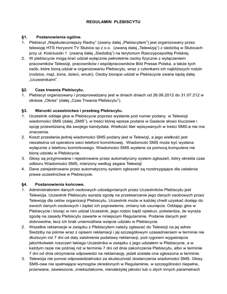 REGULAMIN PLEBISCYTU §1. Postanowienia ogólne. 1. Plebiscyt „Najskuteczniejszy Radny” (zwany dalej „Plebiscytem”) jest organizowany przez telewizję HTS Horyzont TV Słubice sp z o.o. (zwaną dalej „Telewizją”) z siedzibą w Słubicach przy ul. Kościuszki 1 (zwaną dalej „Siedzibą”) na terytorium Rzeczypospolitej Polskiej. 2. W plebiscycie mogą brać udział wyłącznie pełnoletnie osoby fizyczne z wyłączeniem pracowników Telewizji, pracowników i współpracowników Bild Presse Polska, a także tych osób, które biorą udział w organizowaniu Plebiscytu, wraz z członkami ich najbliższych rodzin (rodzice, mąż, żona, dzieci, wnuki). Osoby biorące udział w Plebiscycie zwane będą dalej „Uczestnikami”. §2. Czas trwania Plebiscytu. 1. Plebiscyt organizowany i przeprowadzany jest w dniach dniach od 26.06.2012 do 31.07.212 w okresie „Okres” (dalej „Czas Trwania Plebiscytu”). §3. Warunki uczestnictwa i przebieg Plebiscytu. 1. Uczestnik oddaje głos w Plebiscycie poprzez wysłanie pod numer podany w Telewizji wiadomości SMS (dalej „SMS”), w treści której wpisze podane w Gazecie słowo kluczowe i opcję przewidzianą dla swojego kandydata. Wielkość liter wpisywanych w treści SMS-a nie ma znaczenia. 2. Koszt przesłania jednej wiadomości SMS podany jest w Telewizji, a jego wielkość jest niezależna od operatora sieci telefonii komórkowej. Wiadomość SMS może być wysłana wyłącznie z telefonu komórkowego. Wiadomości SMS wysłane za pomocą komputera nie biorą udziału w Plebiscycie. 3. Głosy są przyjmowane i rejestrowane przez automatyczny system zgłoszeń, który określa czas odbioru Wiadomości SMS, mierzony według zegara Telewizji 4. Dane zarejestrowane przez automatyczny system zgłoszeń są rozstrzygające dla ustalenia prawa uczestnictwa w Plebiscycie. §4. Postanowienia końcowe. 1. Administratorem danych osobowych udostępnianych przez Uczestników Plebiscytu jest Telewizja. Uczestnik Plebiscytu wyraża zgodę na przetwarzanie jego danych osobowych przez Telewizję dla celów organizacji Plebiscytu. Uczestnik może w każdej chwili uzyskać dostęp do swoich danych osobowych i żądać ich poprawienia, zmiany lub usunięcia. Oddając głos w Plebiscycie i biorąc w nim udział Uczestnik, jego rodzic bądź opiekun, potwierdza, że wyraża zgodę na zasady Plebiscytu zawarte w niniejszym Regulaminie. Podanie danych jest dobrowolne, lecz ich brak uniemożliwia wzięcie udziału w Plebiscycie. 2. Wszelkie reklamacje w związku z Plebiscytem należy zgłaszać do Telewizji na jej adres Siedziby na piśmie wraz z opisem reklamacji i jej szczegółowym uzasadnieniem w terminie nie dłuższym niż 7 dni od daty zaistnienia podstawy reklamacji, pod rygorem wygaśnięcia jakichkolwiek roszczeń takiego Uczestnika w związku z jego udziałem w Plebiscycie, a w każdym razie nie później niż w terminie 7 dni od dnia zakończenia Plebiscytu, albo w terminie 7 dni od dnia otrzymania odpowiedzi na reklamację, jeżeli została ona zgłoszona w terminie. 3. Telewizja nie ponosi odpowiedzialności za skuteczność dostarczenia wiadomości SMS. Głosy SMS-owe nie spełniające wymogów określonych w Regulaminie, w szczególności niepełne, przerwane, zawieszone, zniekształcone, nienależytej jakości lub o złych innych parametrach 4. 5. 6. 7. 8. technicznych w stopniu uniemożliwiającym lub utrudniającym jego czytelność lub możliwość weryfikacji umieszczonych na nim danych są nieważne i zostaną wykluczone z Plebiscytu. Operatorzy GSM odpowiadają jedynie za usługi telekomunikacyjne umożliwiające realizację Serwisu. Upusty cenowe dla grup abonentów na opłaty abonamentowe oraz usługi dodatkowe nie mają zastosowania do numeru dostępowego do serwisu. Oddając głos w Plebiscycie i biorąc w nim udział uczestnik, jego rodzic bądź opiekun podporządkowuje się postanowieniom Regulaminu Plebiscytu i wyraża zgodę na jego treść. Regulamin Plebiscytu jest dostępny dla uczestników w Siedzibie Telewizji oraz na jego witrynie. Postanowienia Regulaminu są wyłączną podstawą prowadzenia Plebiscytu, a ich wykładnia i interpretacja należy wyłącznie do Organizatora. Telewizja zastrzega sobie prawo do zmiany zasad Plebiscytu i treści Regulaminu w trakcie trwania Plebiscytu.