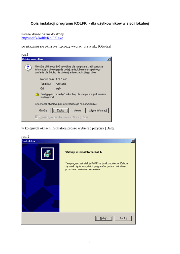 Opis instalacji programu KOLFK - dla użytkowników w sieci lokalnej Proszę kliknąć na link do strony: http://sqlfk/kolfk/KolFK.exe po ukazaniu się okna rys 1.proszę wybrać przycisk: [Otwórz] rys.1 w kolejnych oknach instalatora proszę wybierać przycisk [Dalej] rys. 2 1 Instalator podpowiada domyślny zalecany katalog instalacji. C:\ Program Files\Kolporter Info S.A.\KOLFK rys. 3 rys. 4 Podpowiadane przez program wartości domyślne można pozostawić niezmienione (rys. 4). 2 Po uruchomieniu programu z ikony KolFK lub z menu Start\KolFk należy (rys. 5.): rys. 5 W polu Serwer wpisać: kolfk- serwis jeżeli instalacja dotyczy Kolporter Serwisu kolfk jeżeli instalacja dotyczy pozostałych firm Holdingu w polu Baza należy wpisać: dbfk w polu użytkownik: imie.nazwisko Użytkownika założonego w programie KOLFK przez administratora. Pierwsze uruchomienie programu KOLFK powoduje skopiowanie aktualnych plików programu z ftp na dysk lokalny. Po ściągnięciu aktualnych plików może być konieczne ponowne uruchomienie programu. 3
