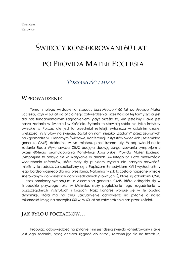 Ewa Kusz Katowice ŚWIECCY KONSEKROWANI 60 LAT PO PROVIDA MATER ECCLESIA TOŻSAMOŚĆ I MISJA WPROWADZENIE Temat mojego wystąpienia: świeccy konsekrowani 60 lat po Provida Mater Ecclesia, czyli w 60 lat od oficjalnego zatwierdzenia przez Kościół tej formy życia jest dla nas fundamentalnym zagadnieniem, gdyż określa to, kim jesteśmy i jakie jest nasze zadanie w świecie i w Kościele. Pytanie to stawiają sobie nie tylko instytuty świeckie w Polsce, ale jest to przedmiot refleksji, zwłaszcza w ostatnim czasie, większości instytutów na świecie. Został on nam niejako „zadany” przez zebranych na Zgromadzeniu Plenarnym Światowej Konferencji Instytutów Świeckich [Assemblea generale CMIS], dokładnie w tym miejscu, przed trzema laty. W odpowiedzi na to zadanie Rada Wykonawcza CIMS podjęła decyzję zorganizowania sympozjum z okazji 60-lecia promulgowania Konstytucji Apostolskiej Provida Mater Ecclesia. Sympozjum to odbyło się w Watykanie w dniach 3-4 lutego br. Poza możliwością wysłuchania referatów, które stały się punktem wyjścia dla naszych rozważań, mieliśmy tę radość, że spotkaliśmy się z Papieżem Benedyktem XVI i wysłuchaliśmy jego bardzo ważnego dla nas przesłania. Natomiast – jak to zostało napisane w liście skierowanym do wszystkich odpowiedzialnych głównych IŚ, które są członkami CMIS − czas pomiędzy sympozjum, a Assemblea generale CMIS, które odbędzie się w listopadzie przyszłego roku w Meksyku, służy pogłębieniu tego zagadnienia w poszczególnych instytutach i krajach. Nasz kongres wpisuje się w tę ogólną dynamikę, która ma na celu uaktualnienie odpowiedzi na pytanie o naszą tożsamość i misję na początku XXI w, w 60 lat od zatwierdzenia nas przez Kościół. JAK BYŁO U POCZĄTKÓW… Próbując odpowiedzieć na pytanie, kim jest dzisiaj świecki konsekrowany i jakie jest jego zadanie, będę chciała sięgnąć do historii, zatrzymując się na trzech jej momentach; chcę odnieść się do dokumentów, które są dla nas fundamentalne: Konstytucji Apostolskiej Provida Mater Ecclesia i Motu Proprio Primo Feliciter, w których Papież Pius XII zatwierdził tę formę życia w Kościele, następnie do intuicji założycieli pierwszych instytutów świeckich – tych które powstawały już z końcem XIX i w początkach XX wieku, a w końcu – bardzo pobieżnie – do kontekstu historycznospołecznego i eklezjalnego w Polsce, który towarzyszył powstawaniu polskich instytutów świeckich. INSTYTUTY ŚWIECKIE JAKO NOWA FORMA ŻYCIA W KOŚCIELE Papież Pius XII, opisawszy w Provida Mater Ecclesia w 5 początkowych punktach historię życia konsekrowanego, stwierdził następnie: zdawało się, ze już nic nie trzeba dodawać do prawnego ujęcia kanonicznego stanu doskonałości…1 i wskazuje potem dalej, że pojawiły się osoby, które dzięki szczególnemu Bożemu powołaniu, potrafiły odkryć nowe, doskonałe formy stowarzyszeń, szczególnie odpowiadające potrzebom czasu2. Rozwinął tę myśl w Primo Feliciter, mówiąc: Duch Święty, który nieustannie odnawia oblicze ziemi zniekształcone i oszpecane codziennie nadmiarem zła, powołał dla siebie darem wielkiej i szczególnej łaski wielką liczbę umiłowanych synów i córek, którym z głębi serca błogosławimy w Panu, aby stojąc w szeregach instytutów świeckich byli jako sól niezwietrzała w zepsutym świecie, z którego nie są, w którym jednak z woli Bożej winni pozostać. Mają oni być w tym świecie światłem, które w ciemności świeci i nie gaśnie, odrobiną dobrego zaczynu, który działa wszędzie i zawsze, przenika wszystkie środowiska i wszelkimi sposobami, słowem i przykładem, usiłuje wszędzie dotrzeć tak, aby zaczyn Ewangelii ogarnął całe ciasto i wszystko przemienił w Chrystusie3 . Dzisiaj o życiu konsekrowanym nie mówimy już w kategoriach stanu doskonałości, może także inne sformułowania tych dwóch dokumentów brzmiałyby dziś inaczej; chciałabym jednak zwrócić uwagę na kilka istotnych wniosków, które wynikają z tych dokumentów Papieża Piusa XII: powstanie instytutów świeckich jest darem Boga, jako odpowiedź na potrzeby czasu; Por. PME 6. 2 Por. PME 7. 3 PF 1. 4 W tym sformułowaniu widzimy również „echo” Listu do Diogneta, w którym czytamy, że chrześcijanie żyją w świecie, ale nie należą do świata. Tylko, że w III wieku, gdy powstawał ten list, słowa te Strona 1 2 członkowie instytutów świeckich z woli Bożej – jak podkreśla Papież − pozostają w świecie, choć z tego świata nie są. To „umocowanie”, jeśli można tak powiedzieć, pośrodku świata nie ma jedynie wymiaru socjologicznego, stanowi natomiast o istocie ich (naszego) powołania. To oznacza, że jakakolwiek forma wycofania się ze świata czy też chronienia się przed jego problemami i trudami jest niewiernością powołaniu4; Papież pokazuje również to, co jest zadaniem świeckich konsekrowanych „pośrodku świata”, używając sformułowań, które od tej pory przyjmujemy jako „słowa-klucze” określające nasze powołanie – „sól niezwietrzała” [wł. che non vien meno] czy też „światło” albo „zaczyn”, który ma wszystko przemienić w Chrystusa. Te metafory nie mówią jeszcze wyraźnie o naszej tożsamości, może trochę więcej mówią o zadaniach. Są jednak dla nas bardzo istotne, gdyż wskazują – od samego początku – kierunek naszych poszukiwań w określeniu, kim jest świecki konsekrowany i jakie jest jego zadanie. INSTYTUTY ŚWIECIE – ODPOWIEDZIĄ NA POTRZEBY CZASU Spróbujmy się teraz jeszcze przyjrzeć początkom – można powiedzieć – prehistorii instytutów świeckich, która poprzedziła ich zatwierdzenie. Nie chcę przypominać tu szczegółowo historii instytutów świeckich, wskażę jedynie na te elementy, które są dla naszego rozważania istotne. Czytając historię najstarszych instytutów świeckich – tych, które powsta