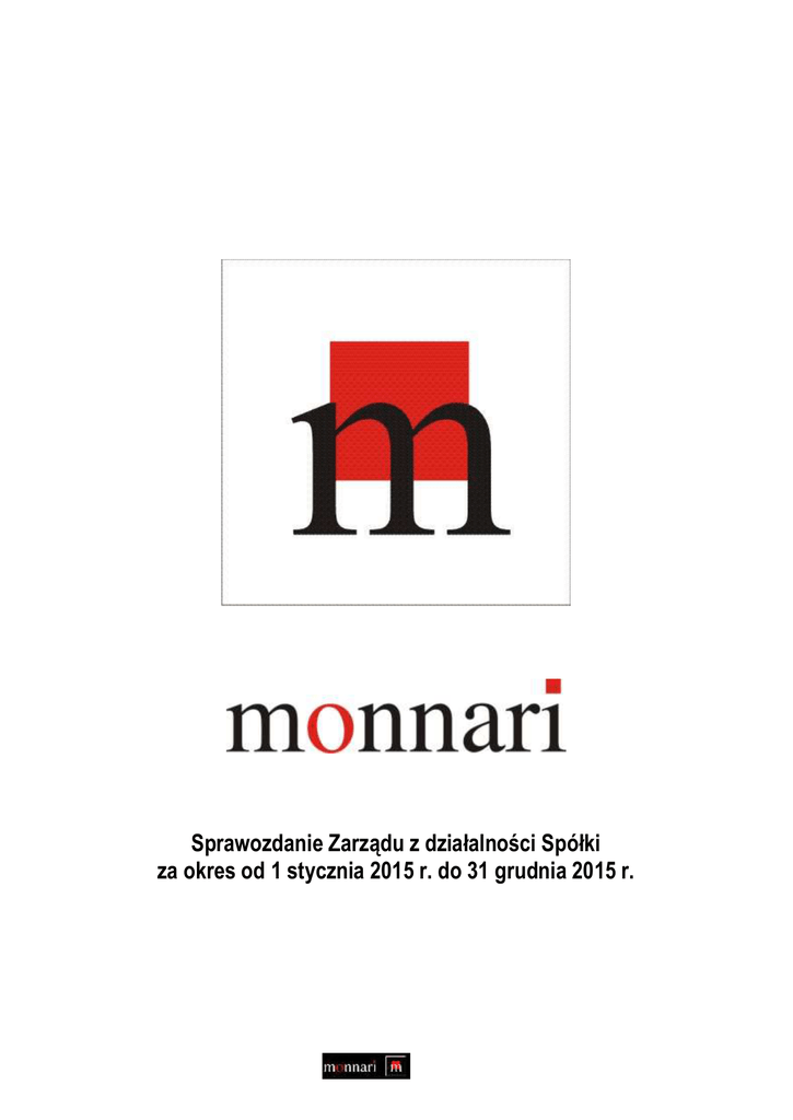 Sprawozdanie Zarządu z działalności Spółki za okres od 1 stycznia 2015 r. do 31 grudnia 2015 r. MONNARI TRADE S.A. Sprawozdanie Zarządu z działalności za okres od 1 stycznia 2015 r. do 31 grudnia 2015 r. (w tys. zł o ile nie zaznaczono inaczej) Spis treści OGÓLNA CHARAKTERYSTYKA MONNARI TRADE S.A. 5 1. Zasady sporządzenia rocznego Sprawozdania finansowego. ............................................................................5 2. Omówienie podstawowych wielkości ekonomiczno-finansowych ujawnionych w rocznym Sprawozdaniu Finansowym, w szczególności opis czynników i zdarzeń, w tym o nietypowym charakterze, mających znaczący wpływ na działalność Emitenta i osiągnięte przez niego zyski lub poniesione straty w okresie 2015 roku a także omówienie perspektyw rozwoju działalności Spółki przynajmniej w najbliższym roku obrotowym. .....................................................................................................................................................5 3. Opis podstawowych zagrożeń i ryzyka, z określeniem, w jakim stopniu Spółka jest na nie narażona...............9 4. Oświadczenie o stosowaniu ładu korporacyjnego. Niniejsze Oświadczenie stanowi wyodrębnioną część Sprawozdania Zarządu z działalności MONNARI TRADE S.A. w okresie od 01.01.2015 r. do 31.12.2015 r. .....11 5. Wskazanie postępowań toczących się przed sądem, organem właściwym dla postępowania arbitrażowego lub organem administracji publicznej, z uwzględnieniem informacji w zakresie: ...........................................22 6. Informacja o podstawowych produktach, towarach, usługach wraz z ich określeniem wartościowym i ilościowym oraz udziałem poszczególnych produktów, towarów i usług w sprzedaży Spółki ogółem, a także zmianach w tym zakresie w danym roku obrotowym. ...................................................................................23 7. Informacje o rynkach zbytu, z uwzględnieniem podziału na rynki krajowe i zagraniczne, oraz informacje o źródłach zaopatrzenia w materiały do produkcji, w towary i usługi, z określeniem uzależnienia od jednego lub więcej odbiorców i dostawców, a w przypadku gdy udział jednego odbiorcy lub dostawcy osiąga co najmniej 10 % przychodów ze sprzedaży ogółem — nazwy (firmy) dostawcy lub odbiorcy, jego udział w sprzedaży lub zaopatrzeniu oraz jego formalne powiązania ze Spółką. ..........................................................26 9. Informacje o powiązaniach organizacyjnych lub kapitałowych MONNARI TRADE S.A. z innymi podmiotami oraz określenie jego głównych inwestycji krajowych i zagranicznych (papiery wartościowe, instrumenty finansowe, wartości niematerialne i prawne oraz nieruchomości), w tym inwestycji kapitałowych dokonanych poza jego grupą jednostek powiązanych oraz opis metod ich finansowania. .............................27 10. Informacje o istotnych transakcjach zawartych przez Emitenta lub jednostkę od niego zależną z podmiotami powiązanymi na innych warunkach niż rynkowe, wraz z ich kwotami oraz informacjami określającymi charakter tych transakcji — obowiązek uznaje się za spełniony poprzez wskazanie miejsca zamieszczenia informacji w sprawozdaniu. ...........................................................................................................................31 11. Informacje o zaciągniętych i wypowiedzianych w danym roku obrotowym umowach dotyczących kredytów i pożyczek, z podaniem co najmniej ich kwoty, rodzaju i wysokości stopy procentowej, waluty i terminu wymagalności. ...............................................................................................................................................31 12 Informacje o udzielonych w danym roku obrotowym pożyczkach, ze szczególnym uwzględnieniem pożyczek udzielonych jednostkom powiązanym Emitenta, z podaniem co najmniej ich kwoty, rodzaju i wysokości stopy procentowej, waluty i terminu wymagalności. .....................................................................................32 13 Informacje o udzielonych i otrzymanych w danym roku obrotowym poręczeniach i gwarancjach, ze szczególnym uwzględnieniem poręczeń i gwarancji udzielonych jednostkom powiązanym Emitenta. ...........32 2 MONNARI TRADE S.A. Sprawozdanie Zarządu z działalności za okres od 1 stycznia 2015 r. do 31 grudnia 2015 r. (w tys. zł o ile nie zaznaczono inaczej) 14 Informacja o emisji papierów wartościowych w okresie objętym raportem – opis wykorzystania przez Emitenta wpływów z emisji do chwili sporządzenia sprawozdania z działalności. ..........................................32 15 Stanowisko Zarządu odnośnie możliwości zrealizowania wcześniej publikowanych prognoz wyników na dany rok, w świetle wyników zaprezentowanych w raporcie rocznym w stosunku do wyników prognozowanych. ..........................................................................................................................................33 16 Ocena, wraz z jej uzasadnieniem, dotycząca zarządzania zasobami finansowymi, ze szczególnym uwzględnieniem zdolności wywiązywania się z zaciągniętych zobowiązań, oraz określenie ewentualnych zagrożeń i działań, jakie Spółka podjęła lub zamierza podjąć w celu przeciwdziałania tym zagrożeniom. ......33 17 Ocena możliwości realizacji zamierzeń inwestycyjnych, w tym inwestycji kapitałowych, w porównaniu do wielkości posiadanych środków, z uwzględnieniem możliwych zmian w strukturze finansowania. ...............35 18 Ocena czynników i nietypowych zdarzeń mających wpływ na wynik z działalności za rok obrotowy, z określeniem stopnia wpływu tych czynników lub nietypowych zdarzeń na osiągnięty wynik. .......................36 19 Charakterystyka zewnętrznych i wewnętrznych czynników istotnych dla rozwoju przedsiębiorstwa Emitenta oraz opis perspektyw rozwoju działalności Emiten