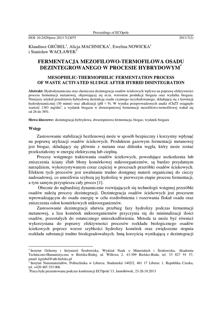 fermentacja mezofilowo-termofilowa osadu dezintegrowanego w
