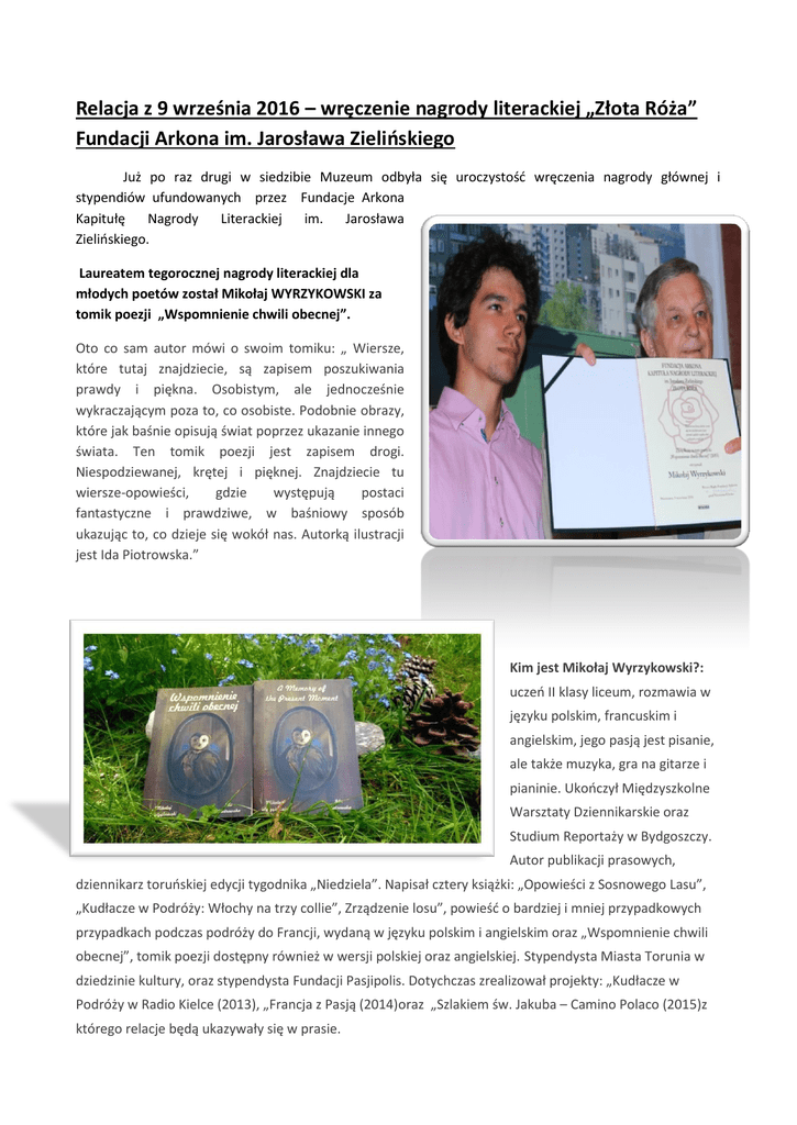 Relacja z 9 września 2016 – wręczenie nagrody literackiej „Złota Róża” Fundacji Arkona im. Jarosława Zielińskiego Już po raz drugi w siedzibie Muzeum odbyła się uroczystość wręczenia nagrody głównej i stypendiów ufundowanych przez Fundacje Arkona Kapitułę Nagrody Literackiej im. Jarosława Zielińskiego. Laureatem tegorocznej nagrody literackiej dla młodych poetów został Mikołaj WYRZYKOWSKI za tomik poezji „Wspomnienie chwili obecnej”. Oto co sam autor mówi o swoim tomiku: „ Wiersze, które tutaj znajdziecie, są zapisem poszukiwania prawdy i piękna. Osobistym, ale jednocześnie wykraczającym poza to, co osobiste. Podobnie obrazy, które jak baśnie opisują świat poprzez ukazanie innego świata. Ten tomik poezji jest zapisem drogi. Niespodziewanej, krętej i pięknej. Znajdziecie tu wiersze-opowieści, gdzie występują postaci fantastyczne i prawdziwe, w baśniowy sposób ukazując to, co dzieje się wokół nas. Autorką ilustracji jest Ida Piotrowska.” Kim jest Mikołaj Wyrzykowski?: uczeń II klasy liceum, rozmawia w języku polskim, francuskim i angielskim, jego pasją jest pisanie, ale także muzyka, gra na gitarze i pianinie. Ukończył Międzyszkolne Warsztaty Dziennikarskie oraz Studium Reportaży w Bydgoszczy. Autor publikacji prasowych, dziennikarz toruńskiej edycji tygodnika „Niedziela”. Napisał cztery książki: „Opowieści z Sosnowego Lasu”, „Kudłacze w Podróży: Włochy na trzy collie”, Zrządzenie losu”, powieść o bardziej i mniej przypadkowych przypadkach podczas podróży do Francji, wydaną w języku polskim i angielskim oraz „Wspomnienie chwili obecnej”, tomik poezji dostępny również w wersji polskiej oraz angielskiej. Stypendysta Miasta Torunia w dziedzinie kultury, oraz stypendysta Fundacji Pasjipolis. Dotychczas zrealizował projekty: „Kudłacze w Podróży w Radio Kielce (2013), „Francja z Pasją (2014)oraz „Szlakiem św. Jakuba – Camino Polaco (2015)z którego relacje będą ukazywały się w prasie. Kapituła przyznała również 2 wyróżnienia w postaci stypendiów dla Justyny JAWORSKIEJ i Urszuli WOJTAŚ. Urszula WOJTAŚ Urszula WOJTAŚ Justyna JAWORSKA Wieczór uświetnił udział aktorki Marii GŁADKOWSKIEJ, która czytała poezje Jarosława Zielińskiego, zmarłego młodego poety, którego imię nosi fundacja. Na spotkaniu był także wietnamski poeta Lam QUANG MY, od lat mieszkający w Polsce. Jest także tłumaczem literatury polskiej na język wietnamski i wietnamskiej na polski. LAM QUANG MY MARIA GŁADKOWSKA