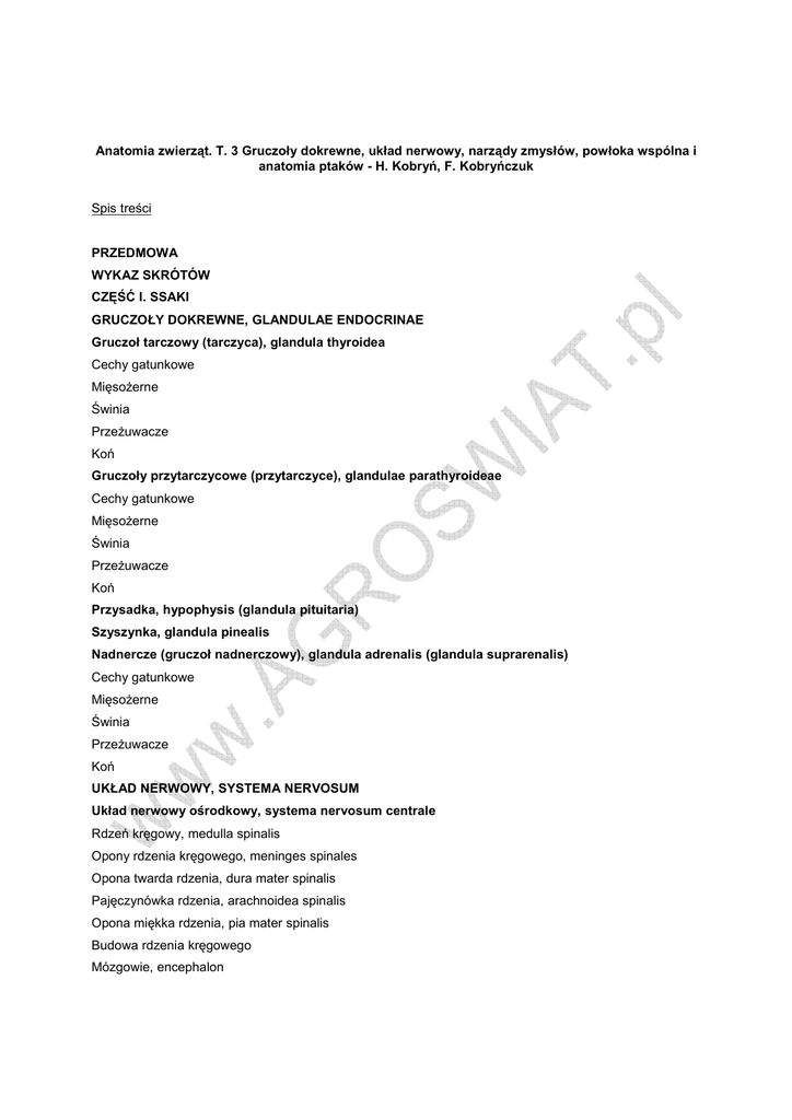 Anatomia zwierząt. T. 3 Gruczoły dokrewne, układ nerwowy, narządy zmysłów, powłoka wspólna i anatomia ptaków - H. Kobryń, F. Kobryńczuk Spis treści PRZEDMOWA WYKAZ SKRÓTÓW CZĘŚĆ I. SSAKI GRUCZOŁY DOKREWNE, GLANDULAE ENDOCRINAE Gruczoł tarczowy (tarczyca), glandula thyroidea Cechy gatunkowe MięsoŜerne Świnia PrzeŜuwacze Koń Gruczoły przytarczycowe (przytarczyce), glandulae parathyroideae Cechy gatunkowe MięsoŜerne Świnia PrzeŜuwacze Koń Przysadka, hypophysis (glandula pituitaria) Szyszynka, glandula pinealis Nadnercze (gruczoł nadnerczowy), glandula adrenalis (glandula suprarenalis) Cechy gatunkowe MięsoŜerne Świnia PrzeŜuwacze Koń UKŁAD NERWOWY, SYSTEMA NERVOSUM Układ nerwowy ośrodkowy, systema nervosum centrale Rdzeń kręgowy, medulla spinalis Opony rdzenia kręgowego, meninges spinales Opona twarda rdzenia, dura mater spinalis Pajęczynówka rdzenia, arachnoidea spinalis Opona miękka rdzenia, pia mater spinalis Budowa rdzenia kręgowego Mózgowie, encephalon Opony mózgowia, meninges encephali Opona twarda mózgowia, dura mater encephali Pajęczynówka mózgowia, arachnoidea encephali Opona miękka mózgowia, pia mater encephali Tętnice mózgu, arteriae cerebri śyły mózgu, venae cerebri Płyn mózgowo-rdzeniowy, liquor cerebrospinalis Rozwój mózgowia Ogólny wygląd i wielkość mózgowia Kresomózgowie, telencephalon Półkula, hemispherium Płaszcz nowy albo wtórny, neopallium Węchomózgowie, rhinencephalon Ciało prąŜkowane, corpus striatum Komora boczna, ventriculus lateralis Międzymózgowie, diencephalon Podwzgórze, hypothalamus Niskowzgórze, subthalamus Wzgórzomózgowie, thalamencephalon Śródmózgowie, mesencephalon Konar mózgu, pedunculus cerebri Nakrywka śródmózgowia, tegmentum mesencephali Pokrywa śródmózgowia, tectum mesencepali Tyłomózgowie wtórne, metencephalon Most, pons MóŜdŜek, cerebellum Komora czwarta, ventriculus quartus Rdzeniomózgowie lub rdzeń przedłuŜony, myelencephalon s. medulla oblongata Układ nerwowy obwodowy, systema nervosum periphericum Nerwy czaszkowe, nervi craniales I. Nerwy węchowe, nn. olfactorii II. Nerw wzrokowy, n. opticus III. Nerw okoruchowy, n. oculomotorius IV. Nerw bloczkowy, n. trochlearis V. Nerw trójdzielny, n. trigeminus V/1. Nerw oczny, n. ophthalmicus V/2. Nerw szczękowy, n. maxillaris V/3. Nerw Ŝuchwowy, n. mandibularis VI. Nerw odwodzący, n. abducens VII. Nerw twarzowy (n. pośrednio-twarzowy), n. facialis (n. intermediofacialis) VIII. Nerw przedsionkowo-ślimakowy, n. vestibulocochlearis IX. Nerw językowo-gardłowy, n. glossopharyngeus X. Nerw błędny, n. vagus XI. Nerw dodatkowy, n. accessorius XII. Nerw podjęzykowy, n. hypoglossus Nerwy rdzeniowe, nervi spinales Nerwy szyjne, nervi cervicales Splot szyjny, plexus cervicalis Nerw przeponowy, n. phrenicus Splot ramienny, plexus brachialis Nerw dogrzbietowy łopatki, n. dorsalis scapulae Nerw podobojczykowy, n. subclavius Nerw nadłopatkowy, m. suprascapularis Nerwy podłopatkowe, nn. subscapulares Nerw mięśniowo-skórny, n. musculocutaneus Nerw pachowy, n. axillaris Nerwy piersiowe doczaszkowe, nn. pectorales craniales Nerw piersiowy długi, n. thoracicus longus Nerw piersiowo-grzbietowy, n. thoracodorsalis Nerw piersiowy boczny, n. thoracicus lateralis Nerwy piersiowe doogonowe, nn. pectorales caudales Nerw promieniowy, n. radialis Nerw pośrodkowy, n. medianus Nerw łokciowy, n. ulnaris Nerwy piersiowe, nervi thoracici Nerwy lędźwiowe, nervi lumbales Nerwy krzyŜowe, nervi sacrales Nerwy ogonowe, nervi caudales (coccygei) Splot lędźwiowy, plexus lumbalis Nerw biodrowo-podbrzuszny, n. iliohypogastricus Nerw biodrowo-pachwinowy, n. ilioinguinalis Nerw płciowo-udowy, n. genitofemoralis Nerw skórny boczny uda, n. cutaneus femoris lateralis Nerw udowy, n. femoralis Nerw zasłonowy, n. obturatorius Splot krzyŜowy, plexus sacralis Nerw pośladkowy doczaszkowy, n. gluteus cranialis Nerw pośladkowy doogonowy, n. gluteus caudalis Nerw skórny doogonowy uda, n. cutaneus femoris caudalis Nerw kulszowy, n. ischiadicus Nerw sromowy, n. pudendus Nerwy odbytnicze doogonowe, nn. rectales caudales Układ nerwowy autonomiczny, systema nervosum autonomicum Część współczulna, pars sympathica Pień współczulny, truncus sympathicus Część przywspółczulna, pars parasympathica NARZĄDY ZMYSŁÓW, ORGANA SENSUUM Narząd wzroku, organum visus Gałka oczna, bulbus oculi Błona włóknista gałki ocznej, tunica fibrosa bulbi Błona naczyniowa gałki ocznej, tunica vasculosa bulbi Błona wewnętrzna gałki ocznej, tunica interna bulbi Soczewka, lens Ciało szkliste, corpus vitreum Narządy dodatkowe oka, organa oculi accessoria Mięśnie gałki ocznej, mm. bulbi Powięzie oczodołowe, fasciae orbitales Powieki, palpebrae Spojówka, tunica conjunctiva Narząd (aparat) łzowy, apparatus lacrimalis Naczynia krwionośne i nerwy narządu wzroku Cechy gatunkowe MięsoŜerne Świnia PrzeŜuwacze Koń Narząd przedsionkowo-ślimakowy (ucho), organum vestibulocochleare (auris) Ucho zewnętrzne, auris externa Przewód słuchowy zewnętrzny, meatus acusticus externus MałŜowina uszna, auricula Ucho środkowe, auris media Jama bębenkowa, cavum tympani Błona bębenkowa, membrana tympani Kosteczki słuchowe, ossicula auditus Błona śluzowa jamy bębenkowej, tunica mucosa cavi tympani Trąbka słuchowa, tuba auditiva Ucho wewnętrzne, auris interna Błędnik kostny, labyrinthus osseus Błędnik błoniasty, labyrinthus membranaceus Cechy gatunkowe MięsoŜerne Świnia PrzeŜuwacze Koń POWŁOKA WSPÓLNA, INTEGUMENTUM COMMUNE Skóra Naskórek, epidermis Skóra właściwa, dermis s. corium Tkanka podskórna, tela subcutanea Pochodne skóry Włosy, pili Gruczoły skóry, glandulae cutis Gruczoły potowe, glandulae sudoriferae Gruczoły łojowe, glandulae sebaceae Gruczoły woskowinowe, glandulae ceruminosae Sutki, mammae Opuszki, tori Narządy palcowe, organa digitalia Rogi, cornua Cechy gatunkowe MięsoŜerne Świnia PrzeŜu