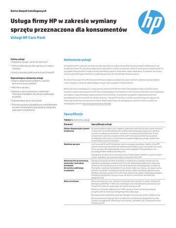 Karta danych katalogowych Usługa firmy HP w zakresie wymiany sprzętu przeznaczona dla konsumentów Usługi HP Care Pack Zalety usługi •Wygodna usługa „od drzwi do drzwi” Omówienie usługi •Tańsza alternatywa dla naprawy w miejscu instalacji Usługa firmy HP w zakresie wymiany sprzętu pozwala na szybką, bezproblemową wymianę kwalifikujących się produktów marki HP. Została przygotowana specjalnie z myślą o produktach, które można łatwo transportować i w przypadku których klienci mogą w prosty sposób przywrócić swoje dane z kopii zapasowej. To świetna, korzystna cenowo opcja oferująca możliwość szybkiego powrotu do normalnego funkcjonowania. •Koszty dostawy pokrywane przez firmę HP Najważniejsze elementy usługi •Zdalna diagnostyka problemu i pomoc techniczna przez telefon •Wymiana sprzętu W ramach tej usługi firma HP przesyła klientowi zastępczy produkt lub część zamienną. Dostarczane produkty i części mogą być nowe lub odpowiadające nowym pod względem funkcjonalnym. Oprócz korzyści wynikających z usług pomocy technicznej HP Care Pack zastosowanie mają wszystkie prawa •Opłacony list przewozowy, materiały i instrukcje niezbędne do zwrotu wadliwego produktu zawarte w ograniczonej gwarancji HP i/lub w obowiązujących przepisach o ochronie konsumentów. W szczególności, •Standardowe okno serwisowe zmieniają ustawowych praw konsumentów. Więcej informacji o przysługujących prawach można uzyskać na •Ochrona przed przypadkowym uszkodzeniem w trakcie eksploatacji (opcjonalna usługa dla wybranych produktów) następującej stronie: Gwarancja prawna konsumentów sprzedawcy mają obowiązek zagwarantować konsumentom, że produkty są zgodne z odpowiednią umową sprzedaży przez okres dwóch lat od daty dostawy. Usługi HP Care Pack w żaden sposób nie ograniczają ani nie Specyfikacje Tabela 1. Elementy usługi Element Specyfikacje usługi Zdalna diagnostyka i pomoc W razie problemu klient musi najpierw zadzwonić pod wyznaczony numer pomocy techniczna technicznej. Firma HP udzieli przez telefon podstawowego wsparcia w zakresie instalacji, konfiguracji produktu, ustawień i rozwiązywania problemów. Przed umówieniem wymiany urządzenia firma HP może poprosić klienta o podanie niezbędnych informacji, uruchomienie narzędzia diagnostycznego i wykonanie innych pomocniczych czynności. Wymiana sprzętu Jeśli w ocenie firmy HP nie będzie można rozwiązać problemu zdalnie, firma HP zamieni niesprawny produkt lub wadliwą wymienialną część na produkt lub część, które są nowe albo odpowiadają nowym pod względem funkcjonalnym, lecz posiadają drobne defekty kosmetyczne. Zastąpiony produkt lub wymienioną część trzeba będzie odesłać w wyznaczonym czasie. Odesłane rzeczy przechodzą na własność firmy HP. Opłacony list przewozowy, materiały i instrukcje niezbędne do zwrotu wadliwego urządzenia Zastępczy produkt zostanie przesłany w opakowaniu, którego można użyć do odesłania wadliwego urządzenia do firmy HP. Opakowanie będzie też zawierało opłacony list przewozowy oraz instrukcje odsyłania niedziałającego urządzenia. Przesyłka z wadliwym produktem musi zostać nadana w miejscu, po opuszczeniu którego nie będzie musiała przechodzić przez międzynarodową odprawę celną. Według własnego uznania firma HP może zaoferować odbiór wadliwego produktu od klienta (dostępność tej opcji może się różnić w zależności od lokalizacji geograficznej). Okno serwisowe Okno serwisowe to czas, w którym są świadczone opisane tu usługi. Usługa jest dostępna od 8:00 do 17:00 czasu lokalnego w dni standardowo uznawane przez firmę HP za robocze, wyłączając dni wolne od pracy w HP. Zlecenia serwisowe odebrane po 14:00 lub poza oknem serwisowym będą przyjmowane do realizacji następnego dnia roboczego. Dla wybranych produktów może być dostępna rozszerzona pomoc telefoniczna. Okna serwisowe mogą się różnić w zależności od lokalizacji geograficznej. Aby uzyskać szczegółowe informacje na ten temat, skontaktuj się z lokalnym biurem handlowym HP. Karta danych katalogowych | Usługa firmy HP w zakresie wymiany sprzętu — dla konsumentów Tabela 2. Opcje poziomów usługi Opcja Specyfikacje usługi Wymiana sprzętu w następnym dniu roboczym W przypadku zgłoszeń odebranych przed 14:00 czasu lokalnego w dni standardowo uznawane przez firmę HP za robocze, wyłączając dni wolne od pracy w HP, firma HP nadaje produkt zastępczy z opcją dostawy u klienta następnego dnia roboczego przypadającego po przyjęciu zlecenia serwisowego do realizacji. Zlecenia serwisowe odebrane po 14:00 lub poza oknem serwisowym są przyjmowane do realizacji następnego dnia roboczego i doręczane kolejnego dnia roboczego. W większości miejsc produkty zastępcze są dostarczane do 10:30 czasu lokalnego. Czas dostawy może się różnić w zależności od lokalizacji geograficznej. Produkty zastępcze lub części zamienne są dostarczane do lokalizacji klienta za pośrednictwem przewoźnika lub kuriera. Dostawa jest darmowa. Adres dostawy podany przez klienta nie może się znajdować w miejscu, na drodze do którego przesyłka musiałaby przejść przez międzynarodową odprawę celną. Standardowa wymiana sprzętu Firma HP nadaje produkt zastępczy z opcją dostawy u klienta w ciągu 4–7 dni roboczych przypadających po przyjęciu zlecenia serwisowego do realizacji. Czas dostawy może się różnić w zależności od lokalizacji geograficznej. Produkty zastępcze lub części zamienne są dostarczane do lokalizacji klienta za pośrednictwem przewoźnika lub kuriera. Dostawa jest darmowa. Adres dostawy podany przez klienta nie może się znajdować w miejscu, na drodze do którego przesyłka musiałaby przejść przez międzynarodową odprawę celną. Tabela 3. Opcjonalne elementy usługi Element Specyfikacje usługi Ochrona w razie W przypadku kwalifikujących się produktów m