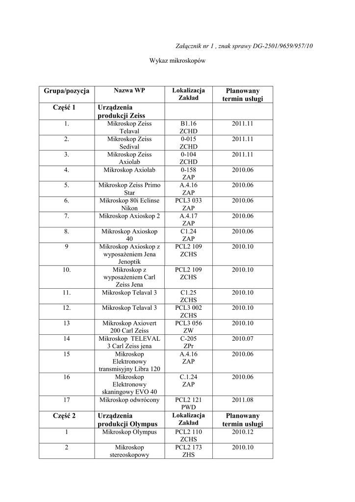 Załącznik nr 1 , znak sprawy DG-2501/9659/957/10 Wykaz mikroskopów Grupa/pozycja Część 1 1. 2. 3. 4. 5. 6. 7. 8. Nazwa WP Mikroskop Zeiss Telaval Mikroskop Zeiss Sedival Mikroskop Zeiss Axiolab Mikroskop Axiolab Mikroskop Zeiss Primo Star Mikroskop 80i Eclinse Nikon Mikroskop Axioskop 2 11. 12. Mikroskop Telaval 3 13 Mikroskop Axiovert 200 Carl Zeiss Mikroskop TELEVAL 3 Carl Zeiss jena Mikroskop Elektronowy transmisyjny Libra 120 Mikroskop Elektronowy skaningowy EVO 40 Mikroskop odwrócony 10. 14 15 16 17 Część 2 Planowany termin usługi B1.16 ZCHD 0-015 ZCHD 0-104 ZCHD 0-158 ZAP A.4.16 ZAP PCL3 033 ZAP A.4.17 ZAP C1.24 ZAP PCL2 109 ZCHS 2011.11 Urządzenia produkcji Zeiss Mikroskop Axioskop 40 Mikroskop Axioskop z wyposaŜeniem Jena Jenoptik Mikroskop z wyposaŜeniem Carl Zeiss Jena Mikroskop Telaval 3 9 Lokalizacja Zakład Urządzenia produkcji Olympus 1 Mikroskop Olympus 2 Mikroskop stereoskopowy 2011.11 2011.11 2010.06 2010.06 2010.06 2010.06 2010.06 2010.10 PCL2 109 ZCHS 2010.10 C1.25 ZCHS PCL3 002 ZCHS PCL3 056 ZW C-205 ZPr A.4.16 ZAP 2010.10 2010.10 2010.10 2010.07 2010.06 C.1.24 ZAP 2010.06 PCL2 121 PWD Lokalizacja Zakład PCL2 110 ZCHS PCL2 173 ZHS 2011.08 Planowany termin usługi 2010.12 2010.10 3 4 5 6 7 8 Olympus SZ 40 Mikroskop Olympus CX 41 Mikroskop Olympus Mikroskop odwrócony CKX 31 Olympus Mikroskop odwrócony Olympus IX 70 Optical Mikroskop CK2-TR Olympus Mikroskop Olympus Sz 40 Część 3 Urządzenia produkcji Nikon 1 Mikroskop Nikon 2 Mikroskop z wyposaŜeniem Nikon Mikroskop odwrócony Nikon Mikroskop Nikon Mikroskop Nikon 3 4. 5 Część 4 1 Część 5 1 2 Urządzenia produkcji PZO Mikroskop odwróconego pola PZO Polska Urządzenia produkcji Leica Mikroskop Leica MZ 7,5 Mikroskop Leica DM LB2 C3.22 ZHS PCL2 101 ZW PCL3 011 ZW PCL3 056 ZW C-205 ZPr 1 007 ZHZ Lokalizacja Zakład PCL2 173 ZCHS PCL2 173 ZCHS PCl2 173 ZCHS PCL3 003 ZCHS 1 062 ZHZ Lokalizacja Zakład 2010.10 2010.07 2010.07 2010.07 2010.07 2010.10 Planowany termin usługi 2010.10 2010.12 2010.10 2010.10 2010.10 Planowany termin usługi PCL2 173 ZCHS 2010.10 Lokalizacja Zakład Planowany termin usługi C3.22 ZHS C3.22 ZHS 2010.10 2010.10