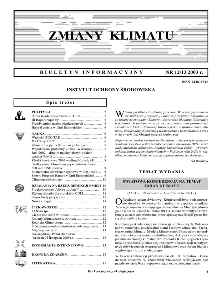 BIULETYN INFORMACYJNY NR 12/13 2003 r. ISSN 1426-9546 INSTYTUT OCHRONY ŚRODOWISKA Spis treści POLITYKA ......................................................... Ósma Konferencja Stron – COP 8 ........................ III Raport rządowy ................................................ Trendy emisji gazów cieplarnianych .................... Handel emisją w Unii Europejskiej ...................... 2 2 3 4 6 NAUKA .............................................................. 6 Wnioski IPCC TAR .............................................. 6 XXI Sesja IPCC ................................................... 6 Klimat Europy na tle zmian globalnych ............... 7 Współczesne problemy klimatu Warszawy .......... 7 Rok 2002 – drugim najcieplejszym rokiem według WMO ....................................................... 8 Klęski żywiołowe 2002 według Munich RE ........ 8 Skutki zmian klimatu mogą kosztować Świat 300 mld USD rocznie ........................................... 9 Ekstremalne zjawiska pogodowe w 2003 roku .... 9 Szósty Program Ramowy Unii Europejskiej ......... 9 Climateprediction.net ........................................... 10 DZIAŁANIA NA RZECZ REDUKCJI EMISJI 10 Proekologiczne oblicze „Łubnej” ........................ 10 Zielone światło dla projektów CDM ................... 11 Samochody przyszłości ........................................ 11 Nowa energia ....................................................... 11 CIEKAWOSTKI ................................................ 12 El Niño śpi ........................................................... 12 Ciepłe lato 2003 w Polsce .................................... 12 Zmiany klimatyczne w Arktyce ............................ 12 Koalicja Klimatyczna ........................................... 12 Śródziemnomorska bioróżnorodność zagrożona ... 13 Migracja zwierząt ................................................. 13 Stan ratyfikacji Protokołu z Kioto (na dzień 25 listopada 2003 r.) ............................... 13 INFORMACJE INTERNETOWE ................... 13 KRONIKA ZDARZEŃ ...................................... 14 LITERATURA ................................................... 15 W itamy po blisko dwuletniej przerwie. W podwójnym numerze biuletynu pragniemy Państwu przybliżyć zagadnienia związane ze zmianami klimatu i dostarczyć aktualne informacje o działaniach podejmowanych na rzecz wdrażania postanowień Protokołu z Kioto i Ramowej konwencji NZ w sprawie zmian klimatu, zwanej dalej Konwencją Klimatyczną, i to zarówno te z aren światowych, jak również naszych krajowych. Najnowszym bardzo ważnym wydarzeniem, o którym spieszymy powiadomić Państwa, jest zatwierdzenie w dniu 4 listopada 2003 r. przez Radę Ministrów dokumentu Polityka klimatyczna Polski – strategie redukcji emisji gazów cieplarnianych w Polsce do roku 2020. W najbliższym numerze biuletynu szerzej zaprezentujemy ten dokument. Od Redakcji T E M AT W Y D A N I A ŚWIATOWA KONFERENCJA NA TEMAT ZMIAN KLIMATU (Moskwa, 29 września – 3 października 2003 r.) O ficjalnym celem Światowej Konferencji było podsumowanie dorobku światowej klimatologii w aspekcie wyników Trzeciego raportu oceniającego zmiany klimatu Międzyrządowego Zespołu ds. Zmian Klimatu (IPCC). Jednak w praktyce konferencja została zdominowana przez sprawę ratyfikacji przez Rosję Protokołu z Kioto. Konferencja składała się z siedmiu sesji problemowych: Rola oceanów, atmosfery, powierzchni ziemi i wpływ człowieka, Scenariusze zmian klimatu, Modele klimatyczne, Ekosystemy naturalne, Rolnictwo, leśnictwo i rybołówstwo, Arktyka i inne obszary podatne na zmiany klimatu oraz Protokół z Kioto – jego efektywność i przyszłość, a także sesji posterów i trzech sesji tematycznych poświęconych energetyce i klimatowi oraz forum biznesu węglowego i forum społecznego. W trakcie konferencji przedstawiono ok. 100 referatów i kilkadziesiąt posterów. W znakomitej większości referującymi byli przedstawiciele Rosji, reprezentujący różne dziedziny nauki. ZMIANY KLIMATU – BIULETYN INFORMACYJNY Druk na papierze ekologicznym 1 Konferencja zgromadziła ok. 1900 uczestników. Uczestniczył w niej m.in. Prezydent W. Putin, wicepremier Rosji, b. premier E. Primakow oraz sekretarze lub dyrektorzy wykonawczy WMO, UNEP, IPCC, Konwencji Wiedeńskiej i Protokołu Montrealskiego oraz Konwencji Klimatycznej, a także ministrowie ds. środowiska Francji, Kanady i Norwegii. Prezydent Putin w swoim wystąpieniu uzasadniał zwłokę w podejmowaniu decyzji w sprawie ratyfikacji Protokołu z Kioto, twierdząc, że stanowiłoby to zbyt poważne obciążenie dla rosyjskiej gospodarki, a ocieplenie może być korzystne. Zakończył stwierdzeniem, że rząd będzie dalej analizował możliwości ratyfikacji wspomnianego protokołu. Stanowisko prezydenta Putina spotkało się z negatywną reakcją wymienionych ministrów, a także większości uczestników konferencji nie wyłączając naukowców rosyjskich i rosyjskiego biznesu. Konferencja koncentrowała się na przeglądzie postępu nauki w sprawach zmian klimatu, w tym także zakresu niepewności uzyskiwanych wyników. Dorobek nauki zachodniej jest polskim specjalistom dobrze znany. Znacznie mniej wiemy o dorobku nauki rosyjskiej. Z tego względu wydaje się celowe skoncentrowanie się przede wszystkim na referatach prezentowanych przez przedstawicieli Rosji. Z przeglądu dorobku nauki rosyjskiej wynika, że proces ocieplenia jest już widoczny w Rosji w postaci nie tylko wzrostu ilości opadów i przepływów rzecznych (zwłaszcza na Syberii) oraz wydłużenia się okresu wegetacyjnego, ale także wyrażający się w intensyfikacji procesu topienia się wiecznej zmarzliny. Pierwsze zjawiska mają korzystny wpływ i powodują, że plony zbóż są o wiele bardziej obfite, ostatnie natomiast zjawisko ma bardzo niekorzystny wpływ na infrastrukturę komunalną, transportową i przemys
