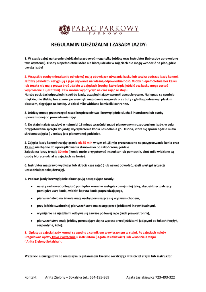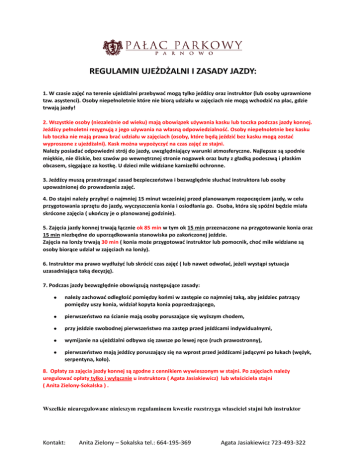 REGULAMIN UJEŻDŻALNI I ZASADY JAZDY: 1. W czasie zajęć na terenie ujeżdżalni przebywać mogą tylko jeźdźcy oraz instruktor (lub osoby uprawnione tzw. asystenci). Osoby niepełnoletnie które nie biorą udziału w zajęciach nie mogą wchodzić na plac, gdzie trwają jazdy! 2. Wszystkie osoby (niezależnie od wieku) mają obowiązek używania kasku lub toczka podczas jazdy konnej. Jeźdźcy pełnoletni rezygnują z jego używania na własną odpowiedzialność. Osoby niepełnoletnie bez kasku lub toczka nie mają prawa brać udziału w zajęciach (osoby, które będą jeździć bez kasku mogą zostać wyproszone z ujeżdżalni). Kask można wypożyczyć na czas zajęć ze stajni. Należy posiadać odpowiedni strój do jazdy, uwzględniający warunki atmosferyczne. Najlepsze są spodnie miękkie, nie śliskie, bez szwów po wewnętrznej stronie nogawek oraz buty z gładką podeszwą i płaskim obcasem, sięgające za kostkę. U dzieci mile widziane kamizelki ochronne. 3. Jeźdźcy muszą przestrzegać zasad bezpieczeństwa i bezwzględnie słuchać instruktora lub osoby upoważnionej do prowadzenia zajęć. 4. Do stajni należy przybyć o najmniej 15 minut wcześniej przed planowanym rozpoczęciem jazdy, w celu przygotowania sprzętu do jazdy, wyczyszczenia konia i osiodłania go. Osoba, która się spóźni będzie miała skrócone zajęcia ( ukończy je o planowanej godzinie). 5. Zajęcia jazdy konnej trwają łącznie ok 85 min w tym ok 15 min przeznaczone na przygotowanie konia oraz 15 min niezbędne do uporządkowania stanowiska po zakończonej jeździe. Zajęcia na lonży trwają 30 min ( konia może przygotować instruktor lub pomocnik, choć mile widziane są osoby biorące udział w zajęciach na lonży). 6. Instruktor ma prawo wydłużyć lub skrócić czas zajęć ( lub nawet odwołać, jeżeli wystąpi sytuacja uzasadniająca taką decyzję). 7. Podczas jazdy bezwzględnie obowiązują następujące zasady: należy zachować odległość pomiędzy końmi w zastępie co najmniej taką, aby jeździec patrzący pomiędzy uszy konia, widział kopyta konia poprzedzającego, pierwszeństwo na ścianie mają osoby poruszające się wyższym chodem, przy jeździe swobodnej pierwszeństwo ma zastęp przed jeźdźcami indywidualnymi, wymijanie na ujeżdżalni odbywa się zawsze po lewej ręce (ruch prawostronny), pierwszeństwo mają jeźdźcy poruszający się na wprost przed jeźdźcami jadącymi po łukach (wężyk, serpentyna, koło). 8. Opłaty za zajęcia jazdy konnej są zgodne z cennikiem wywieszonym w stajni. Po zajęciach należy uregulować opłaty tylko i wyłącznie u instruktora ( Agata Jasiakiewicz) lub właściciela stajni ( Anita Zielony-Sokalska ) . Wszelkie nieuregulowane ninieszym regulaminem kwestie rozstrzyga własciciel stajni lub instruktor Kontakt: Anita Zielony – Sokalska tel.: 664-195-369 Agata Jasiakiewicz 723-493-322 Kontakt: Anita Zielony – Sokalska tel.: 664-195-369 Agata Jasiakiewicz 723-493-322