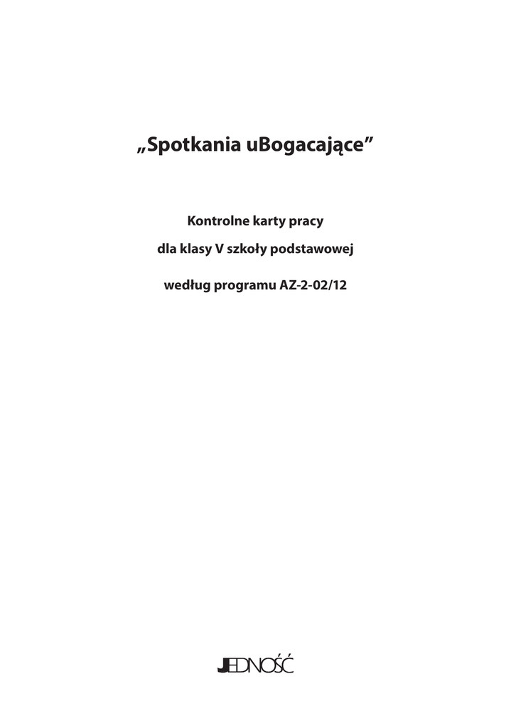 „Spotkania uBogacające” Kontrolne karty pracy dla klasy V szkoły podstawowej według programu AZ-2-02/12 Autor Ewelina Parszewska Rysunki Ola Makowska Redakcja techniczna Wiktor Idzik © Copyright by Wydawnictwo „JEDNOŚĆ”, Kielce 2016 WYDAWNICTWO „JEDNOŚĆ” 25-013 Kielce, ul. Jana Pawła II nr 4 Dział sprzedaży tel. 041 349 50 50 Redakcja tel. 041 349 50 00 www.jednosc.com.pl e-mail: [email protected] Wstęp Poniższe kontrolne karty pracy zostały przygotowane w oparciu o program nauczania religii dla klas IV-VI szkoły podstawowej „Odkrywamy tajemnice Bożego świata” nr AZ-2-02/12 w odniesieniu do klasy V. Są skorelowane z podręcznikiem pt. „Spotkania uBOGAcające”. Zaplanowano je tak, aby po każdym rozdziale uczeń mógł wykazać się wiedzą i umiejętnościami nabytymi podczas zajęć. Zróżnicowany stopień trudności zadań oraz różnorodność zastosowanych metod (np. quizy, puzzle, uzupełnienia, krzyżówki, plątaniny oraz zadania otwarte) pozwala na pełne zaangażowanie się wszystkich uczniów. Zestawy kart dopełnia tabela z odpowiedziami i proponowaną punktacją – pomocne w ocenianiu prac uczniów. Karta pracy nr 1 Rozdział I – „Moi przodkowie, bracia i siostry” Imię ……………………………………………… Nazwisko ………………………………………… Klasa V ……………… 1. W czym pomaga najlepszy przyjaciel? ………………………………………………………………………………………………………… 2. W miejsce kropek wpisz odpowiednio następujące wyrazy: Bogiem, Biblia, Pismo Święte, bezpośredni, Bogu. ……………… jest księgą, w której spotykamy się z ………………………… Kto czyta …………………………………………, daje możliwość przemawiania do siebie ………………… w sposób …………………………………… 3. Rozwiąż quiz na temat biblijnego opowiadania o stworzeniu świata. Przy każdym zdaniu zaznacz: prawda (P) lub fałsz (F). 1) Bóg stworzył świat w ciągu 6 dni. P/F 2) Pan Bóg, stwarzając świat, posługiwał się powietrzem. P/F 3) Stworzyć to znaczy powołać do istnienia z niczego. P/F 4. Spośród podanych darów otrzymanych od Boga, znajdź i pokreśl te, które sprawiają, że człowiek jest do Niego podobny. WZROK, WĘCH, NIEŚMIERTELNA DUSZA, SŁUCH, ROZUM, UMIEJĘTNOŚĆ MÓWIENIA, WOLNA WOLA rz a łaską u ch e z e z A d a m r w a g E nas ś wi ę ją ca er pi worodny ia w ptaki an Ch zi gład r oz n s t drzewo p 5. Przejdź przez labirynt i odczytaj, co powoduje w nas chrzest. Zapisz rozwiązanie. cą. a i obd ………………………………………………………………………………………………………… 4 „Spotkania uBogacające” – karty pracy dla klasy V 6. Kierując się strzałkami, odczytaj, w czym pomaga sakrament pokuty i pojednania. Zapisz rozwiązanie. pokuty Sakrament pomaga i z ludźmi. z Bogiem utrzymywać relacje dobre ………………………………………………………………………………………………………… ………………………………………………………………………………………………………… 7. Rozwiąż krzyżówkę i odczytaj, co się wydarzyło, gdy ludzie sprzeciwiali się Bogu i nie zwracali uwagi na Jego upomnienia. 1 2 3 4 5 1) Takim człowiekiem był Noe. 2) Wezbrały, a po 40 dniach opadły. 3) Bóg kazał wziąć je do arki po parze. 4) Noe zbudował go dla Pana po wyjściu z arki. 5) Takim Sędzią jest Bóg. 8. Czyj to patron? Połącz odpowiednio. 1) św. Franciszek to patron 2) św. Stanisław Kostka to patron 3) św. Joachim i św. Anna to patroni a) dzieci i młodzieży, b) dziadków c) ekologów 9. Dokończ słowa modlitwy do Anioła Stróża. Aniele Boży, Stróżu mój, Ty ………………………………………………………………………… ………………………………………………………………………………………………………… ………………………………………………………………………………………………………… ………………………………………………………………………………………………………… „Spotkania uBogacające” – karty pracy dla klasy V 5 Karta pracy nr 2 Rozdział II – „Patriarchowie, przywódcy, prorocy” Imię ……………………………………………… Nazwisko ………………………………………… Klasa V ……………… 1. Rozwiąż quiz na temat spotkania Abrahama z Bogiem. Przy każdym zdaniu zaznacz: prawda (P) lub fałsz (F). 1) Pan ukazał się Abrahamowi pod klonem. P/F 2) Abraham i Sara nie mieli potomstwa, choć bardzo tego pragnęli. P/F 3) Pan Bóg obiecał Abrahamowi i Sarze syna. P/F 2. Z podanych imion wybierz i zaznacz to, które otrzymał Jakub po walce z aniołem. – Neftali – Józef – Izrael – Lewi 3. Wpisz do kratek zaznaczone literki i odczytaj, co prowadzi do pojednania. „Ja jestem Józef, brat wasz, to ja jestem tym, którego sprzedaliście do Egiptu. Ale teraz nie smućcie się i nie wyrzucajcie sobie, żeście mnie sprzedali. Bo dla waszego ocalenia od śmierci Bóg wysłał mnie tu przed wami. Oto już dwa lata trwa głód w tym kraju, a jeszcze zostało pięć, podczas których nie będzie orki ani żniwa. Bóg mnie wysłał tu przed wami, aby wam zapewnić potomstwo na ziemi i abyście przeżyli dzięki wielkiemu wybawieniu. Zatem nie wyście mnie wysłali, lecz Bóg”. (Rdz 45,4-8) 4. Napisz, czego uczą nas Mojżesz i Aaron. ………………………………………………………………………………………………………… 5. Dokończ zdanie. Po śmierci Mojżesza narodowi wybranemu w dalszej drodze i zdobywaniu Ziemi Obiecanej przewodniczył …………………… 6. W miejsce kropek wpisz odpowiednio następujące wyrazy: