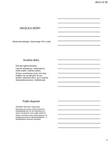 2013-12-29 GRUŹLICA SKÓRY Klinika Dermatologii i Wenerologii UM w Łodzi Gruźlica skóry Choroba ogólnoustrojowa Czynnik etiologiczny: kwasooporny, ludzki prątek, rzadziej bydlęcy Zmiany wywoływane przez inne typy prątków nie są zaliczane do tzw. gruźlicy właściwej skóry; są to wykwity niecharakterystyczne i krótkotrwałe Prątki atypowe Określane także jako niegruźlicze Wywołują one zmiany skórne klinicznie i histopatologicznie nie do odróżnienia od zmian wywołanych przez prątki właściwe. Zmiany wywołane przez prątki atypowe nie poddają się leczeniu tuberkulostatykami , a antybiotykami nowszych generacji 1 2013-12-29 Gruźlica skóry Rozpoznanie gruźlicy skóry stawia się na podstawie: 1. Obrazu klinicznego 2. Wyniku badania histopatologicznego (charakterystyczne utkanie) 3. Nadwrażliwości na tuberkulinę 4. (+) wyniku badania na obecność prątków/ stwierdzenie obecności DNA (znaczenie rozstrzygające) Gruźlica skóry Charakter kliniczny ogniska gruźlicy skóry zależy od: 1. Zjadliwości i ilości materiału zakażającego 2. Wrót wejścia prątka 3. Odczynowości ustroju 4. Odporności ustroju Gruźlica skóry W skórze, prątki gruźlicy nie mają tak dobrych warunków do rozwoju jak w narządach wewnętrznych, ponieważ: 1. Nieuszkodzona skóra stanowi barierę mechaniczną 2. Komórki tkanki łącznej fagocytują prątki 3. Włókna łącznotkankowe ograniczają przenikanie prątków 4. Mukopolisacharydy zawarte w substancji podstawowej podścieliska osłabiają zjadliwość prątków 2 2013-12-29 Gruźlica skóry Cechy charakterystyczne gruźlicy skóry: 1. Przewlekły i łagodny przebieg 2. Różne nasilenie alergii na tuberkulinę 3. Duża odporność 4. Nie zawsze spełnione są wszystkie postulaty Kocha Postulaty Kocha 1. 2. 3. 4. 5. Wykazanie prątków gruźliczych w preparatach bezpośrednich Dodatnie posiewy na odpowiednich podłożach Szczepienie zwierząt doświadczalnych w celu stwierdzenia zjadliwości prątków Charakterystyczne utkanie histologiczne Nadwrażliwość na tuberkulinę Gruźlica skóry Utkanie histologiczne: 1.Gruzełki składające się z: - pojedynczych komórek olbrzymich Langhansa z jądrami ułożonymi na obwodzie - skupień komórek nabłonkowatych - obwodowo ułożonego pasma limfocytów 2. Martwica 3 2013-12-29 Gruźlica skóry W przypadku gruźlicy skóry należy pamiętać, że: 1. Nie jest to schorzenie wymierające 2. Nie leczy się jedynie ogniska gruźliczego, ale całego człowieka chorego na gruźlicę 3. Ognisko gruźlicy bez względu na lokalizację i charakter kliniczny stanowi objaw schorzenia ogólnego jakim jest gruźlica Klasyfikacja gruźlicy skóry I. Gruźlica skóry właściwej: toczniowa węzłowa rozpływna brodawkująca i wrzodziejąca II. Tuberkulidy guzkowo-zgorzelinowy rumień stwardniały lupoid prosówkowy twarzy Tuberkulidy Jest to odczyn alergiczny na prątki lub ich składowe, bądź też inne bakterie odgrywające rolę antygenów. 4 2013-12-29 Różnicowanie Gruźlica skóry właściwa Tuberkulidy Stwierdzenie prątka w ognisku Trudne, ale możliwe Nigdy nie wykrywa się Odporność Różna Znaczna Alergia na tuberkulinę Różna Wybitna Szerzenie się procesu chorobowego Rozrost ognisk, rzadko drogą krwi lub chłonki Drogą krwiopochodną Gruźlica toczniowa Guzek żółtobrunatny lub czerwonobrunatny Skłonność do przerostu, rozpadu, bliznowacenia Powolny rozwój (+) objaw diaskopii Lokalizacja – gł. twarz – ryzyko rozwoju ca kolczystokomórkowego Postacie: płaska, przerosła i wrzodziejąca, brodawkująca Gruźlica rozpływna Guz/ guzek w tkance podskórnej, następnie rozmiękające nacieki z przetokami i owrzodzeniami – okolica węzłów chłonnych i stawów Ustępowanie z pozostawieniem blizn – charakterystyczne, pozaciągane Lokalizacja: okolica podżuchwowa, nadobojczykowa, mostkowa, twarz Charakterystyczna duża odporność 5 2013-12-29 Gruźlica brodawkująca Hiperkeratotyczne, brodawkowate ogniska w obrębie skóry odsłoniętej – ręce Charakterystyczna duża odporność Gruźlica wrzodziejąca Obecnie rzadko Dotyczy błon śluzowych Występuje u osób z obniżoną odpornością chorujących na tbc narządową Odczyn tuberkulinowy Jest skórną reakcją badanego na wstrzyknięcie antygenów prątka z charakterystycznym tworzeniem u osób uprzednio eksponowanych nacieku i rumienia. Odczyn może być poszczepienny (powstający w wyniku szczepienia) oraz pozakaźny (jako wyraz naturalnego zakażenia prątkiem). 6 2013-12-29 Odczyn tuberkulinowy Wiele lat był traktowany jako metoda wykrywania zakażenia; stwierdzenie (+) OT wymaga dalszej diagnostyki Badanie nadwrażliwości przed i poszczepiennej Bardziej pomocny u dzieci niż u dorosłych (diagnostyka gruźlicy u dzieci) (+) odczyny występują u osób szczepionych i nie są jednoznaczne z zakażeniem Tbc Odczyn tuberkulinowy Środkowa część 1/3 górnej, grzbietowej powierzchni lewego przedramienia 0.1 ml roztworu tuberkuliny (natychmiast pojawia się bąbel o średnicy 8-10 mm, znika po kilku minutach) Odczyt po 72 h (wg WHO 48-72 h) Mierzymy poprzeczną do długiej osi przedramienia średnicę nacieku (stwardnienia); w ocenie nie uwzględnia się wielkości obrzęku, ani rumienia „prawdziwy” odczyn tuberkulinowy utrzymuje się wiele dni lub tygodni (odczyn po zakażeniu prątkami atypowymi znika w ciągu kilku dni) Odczyn tuberkulinowy Odczyt, wg norm polskich: 1. OT > 10-12 mm (+) 2. OT 6-10 mm – reakcja poszczepienna 3. OT < 6 mm (-) Normy proponowane przez głównego producenta tuberkuliny: 1. OT < 5 mm (-) 2. OT 6 – 14 mm (+) 3. OT > 15 mm żywo (+) 7 2013-12-29 Odczyn tuberkulinowy Istnieją czynniki, które mogą hamować reakcję na tuberkulinę lub wpływać na jej wygaśnięcie: - ciężki stan ogólny - choroby zakaźne (odra, ospa, różyczka, zakażenia mykoplazmatyczne) - leki immunosupresyjne oraz cytostatyczne - niedoczynność tarczycy - cukrzyca Odczyn tuberkulinowy W 