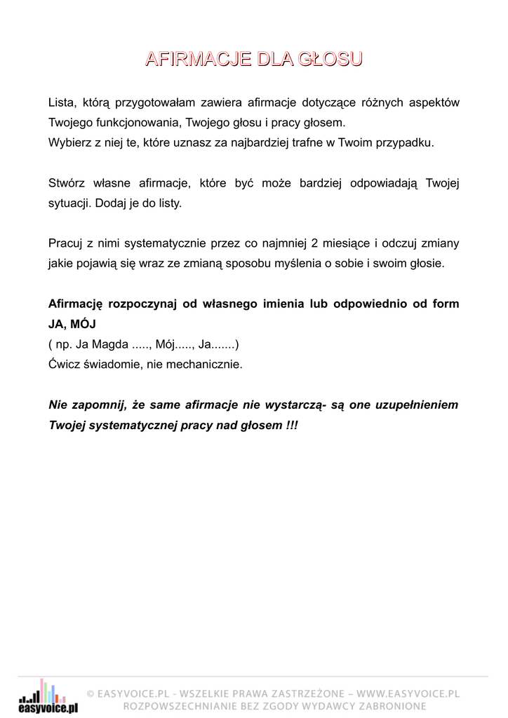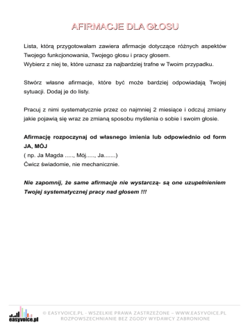 AFIRMACJE DLA GŁOSU Lista, którą przygotowałam zawiera afirmacje dotyczące różnych aspektów Twojego funkcjonowania, Twojego głosu i pracy głosem. Wybierz z niej te, które uznasz za najbardziej trafne w Twoim przypadku. Stwórz własne afirmacje, które być może bardziej odpowiadają Twojej sytuacji. Dodaj je do listy. Pracuj z nimi systematycznie przez co najmniej 2 miesiące i odczuj zmiany jakie pojawią się wraz ze zmianą sposobu myślenia o sobie i swoim głosie. Afirmację rozpoczynaj od własnego imienia lub odpowiednio od form JA, MÓJ ( np. Ja Magda ....., Mój....., Ja.......) Ćwicz świadomie, nie mechanicznie. Nie zapomnij, że same afirmacje nie wystarczą- są one uzupełnieniem Twojej systematycznej pracy nad głosem !!! MOWA ● mówię pewnie i zdecydowanie ● mówię odważnie ● mówię z radością i entuzjazmem ● gdy mówię czuję się bezpiecznie ● lubię zabierać głos na forum ● mówię swobodnie, bez skrępowania i lęku ● lubię, gdy ludzie mnie słuchają ● mam doskonałą emisję głosu i nieustannie nad nią pracuję ● mam świetną dykcję i systematycznie nad nią pracuję ● mówię bez trudu i z lekkością ● mówię spokojnie, w odpowiednim tempie ● mówię w średnicy mojego głosu ● mówią zachowując otwartą krtań ● mówię bez wysiłku wykorzystując podparcie oddechowe ● mówię wyprowadzając głos do przodu, na „maskę” ● mówię ciekawie i interesująco ● mówię najlepiej jak potrafię ● doskonalę i rozwijam moją mowę ● mogę mówić głośno ● odważnie wypowiadam swoje zdanie ● mówię z miłością ● mówię rytmicznie, unikam monotonii GŁOS ● mój głos pomaga mi osiągnąć sukces ● codziennie odkrywam doskonałość mojego głosu ● mój głos zmienia się wraz ze mną, pozwalam sobie i swojemu głosowi na zmiany ● podążam za moim głosem i pozwalam, by mnie prowadził ● kocham siebie i kocham mój głos ● kocham i akceptuję mój głos ● mój głos doskonale wyraża moją osobowość, charakter i uczucia ● mój głos jest pełen radości, optymizmu i entuzjazmu ● mój głos jest źródłem radości ● mój głos jest pełen ekspresji, wyrazu i charakteru ● mój głos jest piękny ● mój głos promienieje naturalnym pięknem; jest prawdziwy i autentyczny ● mój głos jest dźwięczny ● mój głos przykuwa uwagę innych i czuję się z tym bardzo dobrze ● codziennie na nowo poznaję mój głos, odkrywam jego możliwości ● z odwagą i radością przekraczam granice narzucone mojemu głosowi przez innych i samego(ą) siebie ● akceptuję siłę mojego głosu ● akceptuję wrażliwość mojego głosu ŚPIEW ● śpiewam z radością ● mój śpiew niesie emocje ● śpiewam całą(ym) sobą ● gdy śpiewam czuję się bezpiecznie ● śpiewając czuję się swobodnie ● śpiewając pozwalam sobie na swobodne improwizowanie ● śpiewam rytmicznie ● śpiewam bez lęku przed oceną innych ● śpiewam odważnie ● śpiewam pewnie ● mam doskonałą technikę wokalną i nieustannie nad nią pracuję ● oryginalnie interpretuję utwory ● śpiewam najlepiej jak potrafię ● doskonalę i rozwijam mój śpiew ĆWICZENIA ● pracuję nad moim głosem i osiągam ustalone cele ● każde ćwiczenie wykonuję świadomie, spokojnie i dokładnie ● z każdego wykonanego ćwiczenia wyciągam wnioski, co pozwala mi lepiej pracować nad moim głosem ● każde wykonane ćwiczenie przybliża mnie do sukcesu ● ćwiczę z radością i entuzjazmem ● z każdym poprawnie wykonywanym ćwiczeniem mój głos staje się coraz bardziej sprawny i pozwala wyrażać siebie ● potrafię wykonać każde ćwiczenie poprawnie, krok po kroku osiągając sukces ● z każdym ćwiczeniem rozwijam się i udoskonalam mój głos ● każdy dźwięk jest dla mnie dostępny ● z radością i entuzjazmem poznaję moje możliwości ● zauważam zmiany jakie zachodzą pod wpływem ćwiczeń PRACA GŁOSEM ● mój głos jest wolny od tremy i lęków ● wyrażam siebie poprzez mój głos ● dobrze jest być sobą, mój głos daje temu wyraz ● korzystam z mojej wiedzy w praktyce ● dbam o mój głos ● otaczam mój głos opieką INNE ● jestem wdzięczna(y) za mój głos i wyrażam to ● zawsze oddycham spokojnie i swobodnie, napełniam się siłą i pewnością ● wyrażam swoje „ja” z radością i odwagą ● kocham moje ciało, dbam o nie, opiekuję się nim i pozwalam mu wydobywać najpiękniejsze dźwięki ● z radością i lekkością uwalniam się od przeszłości, pozwalam, by czas leczył rany ● otwieram się na zmiany, z radością witam nowe ● jestem bezpieczna(y) i wyrażam swoje „ja” ● czuję się dobrze w moim ciele ● znam swoją prawdziwą wartość ● wierzę w siebie ● lubię siebie ● kocham i akceptuję siebie ● mam w sobie wszystko, czego potrzeba aby osiągnąć sukces i być szczęśliwym człowiekiem ● biorę odpowiedzialność za siebie i swoje życie ● mam prawo wyrażać swoje emocje ● jestem na właściwym miejscu ● w każdej chwili mogę zacząć od nowa ● wierzę w to, że zmiany są dobre i bezpieczne