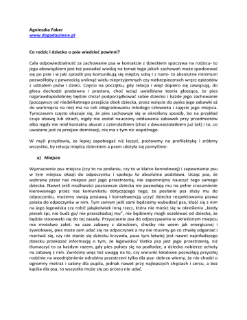 Agnieszka Faber www.dogadajciesie.pl Co rodzic i dziecko o psie wiedzieć powinni? Cała odpowiedzialność za zachowanie psa w kontakcie z dzieckiem spoczywa na rodzicu- to jego obowiązkiem jest też posiadać wiedzę na temat tego jakich zachowań może spodziewać się po psie i w jaki sposób psy komunikują się między sobą i z nami- to absolutne minimum pozwoliłoby z pewnością uniknąć wielu nieprzyjemnych czy niebezpiecznych wręcz epizodów z udziałem psów i dzieci. Często na początku, gdy relacja i więź dopiero się zawiązują, do głosu dochodzi pradawna i prastara, choć wciąż uwielbiana teoria głosząca, że pies najprawdopodobniej będzie chciał podporządkować sobie dziecko i każde jego zachowanie (począwszy od niedelikatnego przejścia obok dziecka, przez wzięcie do pyska jego zabawki aż do warknięcia na nie) ma na celi zdegradowaniu młodego człowieka i zajęcie jego miejsca. Tymczasem często okazuje się, że pies zachowuje się w określony sposób, bo na przykład czuje obawę lub strach, nigdy nie został nauczony oddawania zabawek przy przedmiotów albo nigdy nie miał kontaktu akurat z czterolatkiem (choć z dwunastolatkiem już tak) i to, co uważane jest za przejaw dominacji, nie ma z tym nic wspólnego. W myśl przysłowia, że lepiej zapobiegać niż leczyć, postawmy na profilaktykę i zróbmy wszystko, by relacja między dzieckiem a psem ułożyła się pomyślnie: a) Miejsce Wyznaczenie psu miejsca (czy to na posłaniu, czy to w klatce kennelowej) i zapewnienie psu w tym miejscu okazji do odpoczynku i spokoju to absolutna podstawa. Ucząc psa, że wybrane przez nas miejsce jest jego przestrzenią, nie zapomnijmy nauczyć tego samego dziecka. Nawet jeśli możliwości poznawcze dziecka nie pozwalają mu na pełne zrozumienie kierowanego przez nas komunikatu dotyczącego tego, że posłanie psa służy mu do odpoczynku, możemy swoją postawą i konsekwencją uczyć dziecko respektowania prawa psiaka do odpoczynku w nim. Tym samym jeśli sami będziemy wybudzać psa, kłaść się z nim na jego legowisku czy robić jakąkolwiek inną rzecz, która nie mieści się w określeniu „kiedy piesek śpi, nie budź go/ nie przeszkadzaj mu”, nie będziemy mogli oczekiwać od dziecka, że będzie stosowało się do tej zasady. Przyuczenie psa do odpoczywania w określonym miejscu ma mnóstwo zalet: na czas zabawy z dzieckiem, choćby nie wiem jak energicznej i żywiołowej, pies może sam udać się na odpoczynek a my nie musimy go co chwilę odganiać i martwić się, czy nie stanie się dziecku krzywda, poza tym łatwiej jest nawet najmłodszego dziecku przekazać informację o tym, że legowisko/ klatka psa jest jego przestrzenią, niż tłumaczyć to za każdym razem, gdy pies położy się na podłodze, a dziecko nabierze ochoty na zabawę z nim. Zwróćmy więc też uwagę na to, czy warunki lokalowe pozwalają przyszłej rodzinie na wyodrębnienie odrobiny przestrzeni tylko dla psa- dobrze wiemy, że nie chodzi o ogromny metraż i salony dla pupila, jednak nawet przy najlepszych chęciach i sercu, a bez kącika dla psa, to wszystko może się po prostu nie udać. b) „Tak nie wolno!” Dużą wagę przyłóżmy do tego, czy wiemy tak naprawdę jaki kontakt fizyczny będzie dla psa komfortowy tak z naszej, jak ze strony naszego dziecka strony. Wiesz i przekazujesz dziecku komunikat, że pieska nie wolno kopać czy ciągnąć za ogon, ale zaraz potem widząc obrazek, na którym dziecko siedzi na psie jesteś skłonny/a się tym zachwycić. Tymczasem żadne z tych zachowań nie ma szansy być dla psa komfortowe- może być co najwyżej akceptowalne. Tolerowanie zachowania ze strony dziecka przez psa nie wystarczy, by zbudować trwałą i komfortową dla obu stron relację. Zamiast tego pokazuj i ucz tego, co dla obu stron tej interakcji może być przyjemne- jeśli głaskanie, to w okolicy klatki piersiowej, bokach czy brzuchu jeśli pies to lubi (unikając okolic głowy i karku), jeśli zabawy, to nie w berka, a w chowanie psu smakołyków, a jeśli potrzeba bliskości, to siedzenie i leżenie obok na jednym dywanie, zamiast na psie jak na dywanie. Kolejną ważną kwestią jest zapraszanie psa do kontaktu- dziecku, zwłaszcza młodszemu trudno jest ocenić, czy pies ma ochotę na kontakt dlatego też próbuje często bawić się z psem wtedy, gdy samo ma na to ochotę- podchodzi do psa, głaszcze go, gdy ten śpi, pokazuje mu zabawki, próbuje wkładać mu je do pyska lub też angażuje psa np. w zabawę w bal czy fryzjera i przebiera w stroje przeznaczone do tych zabaw czy układa mu fryzury z sierści. Zawsze w takiej sytuacji dorosły może wyjaśnić dziecku dlaczego pies może nie mieć ochoty na zabawę, dać alternatywę do przebierania go czy czesania i znaleźć taką „rolę”, która będzie akceptowalna również przez czworonoga. Uczenie dzieci rozpoznawania, czy pies ma ochotę na zabawę też nie musi być trudne- zawsze w takiej sytuacji dziecko może podejść niedaleko psa, zawołać go i pozwolić psu zdecydować- jednocześnie samo zobaczy, czy czas na zabawę czy nie- pies podejdzie lub nie. Dla dzieci wydarzenie jakim jest pojawienie się psa jest czymś bardzo ekscytującym i nie ma im się co dziwić, że pragną mieć z tej psiej obecności jak najwięcej. Nie chodzi o to, by im to zabierać w trosce o komfort psa, ale o to, by te kontakty aranżować i dawać zawsze alternatywę dla tego zachowania, które nie do końca może się psu podobać. c) Buduj w psie przyjemne skojarzenia z dzieckiem Wiemy już doskonale, że psie zachowania sterowane są niejako przez konsekwencje, jakie za sobą niosą, a z każdą osobą, rzeczą, zjawiskiem czy obiektem pies ma zbudowane określone skojarzenia, które mogą być przyjemne bądź nie. Dokładnie w ten sam sposób możemy zbudować w psie przyjemne skojarzenie z obecnością dziecka- pozwól dziecku nakarmić psa i podać mu miskę, przy okazji rozmawiając z ni