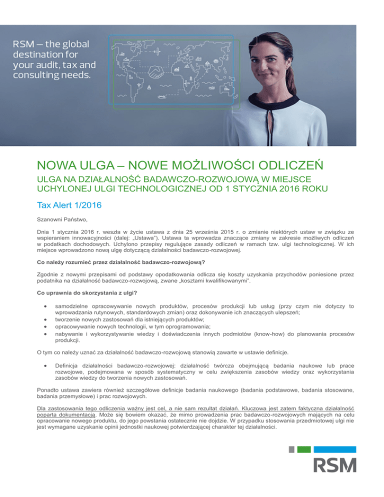 NOWA ULGA – NOWE MOŻLIWOŚCI ODLICZEŃ ULGA NA DZIAŁALNOŚĆ BADAWCZO-ROZWOJOWĄ W MIEJSCE UCHYLONEJ ULGI TECHNOLOGICZNEJ OD 1 STYCZNIA 2016 ROKU Tax Alert 1/2016 Szanowni Państwo, Dnia 1 stycznia 2016 r. weszła w życie ustawa z dnia 25 września 2015 r. o zmianie niektórych ustaw w związku ze wspieraniem innowacyjności (dalej: „Ustawa”). Ustawa ta wprowadza znaczące zmiany w zakresie możliwych odliczeń w podatkach dochodowych. Uchylono przepisy regulujące zasady odliczeń w ramach tzw. ulgi technologicznej. W ich miejsce wprowadzono nową ulgę dotyczącą działalności badawczo-rozwojowej. Co należy rozumieć przez działalność badawczo-rozwojową? Zgodnie z nowymi przepisami od podstawy opodatkowania odlicza się koszty uzyskania przychodów poniesione przez podatnika na działalność badawczo-rozwojową, zwane „kosztami kwalifikowanymi”. Co uprawnia do skorzystania z ulgi? samodzielne opracowywanie nowych produktów, procesów produkcji lub usług (przy czym nie dotyczy to wprowadzania rutynowych, standardowych zmian) oraz dokonywanie ich znaczących ulepszeń; tworzenie nowych zastosowań dla istniejących produktów; opracowywanie nowych technologii, w tym oprogramowania; nabywanie i wykorzystywanie wiedzy i doświadczenia innych podmiotów (know-how) do planowania procesów produkcji. O tym co należy uznać za działalność badawczo-rozwojową stanowią zawarte w ustawie definicje. Definicja działalności badawczo-rozwojowej: działalność twórcza obejmującą badania naukowe lub prace rozwojowe, podejmowana w sposób systematyczny w celu zwiększenia zasobów wiedzy oraz wykorzystania zasobów wiedzy do tworzenia nowych zastosowań. Ponadto ustawa zawiera również szczegółowe definicje badania naukowego (badania podstawowe, badania stosowane, badania przemysłowe) i prac rozwojowych. Dla zastosowania tego odliczenia ważny jest cel, a nie sam rezultat działań. Kluczowa jest zatem faktyczna działalność poparta dokumentacją. Może się bowiem okazać, że mimo prowadzenia prac badawczo-rozwojowych mających na celu opracowanie nowego produktu, do jego powstania ostatecznie nie dojdzie. W przypadku stosowania przedmiotowej ulgi nie jest wymagane uzyskanie opinii jednostki naukowej potwierdzającej charakter tej działalności. Przepisy nie wymagają ponoszenia przez przedsiębiorców dodatkowych kosztów np. tworzenia nowego miejsca pracy (można do tej działalności zaangażować dotychczas zatrudnionych pracowników) oraz tworzenia nowej wewnętrznej komórki/działu wyznaczonego jedynie do tego celu (np. działu badań i rozwoju). Odliczenie można stosować niezależnie od tego czy należności z tego tytułu zostały zapłacone kontrahentowi, czy też nie. Koszty kwalifikowane Możliwość odliczeń będzie znacznie szersza niż w przypadku uchylonej ulgi technologicznej, gdyż obejmuje m.in.: Koszty wynagrodzeń oraz składek: wynagrodzenie pracownika zatrudnionego na podstawie umowy o pracę w celu realizacji działalności badawczo–rozwojowej wraz ze składkami finansowanymi przez płatnika tych składek (dotyczy to również stosunku służbowego, pracy nakładczej oraz spółdzielczego stosunku pracy); Koszty materiałów i surowców: nabycie materiałów i surowców bezpośrednio związanych z prowadzoną działalnością badawczo-rozwojową; Koszty usług: wydatki poniesione na nabycie ekspertyz, opinii, usług doradczych i usług równorzędnych, a także na nabycie wyników badań naukowych, świadczonych lub wykonywanych na podstawie umowy przez jednostkę naukową; Koszty związane z korzystaniem z aparatury naukowo-badawczej: warunkiem odliczenia jest, aby korzystanie nie wynikało z umowy zawartej z podmiotem powiązanym z podatnikiem; Odpisy amortyzacyjne: zaliczane do kosztów uzyskania przychodów odpisy amortyzacyjne od środków trwałych oraz wartości niematerialnych i prawnych wykorzystywanych w prowadzonej działalności badawczorozwojowej, z wyłączeniem samochodów osobowych oraz budowli, budynków i lokali będących odrębną własnością. Dotyczy to przykładowo: maszyn, patentów na wynalazki, licencji na oprogramowanie, know-how. Zasady odliczenia W związku z ponoszeniem ww. kosztów podatnik uzyskuje korzyść podatkową na dwóch etapach: Etap 1: zaliczenie wydatku w pełnej wysokości do kosztów podatkowych; Etap 2: dodatkowo odliczenie tego kosztu od podstawy opodatkowania z zastrzeżeniem, że odliczenie nie może przekroczyć 30%, 20% lub 10% jego wysokości, w zależności od jego rodzaju oraz statusu podmiotu dokonującego odliczenia. Ustawowe limity odliczeń 30% – dotyczy kosztów związanych z wypłatą wynagrodzeń osób pracującym przy projektach innowacyjnych; 20% (w przypadku dużych firm 10%) – dotyczy kosztów nabycia surowców i materiałów, ekspertyz, usług doradczych, wyników badań naukowych, odpłatnego korzystania z aparatury naukowo-badawczej oraz odpisów amortyzacyjnych, jeżeli podatnik jest mikroprzedsiębiorcą, małym lub średnim przedsiębiorcą w rozumieniu przepisów o swobodzie działalności gospodarczej. Przykład: Podatnik będący średnim przedsiębiorcą w celu zaprojektowania nowego produktu zatrudnił trzech pracowników. Całkowity koszt ponoszony przez pracodawcę związany z ich zatrudnieniem wynosi 30.000 zł/miesiąc (wynagrodzenie oraz składki: 3 x 10.000 zł). W tym samym celu w 2016 r. nabył usługi doradcze o wartości 30.000 zł oraz materiały i surowce niezbędne do wytworzenia prototypu o wartości 60.000 zł. W 2016 r. łącznie na działalność badawczo-rozwojową przeznaczył: 450.000 zł koszty związane z zatrudnieniem: 360.000 zł (12 x 30.000 zł); usługi doradcze: 30.000 zł; materiały i surowce: 60.000 zł Koszty działalności badawczo-rozwojowej: Etap 1: Podatnik zalicza w ciężar kosztów uzyskania przychodów w ciągu roku 450.000 zł Etap 2: Następnie od podstawy opodatkowania podatkiem dochodowym odlicza: 126.000 zł 