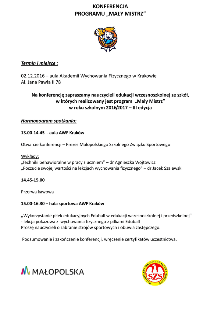 KONFERENCJA PROGRAMU „MAŁY MISTRZ” Termin i miejsce : 02.12.2016 – aula Akademii Wychowania Fizycznego w Krakowie Al. Jana Pawła II 78 Na konferencję zapraszamy nauczycieli edukacji wczesnoszkolnej ze szkół, w których realizowany jest program „Mały Mistrz” w roku szkolnym 2016/2017 – III edycja Harmonogram spotkania: 13.00-14.45 - aula AWF Kraków Otwarcie konferencji – Prezes Małopolskiego Szkolnego Związku Sportowego Wykłady: „Techniki behawioralne w pracy z uczniem” – dr Agnieszka Wojtowicz „Poczucie swojej wartości na lekcjach wychowania fizycznego” – dr Jacek Szalewski 14.45-15.00 Przerwa kawowa 15.00-16.30 – hala sportowa AWF Kraków „Wykorzystanie piłek edukacyjnych Eduball w edukacji wczesnoszkolnej i przedszkolnej” - lekcja pokazowa z wychowania fizycznego z piłkami Eduball Proszę nauczycieli o zabranie strojów sportowych i obuwia zastępczego. Podsumowanie i zakończenie konferencji, wręczenie certyfikatów uczestnictwa.