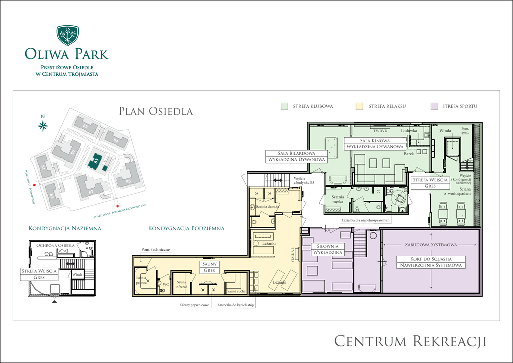 STREFA KLUBOWA Plan Osiedla STREFA RELAKSU TV/DVD STREFA SPORTU Lodówka Winda Pom. gosp. Sala Kinowa Wykładzina Dywanowa Sala Bilardowa Wykładzina Dywanowa Barek Wejście Wejście z budynku B5 Szatnia męska Strefa Wejścia z kondygnacji naziemnej Gres Ściana z wodospadem Szatnia damska Łazienka dla niepełnosprawnych Kondygnacja Naziemna Kondygnacja Podziemna Leżanki Ochrona Osiedla TV/DVD Pom. techniczne Strefa Wejścia Gres Winda Sauny Gres Łaźnia parowa WC Siłownia Wykładzina Zabudowa Systemowa Kort do Squasha Nawierzchnia Systemowa Leżanki Sauna infrared Sauna sucha Kabiny prysznicowe Ławeczka do kąpieli stóp Centrum Rekreacji