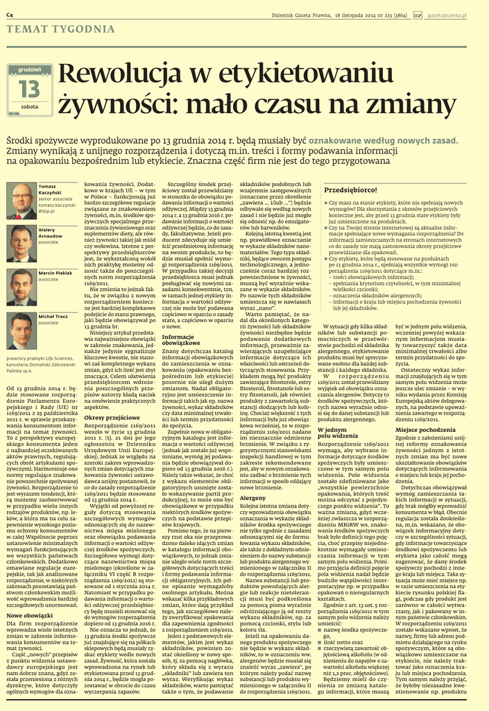 C4 Dziennik Gazeta Prawna, 18 listopada 2014 nr 223 (3864) gazetaprawna.pl t e m at t yg odn i a Rewolucja w etykietowaniu żywności: mało czasu na zmiany Środki spożywcze wyprodukowane po 13 grudnia 2014 r. będą musiały być oznakowane według nowych zasad. Zmiany wynikają z unijnego rozporządzenia i dotyczą m.in. treści i formy podawania informacji na opakowaniu bezpośrednim lub etykiecie. Znaczna część firm nie jest do tego przygotowana Tomasz Kaczyński senior associate tomasz.kaczynski @dzp.pl Walery Arnaudow associate Marcin Pieklak associate Michał Tracz associate prawnicy praktyki Life Sciences, kancelaria Domański Zakrzewski Palinka sp.k. Od 13 grudnia 2014 r. będzie stosowane rozporządzenie Parlamentu Europejskiego i Rady (UE) nr 1169/2011 z 25 października 2011 r. w sprawie przekazywania konsumentom informacji na temat żywności. To z perspektywy europejskiego konsumenta jeden z najbardziej oczekiwanych aktów prawnych, regulujących obrót artykułami spożywczymi. Harmonizuje ono normy regulujące znakowanie powszechnie spożywanej żywności. Rozporządzenie to jest wyrazem tendencji, którą możemy zaobserwować w przypadku wielu innych rodzajów produktów, np. leków, a która ma na celu zapewnienie wysokiego poziomu ochrony konsumentów w całej Wspólnocie poprzez ustanowienie minimalnych wymagań funkcjonujących we wszystkich państwach członkowskich. Dodatkowo omawiane regulacje europejskie, tak jak analizowane rozporządzenie, w niektórych zakresach pozostawiają państwom członkowskim możliwość wprowadzenia bardziej szczegółowych unormowań. Nowe obowiązki Dla firm rozporządzenie wprowadza wiele istotnych zmian w zakresie informowania konsumentów na temat żywności. Część „nowych” przepisów z punktu widzenia ustawodawcy europejskiego jest nam dobrze znana, gdyż została przeniesiona z różnych dyrektyw, które dotyczyły ogólnych wymogów dla ozna- kowania żywności. Dodatkowo w krajach UE – w tym w Polsce – funkcjonują już bardzo szczegółowe regulacje związane ze znakowaniem żywności, m.in. środków spożywczych specjalnego przeznaczenia żywieniowego oraz suplementów diety, ale również żywności takiej jak miód czy wołowina. Istotne z perspektywy przedsiębiorców jest, że wykształconą wokół nich praktykę możemy odnosić także do poszczególnych norm rozporządzenia 1169/2011. Nie zmienia to jednak faktu, że w związku z nowym rozporządzeniem konieczne jest bardziej kompleksowe podejście do stanu prawnego, jaki będzie obowiązywał po 13 grudnia br. Niniejszy artykuł przedstawia najważniejsze obowiązki w zakresie znakowania, jednakże jedynie sygnalizuje kluczowe kwestie, nie stanowi zaś kompletnego wykazu zmian, gdyż ich ilość jest zbyt znacząca. Celem ułatwienia przedsiębiorcom wdrożenia poszczególnych przepisów autorzy kładą nacisk na omówienie praktycznych aspektów. Okresy przejściowe Rozporządzenie 1169/2011 weszło w życie 13 grudnia 2011 r. (tj. 21 dni po jego ogłoszeniu w Dzienniku Urzędowym Unii Europejskiej). Jednak ze względu na szeroki zakres wprowadzonych zmian dotyczących znakowania żywności ustawodawca unijny postanowił, że co do zasady rozporządzenie 1169/2011 będzie stosowane od 13 grudnia 2014 r. Wyjątki od powyższej reguły dotyczą stosowania szczegółowych wymogów odnoszących się do nazewnictwa mięsa mielonego oraz obowiązku podawania informacji o wartości odżywczej środków spożywczych. Szczegółowe wymogi dotyczące nazewnictwa mięsa mielonego (określone w załączniku VI część B rozporządzenia 1169/2011) są stosowane od 1 stycznia 2014 r. Natomiast w przypadku podawania informacji o wartości odżywczej przedsiębiorcy będę musieli stosować się do wymogów rozporządzenia dopiero od 13 grudnia 2016 r. Nie oznacza to jednak, że 13 grudnia środki spożywcze już znajdujące się na półkach sklepowych będą musiały zyskać etykiety wedle nowych zasad. Żywność, która została wprowadzona na rynek lub etykietowana przed 13 grudnia 2014 r., będzie mogła pozostawać w obrocie do czasu wyczerpania zapasów. Szczególny środek przejściowy został przewidziany w stosunku do obowiązku podawania informacji o wartości odżywczej. Między 13 grudnia 2014 r. a 13 grudnia 2016 r. podawanie informacji o wartości odżywczej będzie, co do zasady, fakultatywne. Jeżeli producent zdecyduje się umieścić przedmiotową informację na swoim produkcie, to będzie musiał spełnić wymogi rozporządzenia 1169/2011. W przypadku takiej decyzji przedsiębiorca musi jednak posługiwać się nowymi zasadami konsekwentnie, tzn. w ramach jednej etykiety informacja o wartości odżywczej nie może być podawana częściowo w oparciu o zasady stare, a częściowo w oparciu o nowe. Informacje obowiązkowe Znany dotychczas katalog informacji obowiązkowych do zamieszczenia w oznakowaniu (opakowaniu bezpośrednim lub etykiecie) pozornie nie uległ dużym zmianom. Nadal obligatoryjne jest umieszczenie informacji takich jak np. nazwa żywności, wykaz składników czy data minimalnej trwałości lub termin przydatności do spożycia. Zupełnie nowa w obligatoryjnym katalogu jest informacja o wartości odżywczej (jednak jak zostało już wspomniane, wymóg jej podawania będzie obowiązywał dopiero od 13 grudnia 2016 r.). Należy także wskazać, że choć z wykazu elementów obligatoryjnych usunięte zostało wskazywanie partii produkcyjnej, to może ono być obowiązkowe w przypadku niektórych środków spożywczych na podstawie przepisów krajowych. Pomimo tego, że na pierwszy rzut oka nie przeprowadzono daleko idących zmian w katalogu informacji obowiązkowych, to jednak zmianie uległo wiele norm szczegółowych dotyczących treści i formy podawania informacji obligatoryjnych. Ich pełne opisanie wymagałoby osobnego artykułu. Można wskazać kilka przykładowych zmian, które dają przykład tego, jak szczegółowo nal