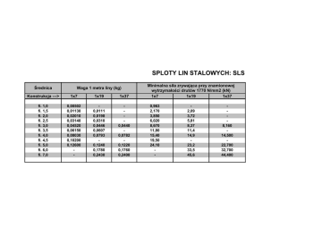 SPLOTY LIN STALOWYCH: SLS Średnica Waga 1 metra liny (kg) Konstrukcja ---> 1x7 1x19 1x37 fi. 1,0 fi. 1,5 fi. 2,0 fi. 2,5 fi. 3,0 fi. 3,5 fi. 4,0 fi. 4,5 fi. 5,0 fi. 6,0 fi. 7,0 0,00502 0,01130 0,02010 0,03140 0,04520 0,06150 0,08030 0,10200 0,12600 - 0,0111 0,0198 0,0310 0,0446 0,0607 0,0793 0,1240 0,1780 0,2430 0,0440 0,0782 0,1220 0,1760 0,2400 Minimalna siła zrywająca przy znamionowej wytrzymałości drutów 1770 N/mm2 (kN) 1x7 1x19 1x37 0,963 2,170 3,850 6,020 8,670 11,80 15,40 19,50 24,10 - 2,09 3,72 5,81 8,37 11,4 14,9 23,2 33,5 45,6 8,160 14,500 22,700 32,700 44,400 LINY Z RDZENIEM Z WŁÓKNA: LSO +Ao Średnica Waga 1 metra liny (kg) Konstrukcja ---> 6x7 6x19 6x37 fi. 1,8 fi. 2,0 fi. 2,5 fi. 3,0 fi. 4,0 fi. 5,0 fi. 6,0 fi. 7,0 fi. 8,0 fi. 9,0 fi. 10,0 fi. 11,0 fi. 12,0 fi. 13,0 fi. 14,0 fi. 16,0 fi. 18,0 fi. 20,0 fi. 22,0 fi. 24,0 fi. 26,0 fi. 28,0 fi. 32,0 0,0100 0,0143 0,0220 0,0322 0,0572 0,0894 0,1290 0,1750 0,2290 0,2890 0,3570 0,4320 0,5150 0,6040 0,7010 - 0,0311 0,0554 0,0865 0,1250 0,1700 0,2210 0,2800 0,3460 0,4190 0,4980 0,5850 0,6780 0,8860 1,1200 1,3800 1,6700 1,9900 - 0,221 0,280 0,346 0,419 0,498 0,585 0,678 0,886 1,120 1,380 1,670 1,990 2,340 2,710 3,540 Minimalna siła zrywająca przy znamionowej wytrzymałości drutów 1770 N/mm2 (kN) 6x7 6x19 6x37 1,900 2,350 3,700 5,290 9,410 14,70 21,10 28,80 37,60 47,60 58,80 71,10 84,70 99,40 115,0 - 4,900 8,700 13,60 19,60 26,70 34,80 44,10 54,40 65,80 78,30 91,90 107,0 139,0 176,0 218,0 263,0 313,0 - 33,40 42,30 52,20 63,10 75,10 88,20 102,0 134,0 169,0 209,0 253,0 301,0 353,0 409,0 534,0 LINY Z RDZENIEM STALOWYM: LSO +At Średnica Waga 1 metra liny (kg) Konstrukcja ---> 6x7 6x19 6x37 fi. 1,8 fi. 2,0 fi. 2,5 fi. 3,0 fi. 4,0 fi. 5,0 fi. 6,0 fi. 7,0 fi. 8,0 fi. 9,0 fi. 10,0 fi. 11,0 fi. 12,0 fi. 13,0 fi. 14,0 fi. 16,0 fi. 18,0 fi. 20,0 fi. 22,0 fi. 24,0 fi. 26,0 fi. 28,0 fi. 32,0 0,0130 0,0157 0,0245 0,0354 0,0629 0,0983 0,1420 0,1930 0,2520 0,3180 0,3930 0,4750 0,5670 0,6640 0,7710 - 0,0342 0,0609 0,0952 0,1380 0,1870 0,2430 0,3080 0,3810 0,4610 0,5480 0,6430 0,7460 0,9740 1,2300 1,5200 1,8400 2,1900 - 0,244 0,308 0,381 0,461 0,548 0,643 0,746 0,974 1,230 1,520 1,840 2,190 3,570 2,980 3,900 Minimalna siła zrywająca przy znamionowej wytrzymałości drutów 1770 N/mm2 (kN) 6x7 6x19 6x37 2,060 2,540 3,970 5,710 10,20 15,90 22,90 31,10 40,60 51,40 63,50 76,80 91,50 107,0 124,0 - 5,290 9,400 14,70 21,20 28,80 37,60 47,60 58,80 71,10 84,60 99,30 115,0 150,0 190,0 235,0 284,0 338,0 - 36,10 45,70 56,40 68,20 81,20 95,20 110,0 144,0 183,0 225,0 273,0 325,0 381,0 442,0 577,0 LINY STALOWE DŹWIGOWE: LSO WS Waga 1 metra liny (kg) Średnica Konstrukcja ---> fi. 8,0 fi. 9,0 fi. 10,0 fi. 11,0 fi. 12,0 fi. 13,0 fi. 14,0 fi. 16,0 fi. 18,0 fi. 20,0 fi. 22,0 fi. 24,0 fi. 26,0 fi. 28,0 Rdzeń z włókna 6x36 6x31 Rdzeń stalowy 6x36 6x31 0,250 0,310 0,390 0,470 0,547 0,643 0,745 0,973 1,230 1,520 1,840 2,190 2,570 2,980 0,270 0,340 0,420 0,510 0,602 0,707 0,820 1,070 1,350 1,670 2,020 2,410 2,830 3,280 0,231 0,292 0,361 0,437 0,520 0,610 0,708 0,924 1,170 1,444 1,747 2,079 - 0,255 0,322 0,398 0,482 0,573 0,673 0,780 1,019 1,290 1,592 1,926 2,292 - Minimalna siła zrywająca przy znamionowe wytrzymałości drutów 1770 N/mm2 Rdzeń z włókna Rdzeń stalowy 6x36 6x31 6x36 6x31 37,4 47,3 58,4 70,6 84,0 98,3 114,0 149,0 189,0 234,0 282,0 336,0 395,0 458,0 37,4 47,3 58,4 70,7 84,1 98,7 114,5 149,5 189,2 233,6 282,7 336,4 - 40,4 51,1 63,1 76,3 89,9 106,0 124,0 161,0 204,0 252,0 304,0 363,0 425,0 493,0 40,3 51,0 63,0 76,2 90,7 106,5 123,5 161,3 204,2 252,0 305,0 362,9 - LINY STALOWE SPECJALNE: LSO S Waga 1 metra liny (kg) Średnica Rdzeń ---> fi. 6,0 fi. 7,0 fi. 8,0 fi. 9,0 fi. 10,0 fi. 11,0 fi. 12,0 fi. 13,0 fi. 14,0 fi. 15,0 fi. 16,0 fi. 17,0 fi. 18,0 fi. 19,0 fi. 20,0 fi. 22,0 fi. 24,0 fi. 26,0 FILLER 6x19 z włókna stalowy 0,380 0,460 0,574 0,643 0,745 0,855 0,973 1,100 1,230 1,370 1,520 1,840 2,190 2,570 0,418 0,506 0,602 0,820 0,941 1,070 1,210 1,350 1,510 1,670 2,020 2,410 2,830 SEAL 6x19 z włókna stalowy 0,134 0,183 0,238 0,302 0,373 0,451 0,537 0,630 0,730 0,838 0,954 1,080 1,210 1,350 1,490 1,800 - 0,147 0,201 0,262 0,332 0,410 0,496 0,590 0,693 0,803 0,922 1,050 1,190 1,330 1,490 0,164 0,198 - Minimalna siła zrywająca przy znamionowe wytrzymałości drutów 1770 N/mm2 FILLER 6x19 SEAL 6x19 z włókna stalowy z włókna stalowy 59,8 72,3 86,1 101,0 117,0 135,0 153,0 173,0 194,0 216,0 239,0 289,0 344,0 404,0 64,6 78,1 93,0 127,0 145,0 165,0 187,0 209,0 233,0 258,0 312,0 372,0 436,0 21,1 28,7 37,5 47,4 58,6 70,9 84,3 99,0 115,0 132,0 160,0 169,0 190,0 211,0 234,0 284,0 - 22,8 31,0 40,5 51,2 63,3 76,5 91,1 107,0 124,0 142,0 162,0 183,0 205,0 228,0 253,0 306,0 -
