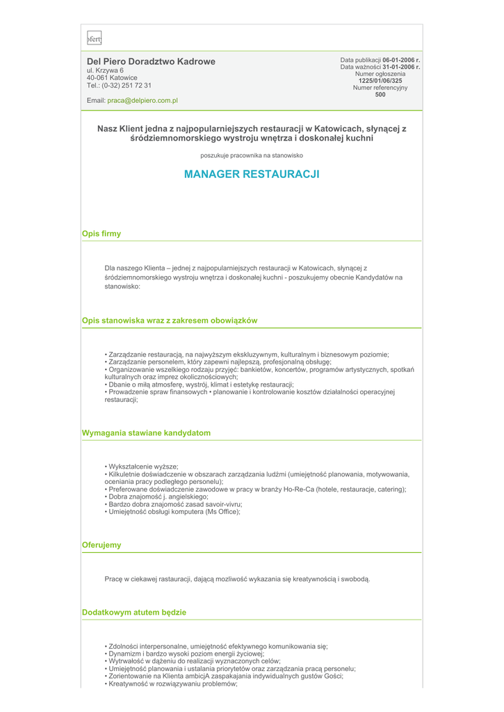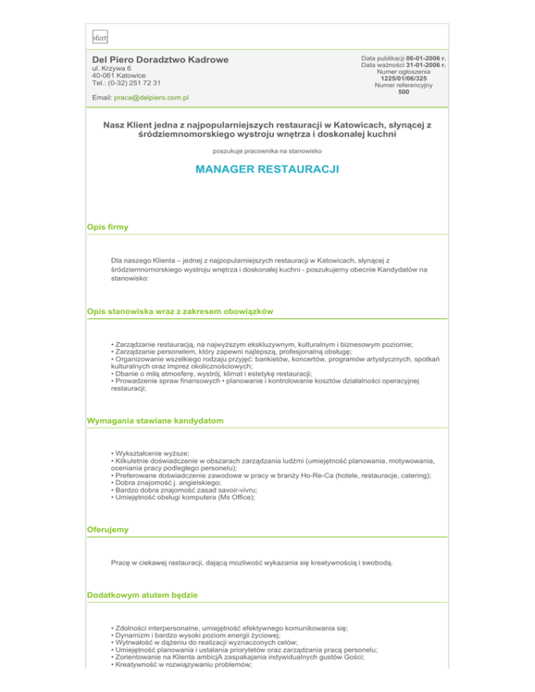 praca, oferty pracy Del Piero Doradztwo Kadrowe ul. Krzywa 6 40-061 Katowice Tel.: (0-32) 251 72 31 Email: [email protected] Data publikacji 06-01-2006 r. Data ważności 31-01-2006 r. Numer ogłoszenia 1225/01/06/325 Numer referencyjny 500 Nasz Klient jedna z najpopularniejszych restauracji w Katowicach, słynącej z śródziemnomorskiego wystroju wnętrza i doskonałej kuchni poszukuje pracownika na stanowisko MANAGER RESTAURACJI Opis firmy Dla naszego Klienta – jednej z najpopularniejszych restauracji w Katowicach, słynącej z śródziemnomorskiego wystroju wnętrza i doskonałej kuchni - poszukujemy obecnie Kandydatów na stanowisko: Opis stanowiska wraz z zakresem obowiązków • Zarządzanie restauracją, na najwyższym ekskluzywnym, kulturalnym i biznesowym poziomie; • Zarządzanie personelem, który zapewni najlepszą, profesjonalną obsługę; • Organizowanie wszelkiego rodzaju przyjęć: bankietów, koncertów, programów artystycznych, spotkań kulturalnych oraz imprez okolicznościowych; • Dbanie o miłą atmosferę, wystrój, klimat i estetykę restauracji; • Prowadzenie spraw finansowych • planowanie i kontrolowanie kosztów działalności operacyjnej restauracji; Wymagania stawiane kandydatom • Wykształcenie wyższe; • Kilkuletnie doświadczenie w obszarach zarządzania ludźmi (umiejętność planowania, motywowania, oceniania pracy podległego personelu); • Preferowane doświadczenie zawodowe w pracy w branży Ho-Re-Ca (hotele, restauracje, catering); • Dobra znajomość j. angielskiego; • Bardzo dobra znajomość zasad savoir-vivru; • Umiejętność obsługi komputera (Ms Office); Oferujemy Pracę w ciekawej rastauracji, dającą mozliwość wykazania się kreatywnością i swobodą. Dodatkowym atutem będzie • Zdolności interpersonalne, umiejętność efektywnego komunikowania się; • Dynamizm i bardzo wysoki poziom energii życiowej; • Wytrwałość w dążeniu do realizacji wyznaczonych celów; • Umiejętność planowania i ustalania priorytetów oraz zarządzania pracą personelu; • Zorientowanie na Klienta ambicjA zaspakajania indywidualnych gustów Gości; • Kreatywność w rozwiązywaniu problemów; • Wysoki poziom estetyki, wyczucie kulturalne i biznesowe • Kreatywność w rozwiązywaniu problemów; • Wysoki poziom estetyki, wyczucie kulturalne i biznesowe Forma kontaktu Zainteresowane osoby, spełniające powyższe wymagania prosimy o przesłanie aplikacji w języku polskim na adres e-mail: [email protected]. Prosimy w tytule e-maila wpisać nr ref. 500. Informacje dodatkowe Minimalne wykształcenie: wyższe Branża: Hotele i Restauracje Forma zatrudnienia: umowa o pracę Wymiar pracy: pełny etat Wynagrodzenie (netto): nie podano Lokalizacja: Polska Województwo: śląskie, Miejsce pracy miasto(a) lub kraj(e): Katowice Prawo jazdy: tak Znajomość języka obcego: tak Ogłoszenie pochodzi z portalu www.i-praca.pl - Internetowy Portal Pracy ilość wyświetleń: 6188