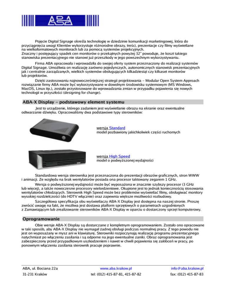 Pojęcie Digital Signage określa technologię w dziedzinie komunikacji marketingowej, która do przyciągnięcia uwagi Klientów wykorzystuje różnorodne obrazy, treści, prezentacje czy filmy wyświetlane na wielkoformatowych monitorach lub za pomocą systemów projekcyjnych. Znaczny i postępujący spadek cen monitorów o przekątnych powyżej 32” powoduje, że koszt takiego stanowiska prezentacyjnego nie stanowi już przeszkody w jego powszechnym wykorzystywaniu. Firma ABA opracowała i wprowadziła do swojej oferty system przeznaczony do realizacji systemów Digital Signage. Umożliwia on realizację zarówno pojedynczych, autonomicznych stanowisk prezentacyjnych jak i centralnie zarządzanych, wielkich systemów obsługujących kilkadziesiąt czy kilkaset monitorów lub projektorów. Dzięki zastosowaniu najnowocześniejszej strategii projektowania – Modular Open System Approach rozwiązanie firmy ABA może być wykorzystywane w dowolnym środowisku systemowym (MS Windows, MacOS, Linux itp.), zostało przystosowane do wprowadzania zmian w przypadku pojawienia się nowych technologii w przyszłości (designing for change). ABA-X Display – podstawowy element systemu Jest to urządzenie, którego zadaniem jest wyświetlanie obrazu na ekranie oraz ewentualne odtwarzanie dźwięku. Opracowaliśmy dwa podstawowe typy sterowników: wersja Standard model pozbawiony jakichkolwiek części ruchomych wersja High Speed model o podwyższonej wydajności Standardowa wersja sterownika jest przeznaczona do prezentacji obrazów graficznych, stron WWW i animacji. Ze względu na brak wentylatorów posiada ona procesor taktowany zegarem 1 GHz. Wersja o podwyższonej wydajności może być wyposażona w znacznie szybszy procesor (3 GHz lub więcej), a także nowoczesne procesory wielordzeniowe. Okupione jest to jednak koniecznością stosowania wentylatorów chłodzących. Sterownik High Speed może bez problemów wyświetlać filmy, obsługiwać monitory wysokiej rozdzielczości (do HDTV włącznie) oraz zapewnia większe możliwości rozbudowy. Szczegółowa specyfikacja obu wyświetlaczy ABA-X Display jest dostępna na naszej stronie. Proszę zwrócić uwagę na fakt, że możliwa jest dostawa platform sprzętowych o parametrach uzgodnionych z Zamawiającym lub zrealizowanie sterowników ABA-X Display w oparciu o dostarczony sprzęt komputerowy. Oprogramowanie Obie wersje ABA-X Display są dostarczane z kompletnym oprogramowaniem. Zostało ono opracowane w taki sposób, aby ABA-X Display nie wymagał żadnej obsługi podczas normalnej pracy. Z tego powodu nie jest on wyposażany w mysz ani w klawiaturę. Sterowniki rozpoczynają realizację programu prezentacyjnego natychmiast po włączeniu zasilania i są odporne na jego ewentualne zaniki. Obraz oprogramowania jest zabezpieczony przed przypadkowym uszkodzeniem i nawet w chwili pojawienia się zakłóceń w pracy, po ponownym włączeniu zasilania sterownik pracuje poprawnie. ABA, ul. Bociana 22a 31-231 Kraków www.aba.krakow.pl [email protected] tel: (012) 415-87-81, 415-87-82 fax: (012) 415-87-83 Podstawowe funkcje oprogramowania • • • • • • • • • realizacja podziału ekranu na niezależne fragmenty wraz z możliwością wprowadzenia wielu bannerów informacyjnych i reklamowych, obsługa trybu „pejzaż” oraz „portret” (pozioma lub pionowa orientacja ekranu), realizacja programów czasowych z możliwością wprowadzenia programów dziennych, tygodniowych i miesięcznych z możliwością wykorzystywania sieciowej synchronizacji czasu (protokół NTP), wyświetlanie obrazów w wielu (ponad 20 w wersji podstawowej) standardowych formatach graficznych, animacja wyświetlanych obrazów graficznych, wyświetlanie stron WWW z obsługą JAVA oraz Macromedia Flash, wyświetlanie filmów (w pełnej rozdzielczości tylko wersja High Speed), odtwarzanie dźwięku z obsługą plików MP3 (realizacja „Background Music) oraz PlayList włącznie, współpraca z systemami alarmowo/informacyjnymi (priorytetowe wyświetlanie informacji oraz odtwarzanie towarzyszących sygnałów dźwiękowych). Unikalną cechą ABA-X Display jest możliwość wprowadzania dodatkowych modułów programowych – np. liczników osób, detekcji ruchu itp., które mogą działać „w tle”, bez wpływu na realizację podstawowych funkcji urządzenia. Programy takie mogą być również opracowane na zlecenie i zgodnie z wymaganiami Zamawiającego. Dostęp do treści prezentacji Urządzenia ABA-X Display zaprojektowano w taki sposób, aby było możliwe korzystanie z różnych źródeł prezentacji: • lokalna wewnętrzna pamięć FLASH umożliwia w pełni autonomiczną i bezobsługową pracę urządzenia np. podczas imprez targowych. Tak skonfigurowane urządzenia ABA-X Display obsługiwały między innymi stoiska na targach CeBIT 2007. • wewnętrzny dysk twardy (w zależności od platformy sprzętowej) rozszerza możliwości pracy autonomicznej dzięki znacznie większej pojemności, a tym samym możliwości przechowywania dużej liczby zaawansowanych prezentacji. • wbudowany napęd CD/DVD (tylko platforma High Speed) zapewnia bezpośrednie odtwarzanie treści (grafika, film, muzyka itp.) dostarczanych na tych nośnikach. dołączana pamięć FLASH oraz inne dołączane urządzenia typu USB Storage, serwery w sieci komputerowej obsługujące protokoły X Window, RDP, FTP i HTTP ABA-X Display mogą pobierać treść z serwerów bez potrzeby jej lokalnego trwałego zapisu. Sam proces pobierania treści jest niezauważalny na monitorze. Obsługa protokołów X Window (UNIX/LINUX) oraz RDP (Microsoft Remote Desktop Protocol) umożliwia wyświetlanie przez ABA- X Display programów wykonywanych na serwerach MS Windows lub LINUX/UNIX. • • Zarządzanie pracą sterownika ABA-X Display Zarządzanie ABA-X Display może odbywać się: • lokalnie po podłączeniu klawiatury Administrator może korzystać z konsoli systemowej lub wykorzystać do zarzą